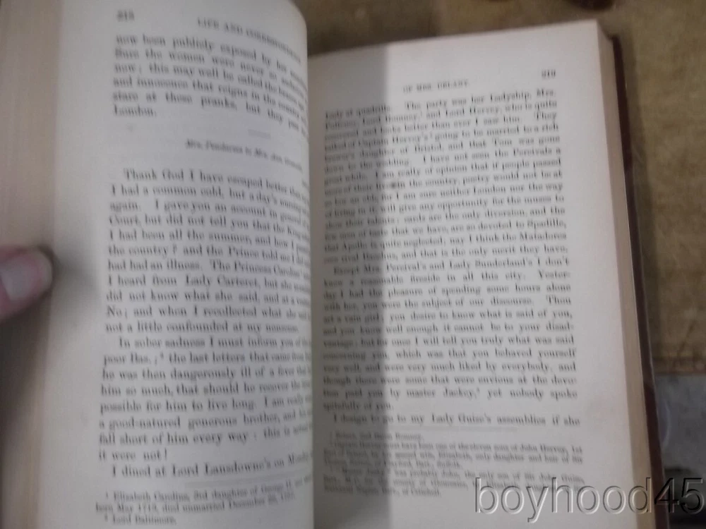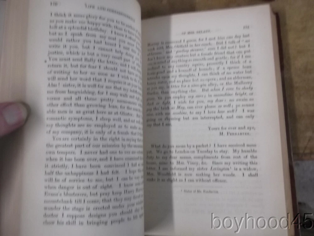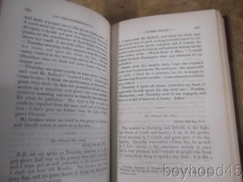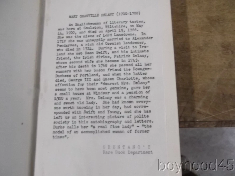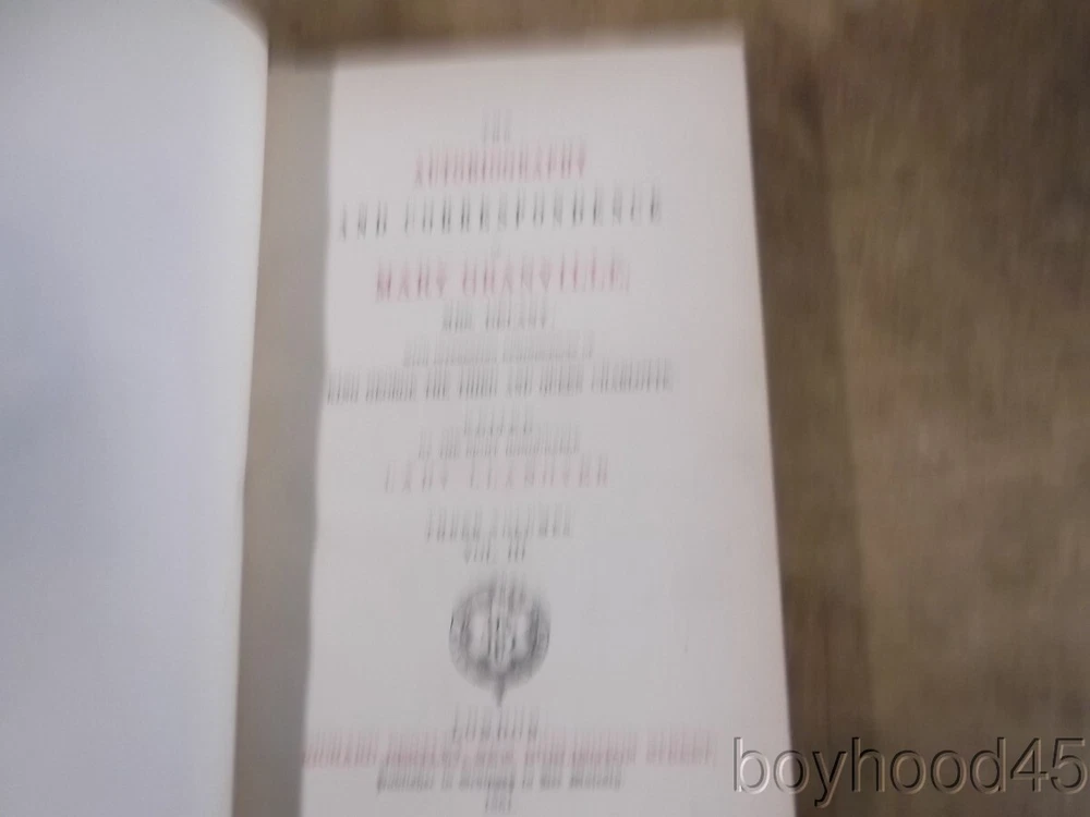 The Autobiography & Correspondence of Mary Granville, 3 Vols., LEATHER, 1861 The Autobiography & Correspondence of Mary Granville, 3 Vols., LEATHER, 1861 Click images to enlarge Description This is "The Autobiography and Correspondence of Mary Granville, Mrs. Delany: With Interesting Reminiscences of King George the Third and Queen Charlotte," edited by Lady Llanover. FIRST SERIES, PUBLISHED IN THREE VOLUMES. Published by Richard Bentley, London, 1861. First Edition. Bound in half leather. Shows light edgewear to head of spine area of Vol. I, light general wear--a Very Good set. Clean, tight, complete. Books measure 5 3/4 X 8 3/8, each volume over 600 pages. A SCARCE FEW copies of this set can be found on other internet booksites for upwards of $275, with individual volumes being offered for upwards of $86 EACH!!! I will offer this lovely 3-volume set for only $115 plus $10.00 S&H in the US. (Rm 2, L, Case 5, Shelf 2) Condition Notes: A clean and lightly-worn set!! Payment Paypal Shipping Domestic shipping: Fixed Shipping Charges. International shipping: Fixed Shipping Charges. Shipping Carrier Domestic International Shipping Locations Usps Book Rate $10.00 - - Usps Priority Intl - $90.00 Worldwide I will ship to: United States, Worldwide Vendio Images: More than just a pretty image. 250+ Mobile Responsive & Active Content Free Listing Templates with Vendio Sales Manager. Vendio provides powerful selling automation for sellers of all sizes. Get business information that counts! - Vendio Counters are active content free.