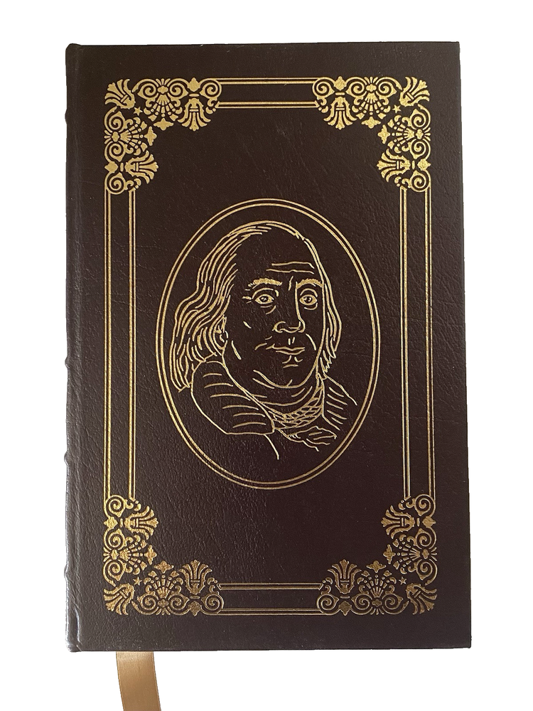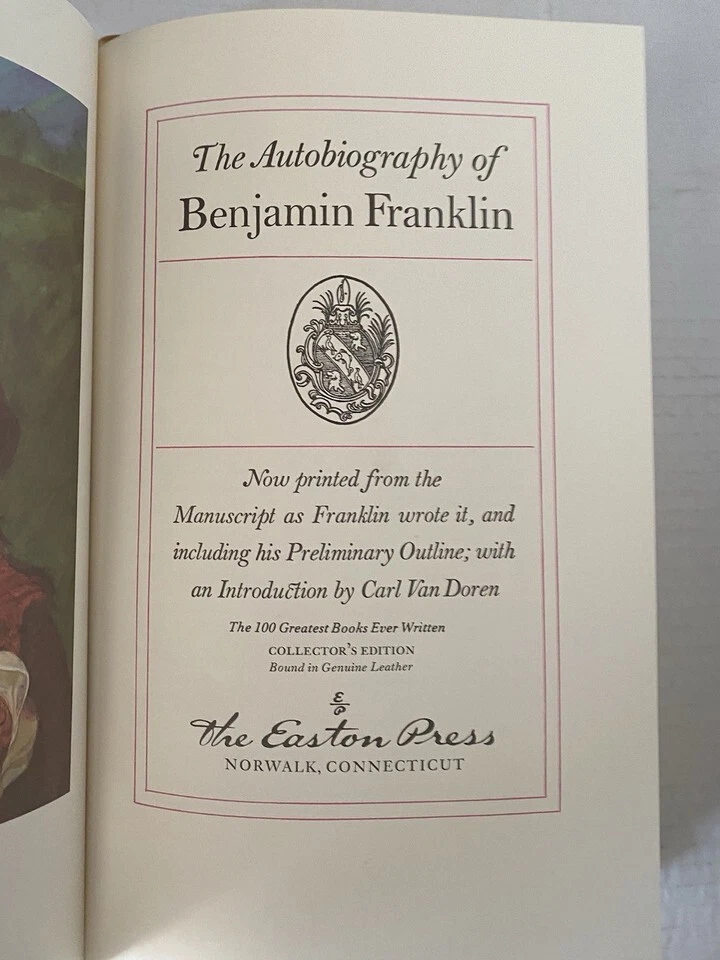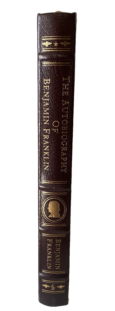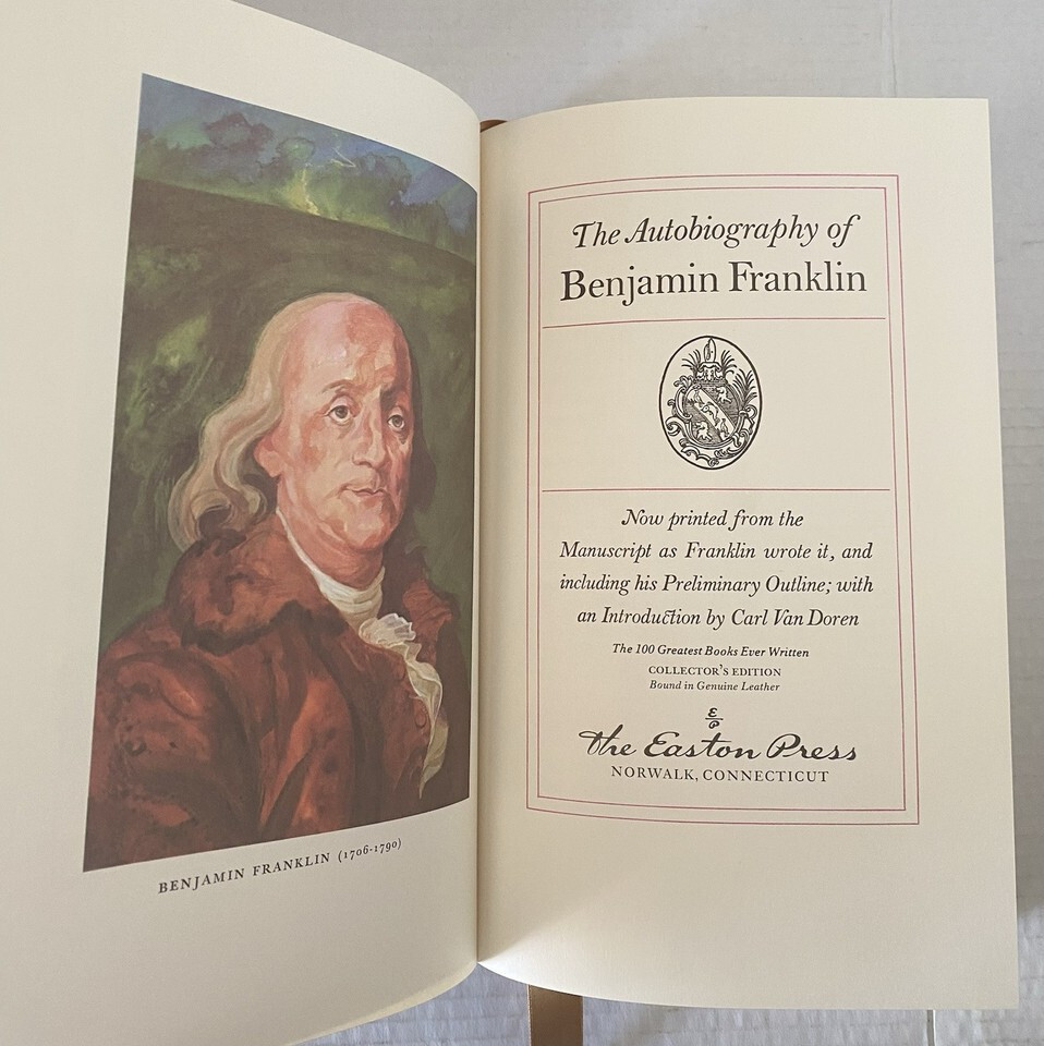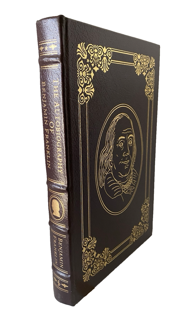 The product is an illustrated leather-bound autobiography of Benjamin Franklin published by Easton Press in Norwalk, Connecticut in 2004. This collector's edition is part of the 100 greatest books series and is considered a luxury edition. The autobiography is a limited edition original print in English, featuring special attributes such as being personalized and historically significant. It is a valuable addition to any collection of antiquarian and collectible books.