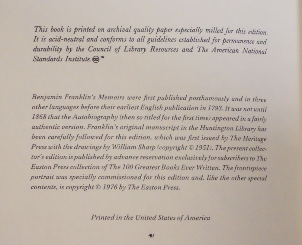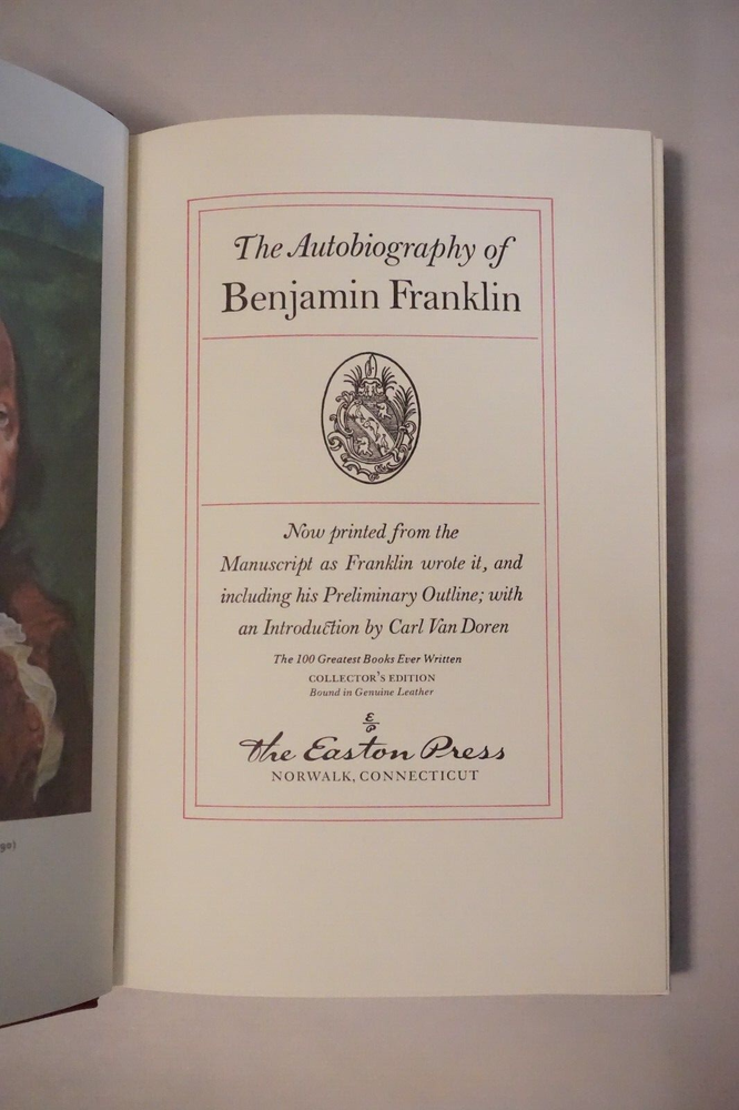 Wonderful vintage copy of The Autobiography of Benjamin Franklin. Published in Easton Press of Norwalk, Connecticut. The leatherbound book is in good condition for its age, with some wear to the cover and edges. There is some discoloration to the front and back covers (see photos). Great find at a great price! Please note the S&H charges, which include USPS postage, materials, and handling. Pictured bookends are not included in the sale. View our other eBay listings at Weiss Lane Books! https://www.ebay.com/str/Weiss-Lane-Books