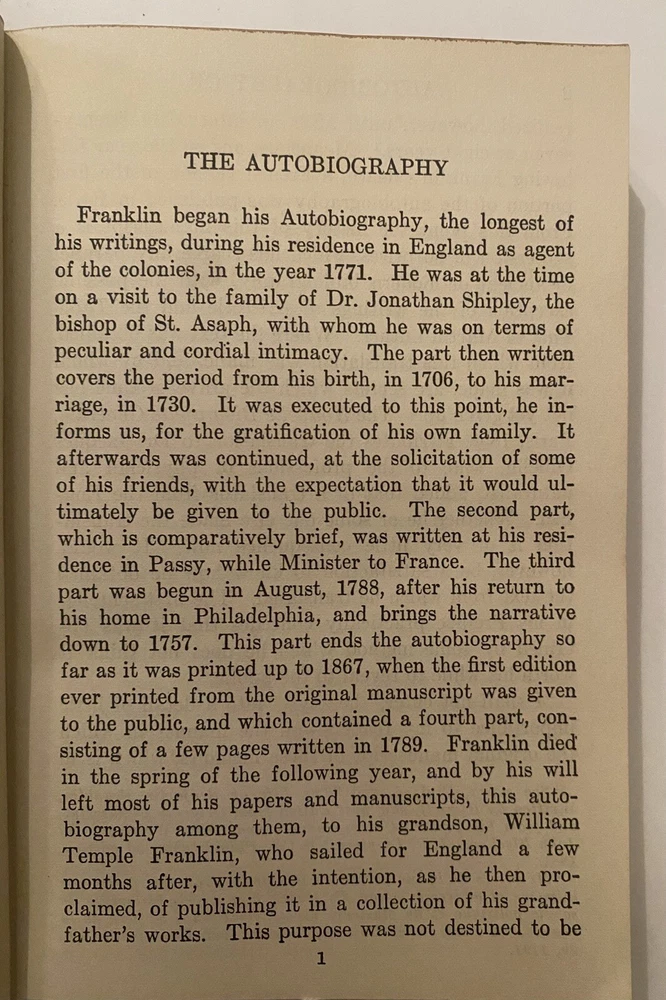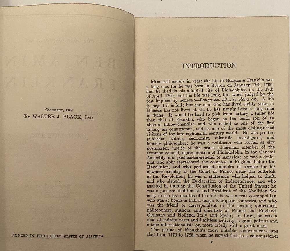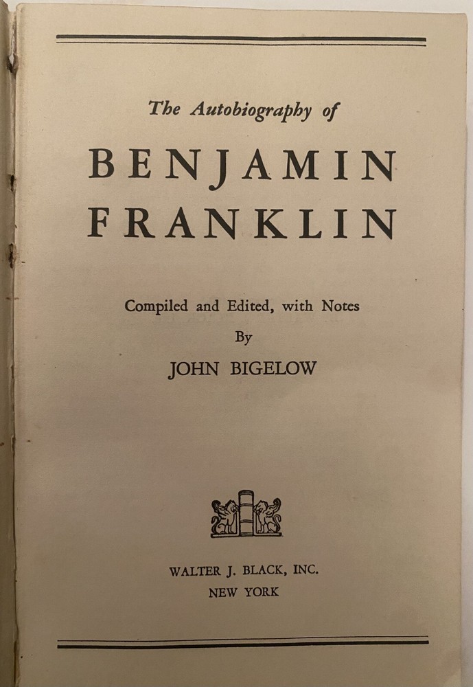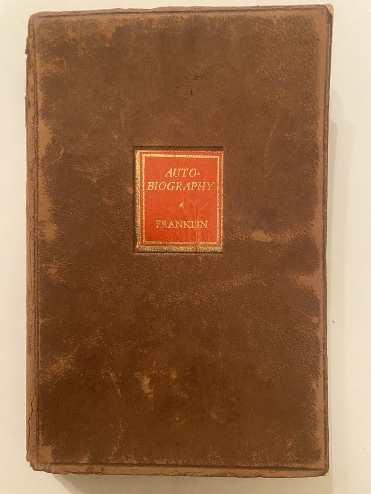 1932 The Autobiography Of Benjamin Franklin Leather by John Bigelow Printing by Walter J. Black Very Rare Cover and back show VG Pages are beautiful and crisp the outside Binding shows wear at top and name Binding looks okay to me opening and back have buckles as shown in picture