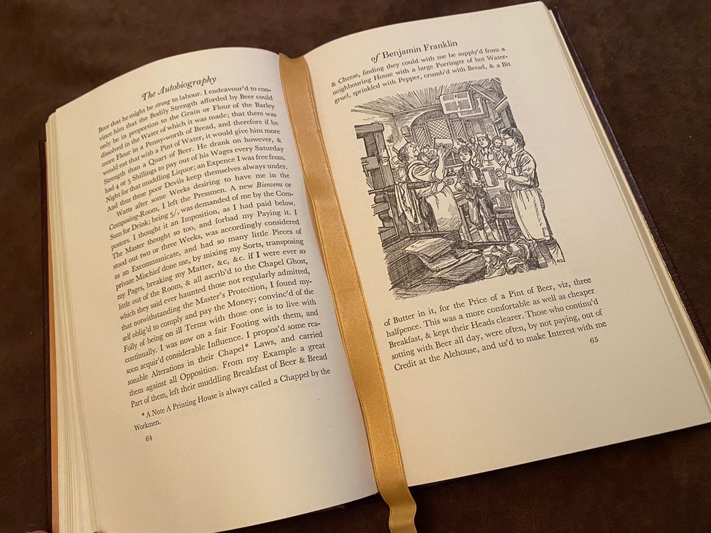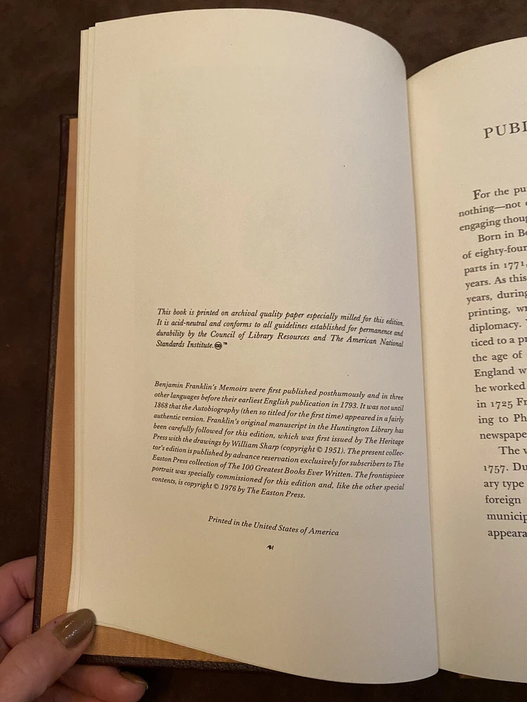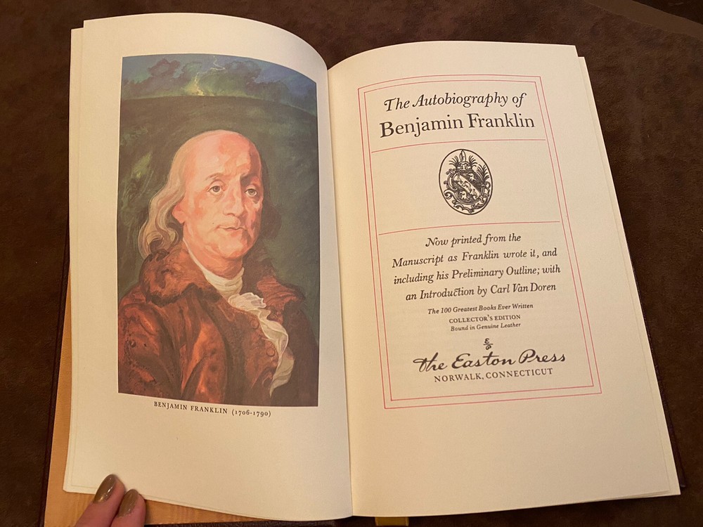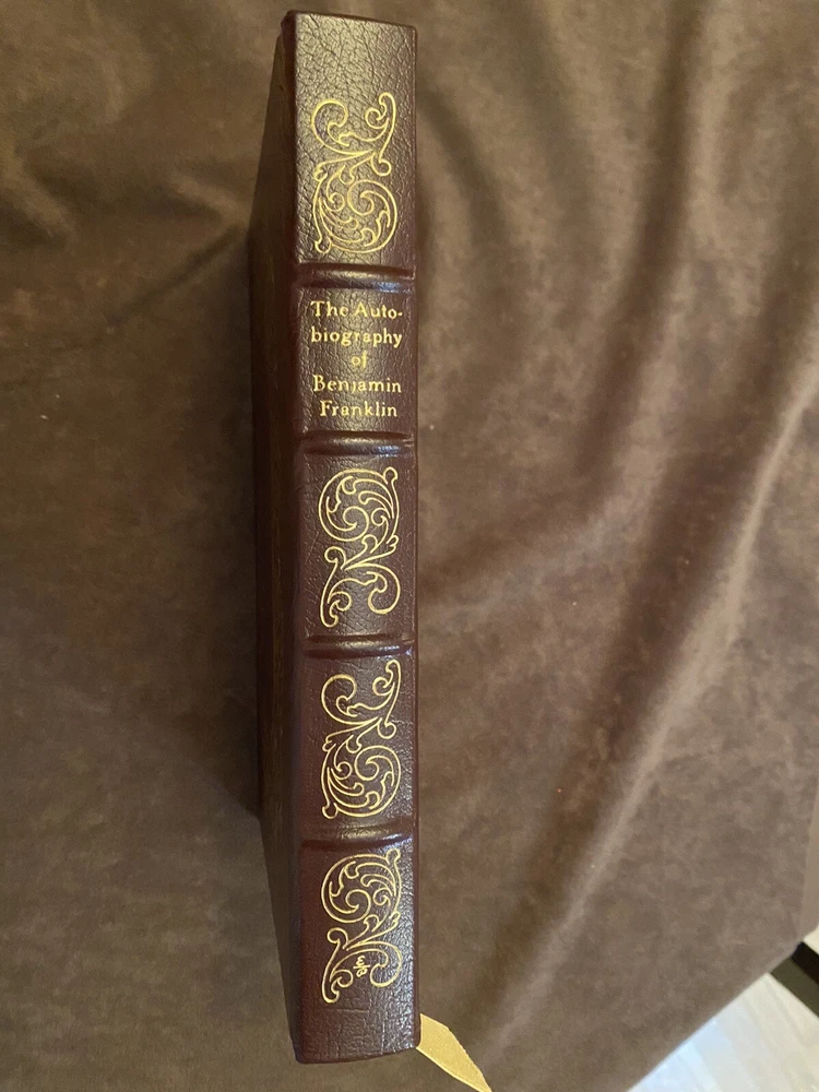 The Autobiography of Benjamin Franklin -Collector’s Edition - Easton Press 1976. This Easton Press edition is in VG condition, and also includes some lovely illustrations by William Sharp, who did extensive research to authentically portray the life and times in which Franklin lived. You may or may not know that Easton Press books are printed on fine quality acid-free paper, which is very resistant to deterioration. They are bound in leather, feature moire silk end papers, a silk ribbon bookmarker , and outer pages are edged in gold. They are durable and lasting works of art! The only flaw on this particular copy is a personal inscription. See photos!