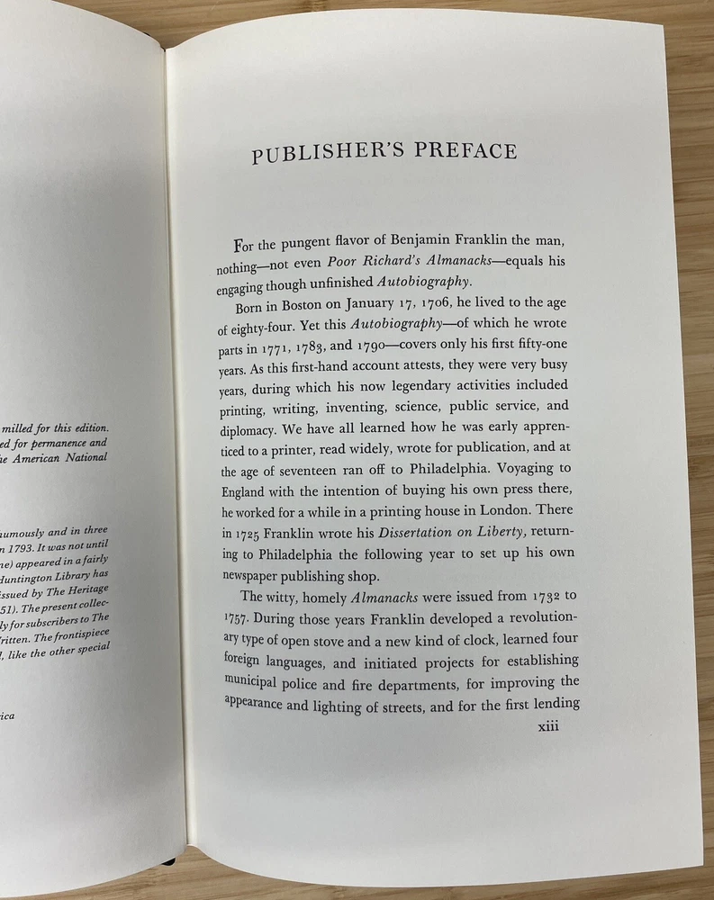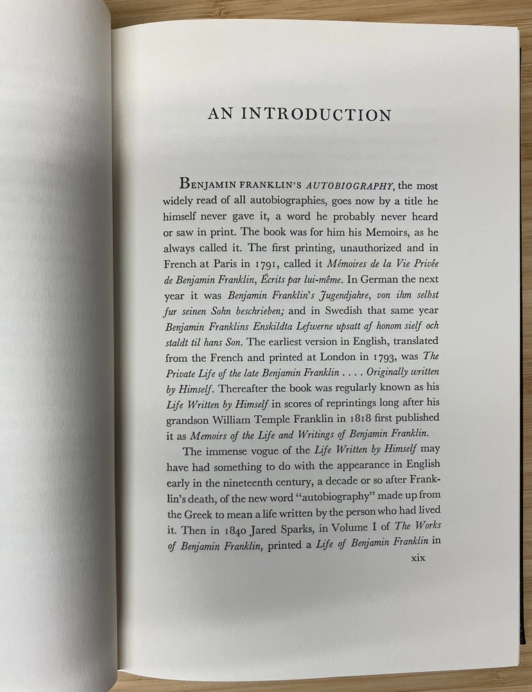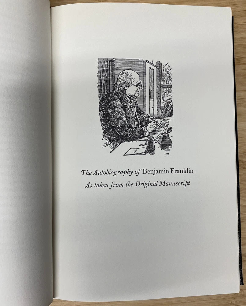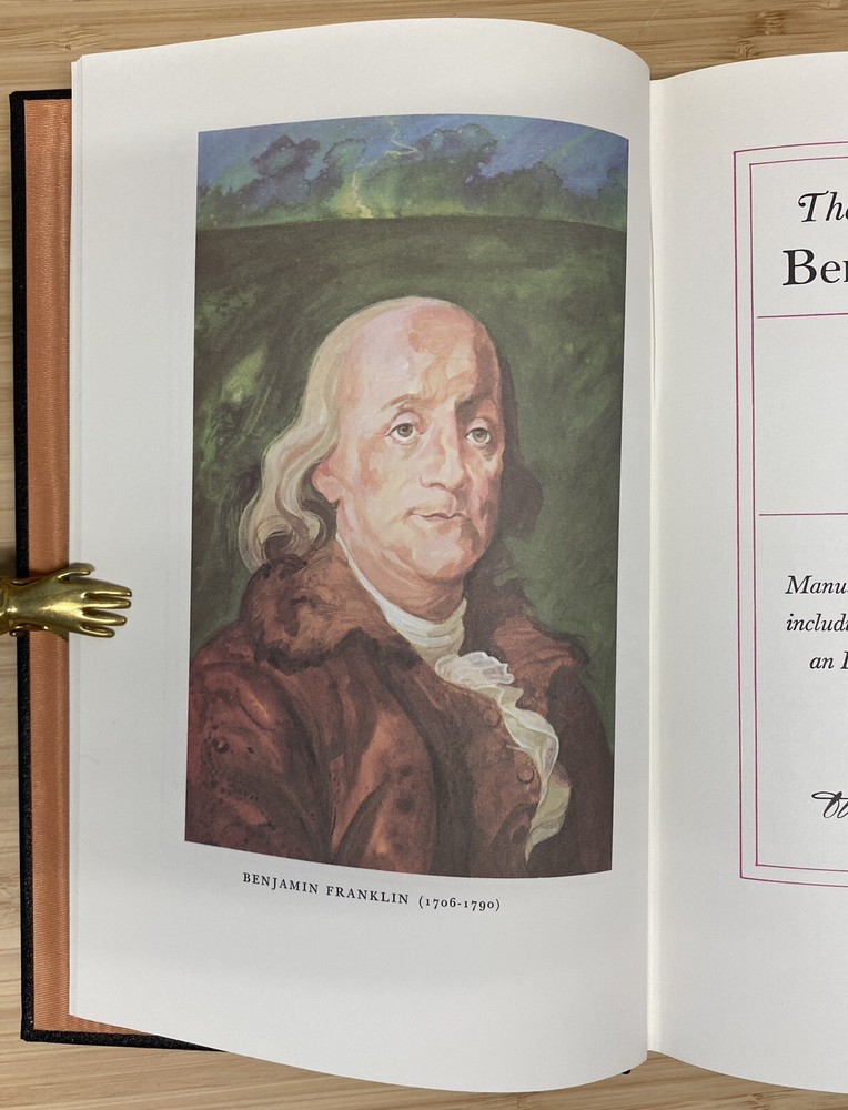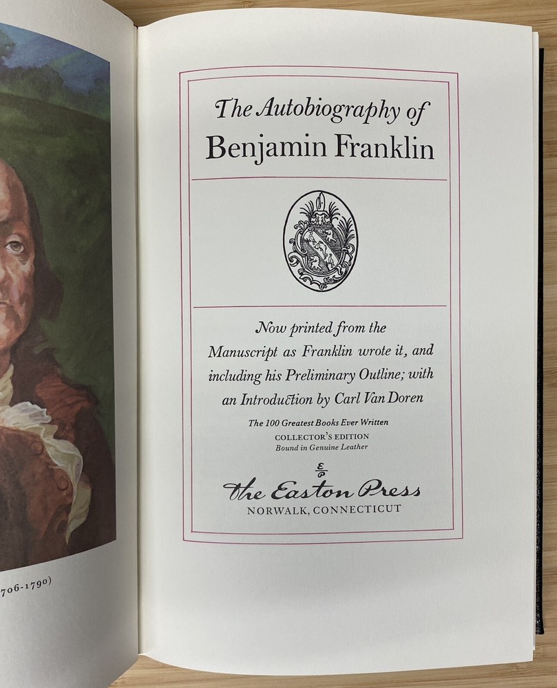 For Sale: " The Autobiography of Benjamin Franklin " By Benjamin Franklin Published: by The Easton Press Approx Dimensions: 6 3/4" x 10 1/4" Pages: 233 Description: This Collector's Edition bound in genuine leather by the Easton Press is in excellent condition. Clean unmarked pages and excellent binding and hinges. Previous owners ex-libris label affixed to inside of front cover. (loc2d)