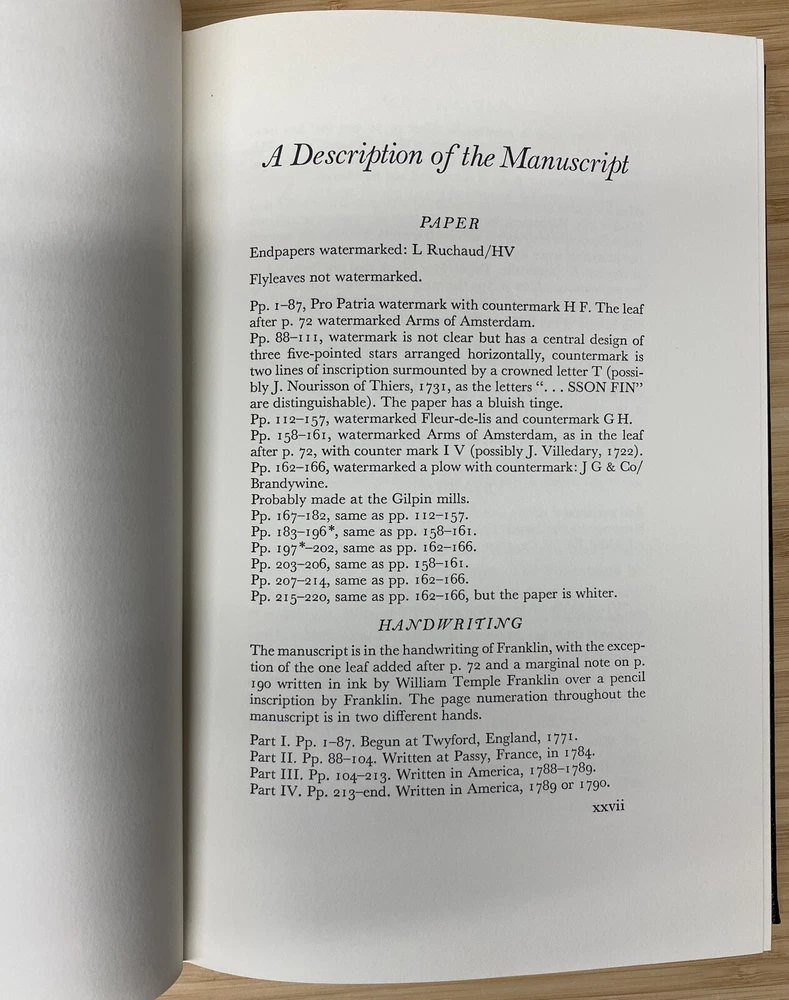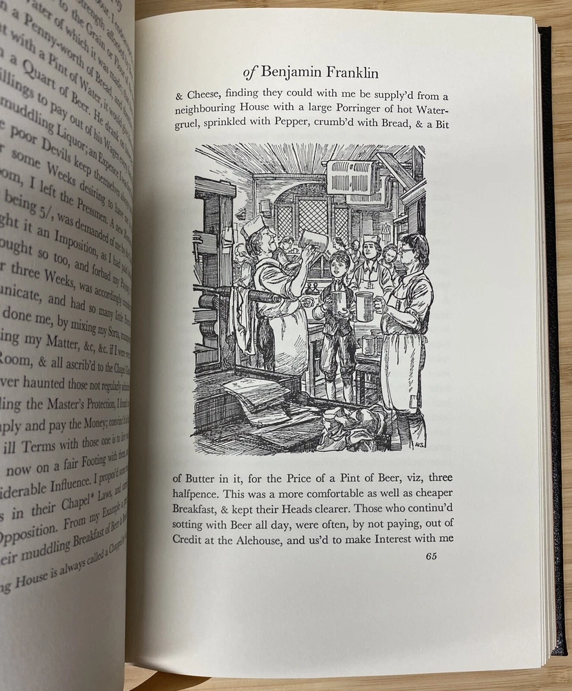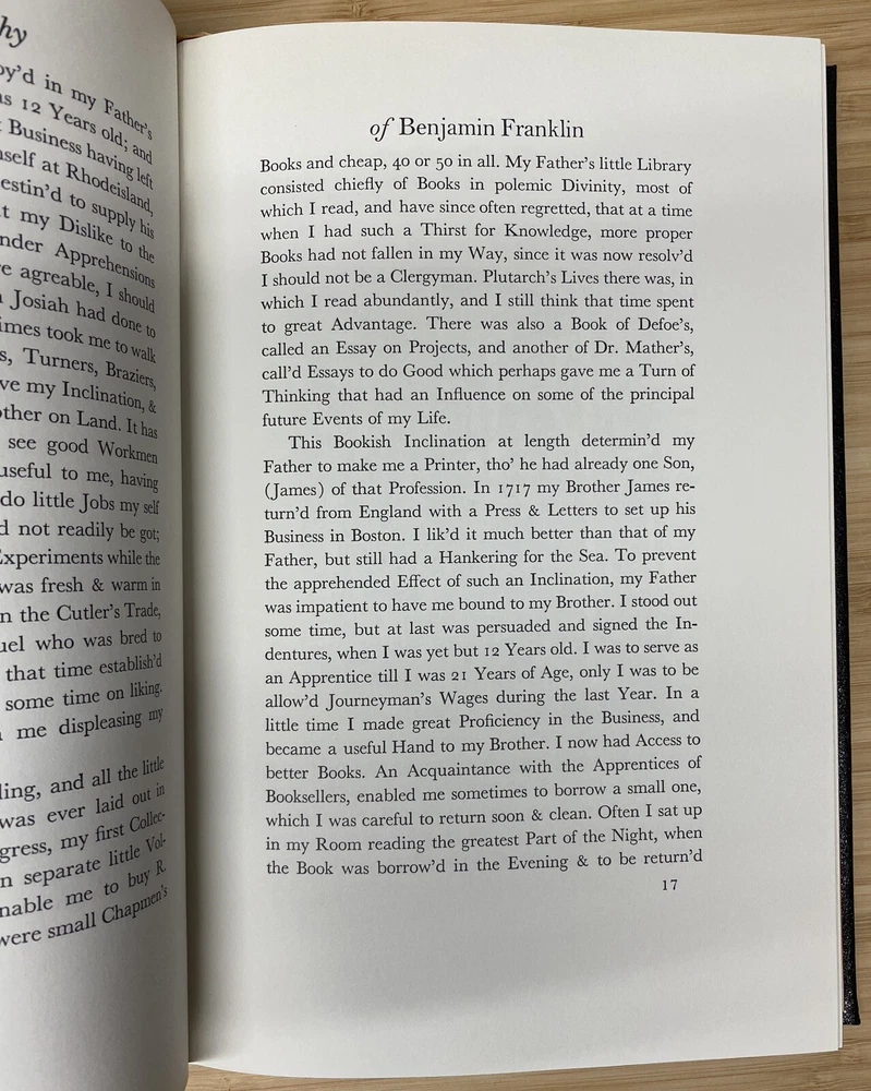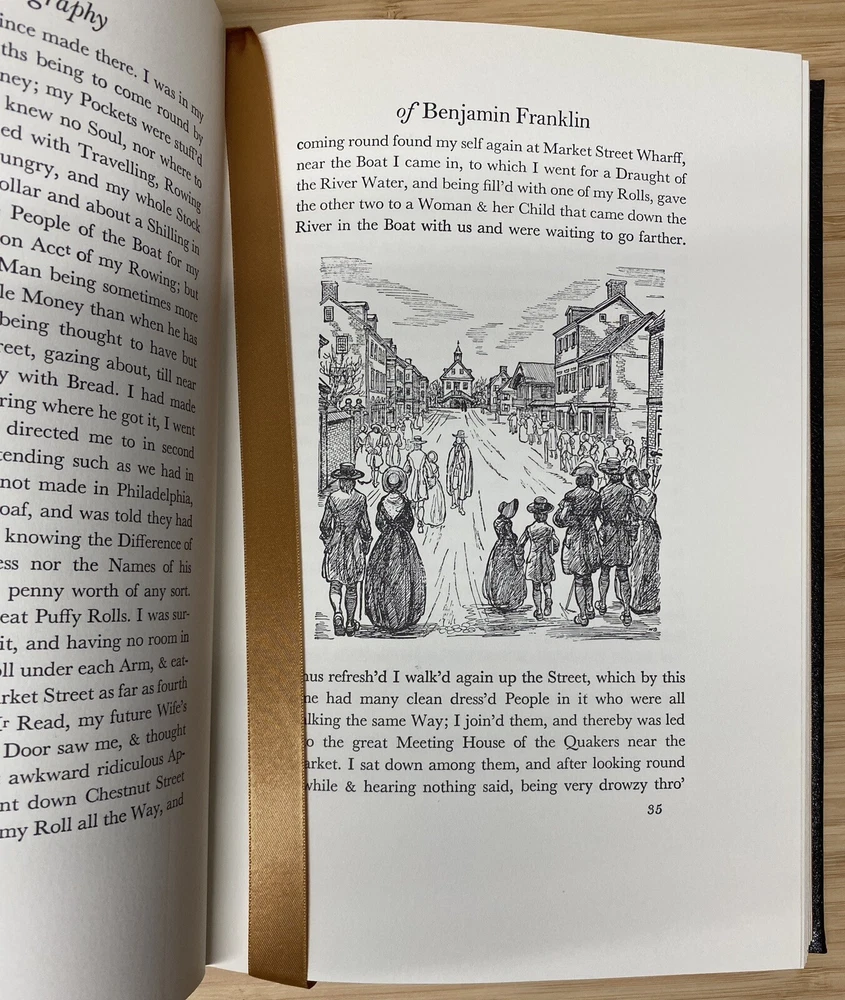 For Sale: " The Autobiography of Benjamin Franklin " By Benjamin Franklin Published: by The Easton Press Approx Dimensions: 6 3/4" x 10 1/4" Pages: 233 Description: This Collector's Edition bound in genuine leather by the Easton Press is in excellent condition. Clean unmarked pages and excellent binding and hinges. Previous owners ex-libris label affixed to inside of front cover. (loc2d)