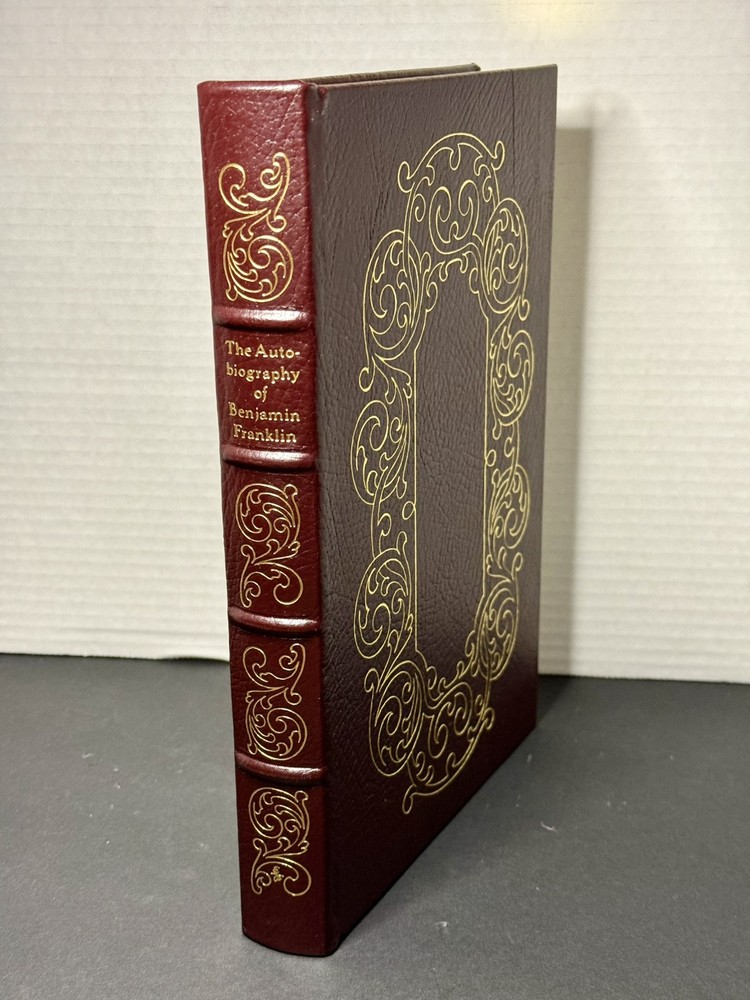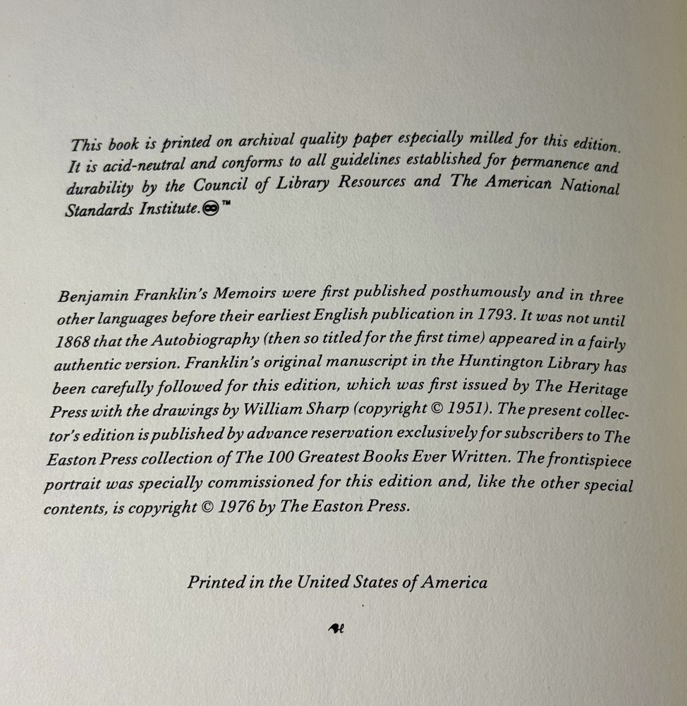The product is "The Autobiography of Benjamin Franklin - Easton Press Collector's Edition," published in the USA by Easton Press in 1976. It is a leather-bound book written by Benjamin Franklin, focusing on historical and biographical topics. This collector's edition is in English and was manufactured in the United States, making it a valuable addition for book collectors interested in North American history.