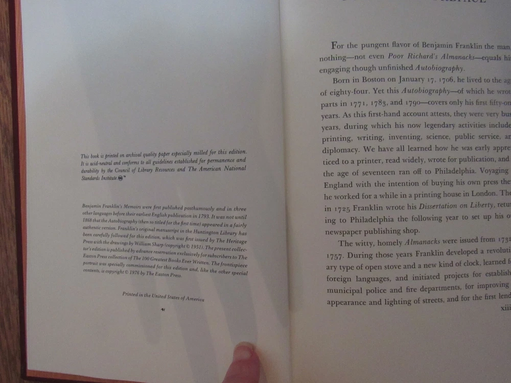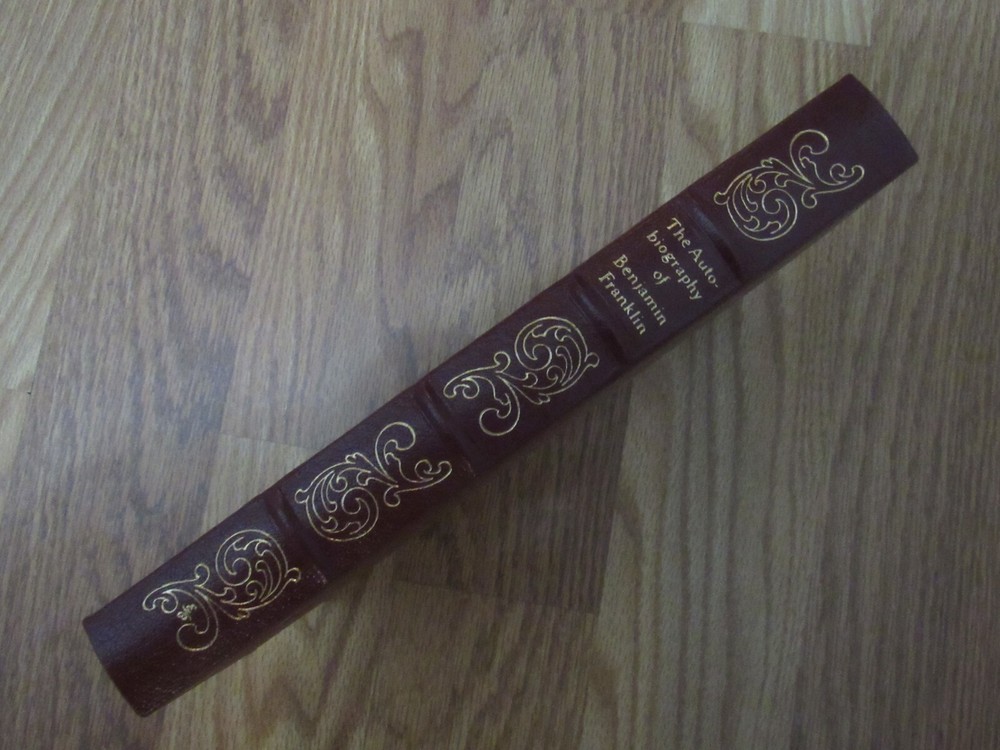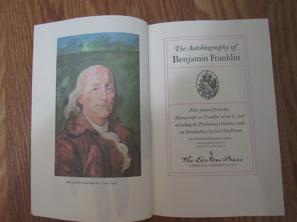 Beautiful, collector's copy of 'The Autobiography of Benjamin Franklin'. Published by Easton Press, it is bound in leather with gold gilt edges and satin marker ribbon. The inside boards and first and last pages are covered in silk paper. This book is now printed from the Manuscript as Franklin wrote it, and including his Preliminary Outline with an Introduction by Carl Van Doren. This book is listed as one of the 100 greatest books ever written. Don't miss this collector's copy! PLEASE SEE THE CONDDITION DESCRIPTION AND PICTURES ABOVE. WE LOVE TO COMBINE SHPPING AND WE ENTERTAIN PRICE OFFERS. THE MORE YOU BUY THE MORE YOU SAVE!