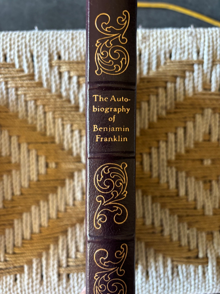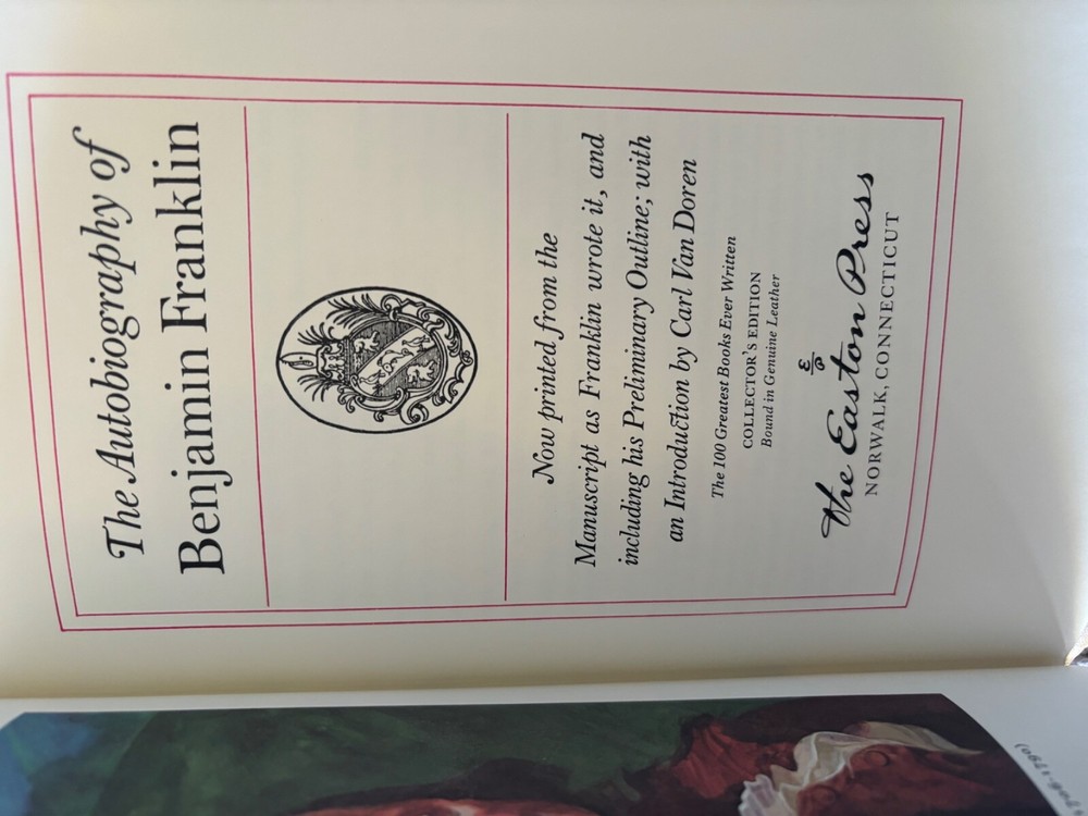 The product is a leather-bound edition of "The Autobiography of Benjamin Franklin" published by Easton Press. Written by Benjamin Franklin, this book is a collection of short stories that provide insight into the life and experiences of one of the most influential figures in American history. This beautifully crafted edition is a valuable addition for collectors and those interested in classic literature.
