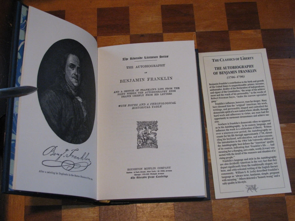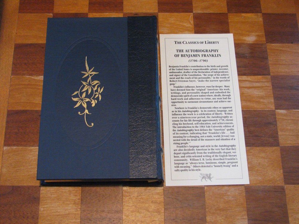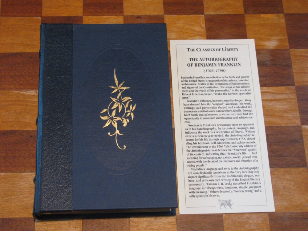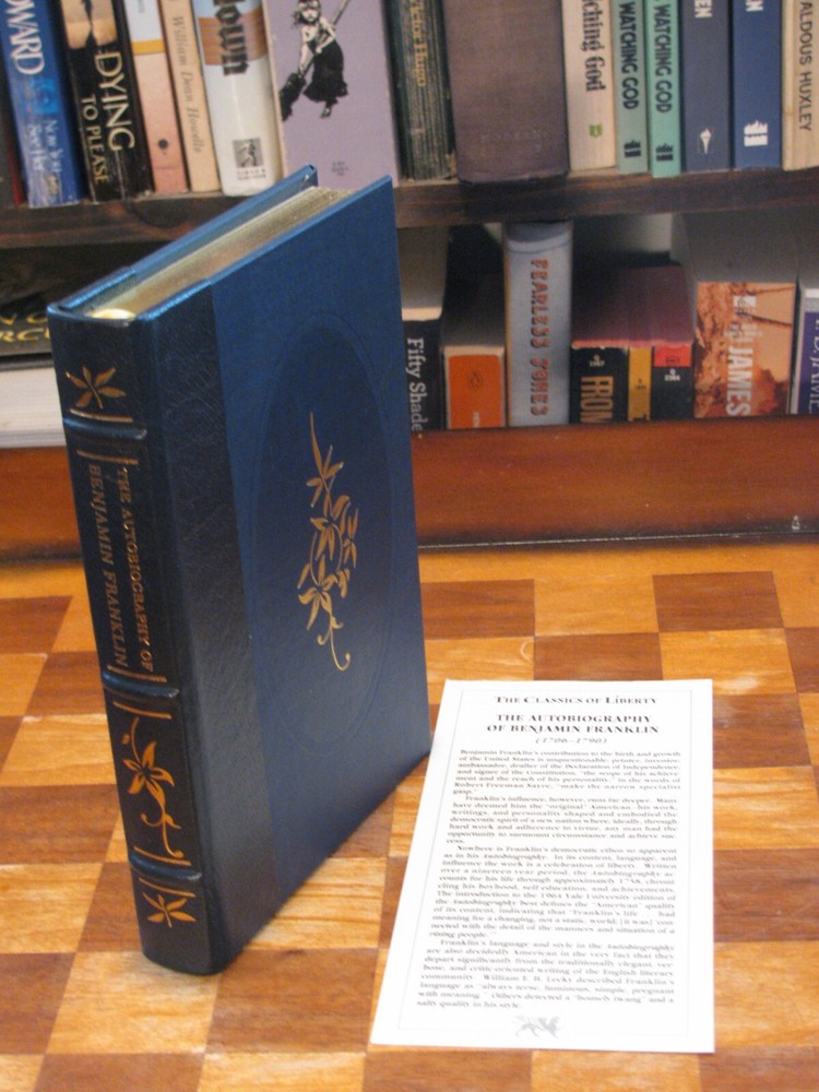 "Autobiography of Benjamin Franklin" by Benjamin Franklin The Classics of Liberty Library Gryphon Editions Facsimile of 1889 Riverside copy 1995 Quarter leather, ribbed spine, 22k gold lettering, gilded page edges, commissioned endleaves, private printing, limited edition The original owner and charter memeber of The Classics of Liberty Library's name is embossed inside the book (photo: 6, 7, 10). Otherwise the book appears as though it has never been used. Please see all photos. Ships free to the USA within twenty-four hours via USPS media mail, except weekends and federal holidays. All books ship in boxes with tracking numbers.