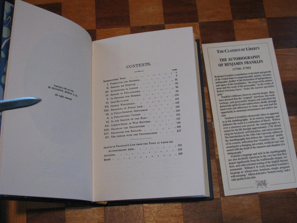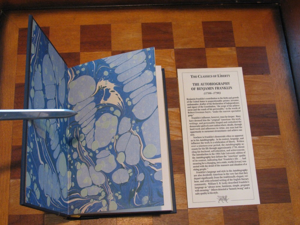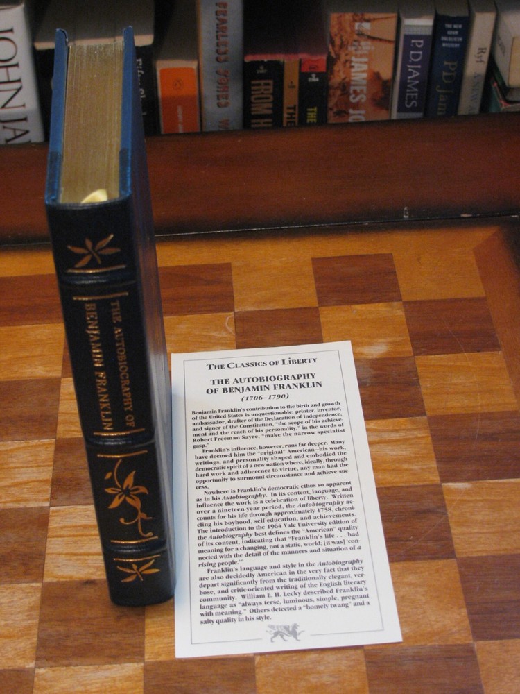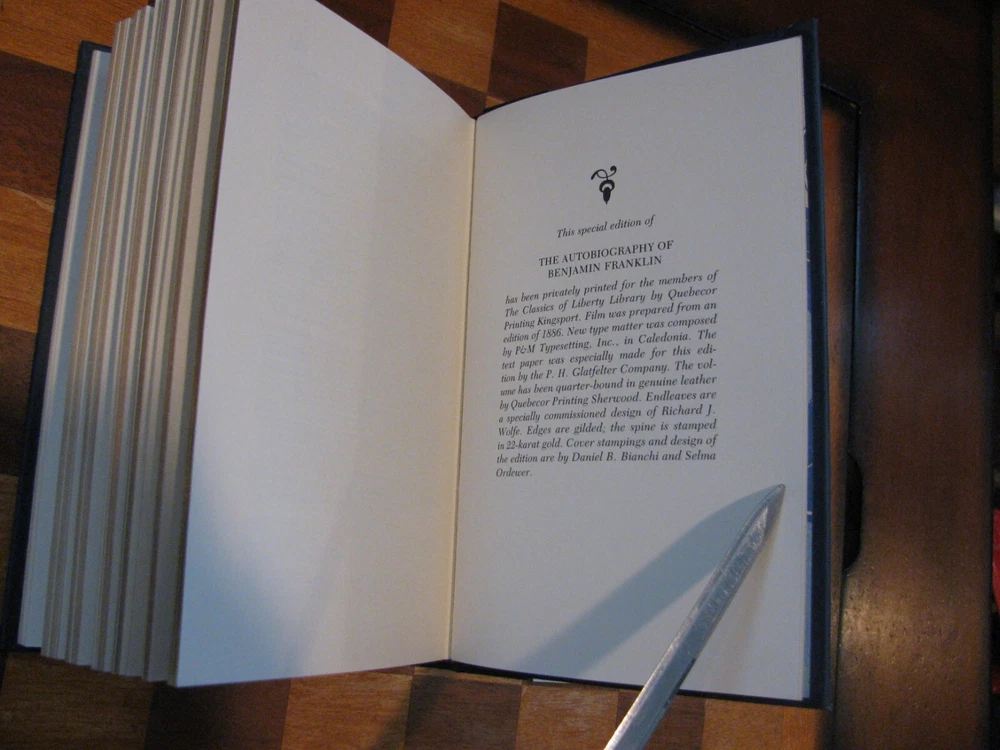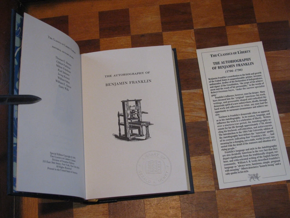 "Autobiography of Benjamin Franklin" by Benjamin Franklin The Classics of Liberty Library Gryphon Editions Facsimile of 1889 Riverside copy 1995 Quarter leather, ribbed spine, 22k gold lettering, gilded page edges, commissioned endleaves, private printing, limited edition The original owner and charter memeber of The Classics of Liberty Library's name is embossed inside the book (photo: 6, 7, 10). Otherwise the book appears as though it has never been used. Please see all photos. Ships free to the USA within twenty-four hours via USPS media mail, except weekends and federal holidays. All books ship in boxes with tracking numbers.