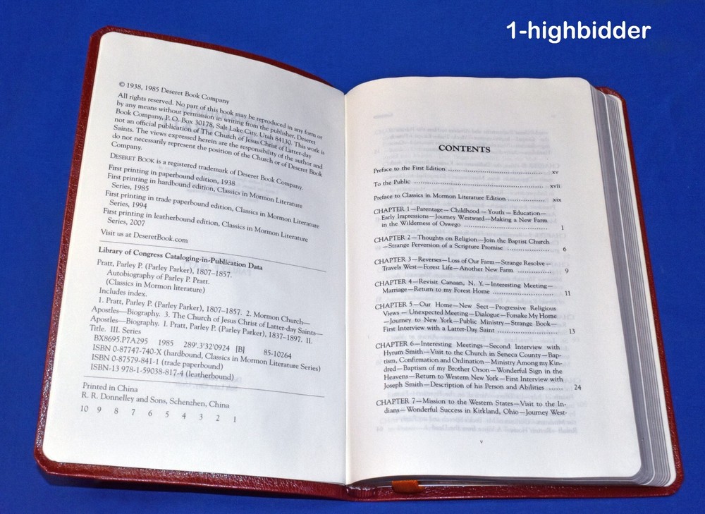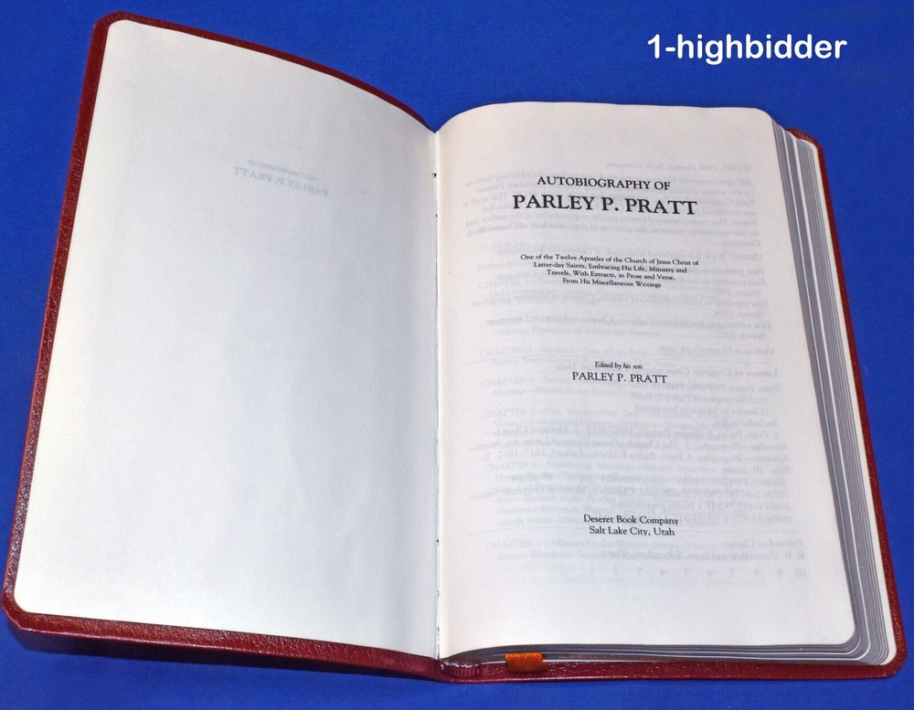 The Autobiography of Parley P. Pratt LEATHER POCKET Ed LDS Mormon Early Apostle ________________________________________ The Autobiography of Parley P. Pratt by Parley P. Pratt Published by Deseret Book (2007) Condition: LIKE NEW 1st Edition Leatherette Book! NO MARKS! Deseret Book calls it Leather, but it's not real leather. The book measures 7.25" x 5". The binding is tight and all 445 pages within are bright white with NO WRITING, UNDERLINING, HIGH-LIGHTING. , RIPS, TEARS, BENDS OR FOLDS. The "Leather" covers look perfect, as can be seen in my photos. The book has an orangish sewn-in book marker and gold gilded page edges. The page edges are near perfect like the rest of the book. You will be happy with this one! Always handled carefully and packaged securely! Buy with confidence from a seller who takes the time to show you the details and not use just stock photos. Please check out all my pictures and email with any questions! Thanks for looking! About the Book: This book is a thrilling firsthand account of faith, sacrifice, and adventure, chronicling the life of one of the most influential early leaders of The Church of Jesus Christ of Latter-day Saints. Written by Parley Parker Pratt himself, the book captures his incredible journey from a humble beginning in rural New York to becoming a fearless missionary, theologian, and apostle of the restored gospel. Pratt’s narrative is one of unyielding conviction. He recounts his early spiritual search, his dramatic conversion to the teachings of Joseph Smith, and his relentless dedication to spreading the message of the Restoration. His missionary journeys took him across the American frontier, Canada, and even England, where he boldly preached despite severe persecution, imprisonment, and hardships. From harrowing arrests to near-death experiences, Pratt’s resilience and devotion to his faith shine through every page. Beyond his religious endeavors, Pratt played a pivotal role in the westward expansion of the Saints. He endured the violent expulsion from Missouri, witnessed the rise of Nauvoo, and helped pave the way for the great migration to the Rocky Mountains. His life intertwined with key historical events, and his voice provides a compelling perspective on the trials faced by early Latter-day Saints. But Pratt’s story is not just about struggle—it is also about triumph. His love for his family, his poetic expressions of faith, and his unwavering belief in divine purpose make his autobiography a deeply moving and inspiring read. He was not just a preacher but a warrior for his beliefs, a defender of liberty, and a witness to miracles. Engaging, powerful, and deeply personal, The Autobiography of Parley P. Pratt is an enduring testament to faith in action and the spirit of perseverance. Copyright © 2018-2025 TDM Inc. The photos and text in this listing are copyrighted. I spend lots of time writing up my descriptions and despise it when un-original losers cut and paste my descriptions in as their own. It is against ebay policy and if you are caught, you will be reported to ebay and could be sued for copyright infringement and damages.