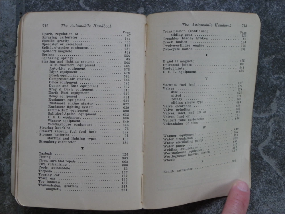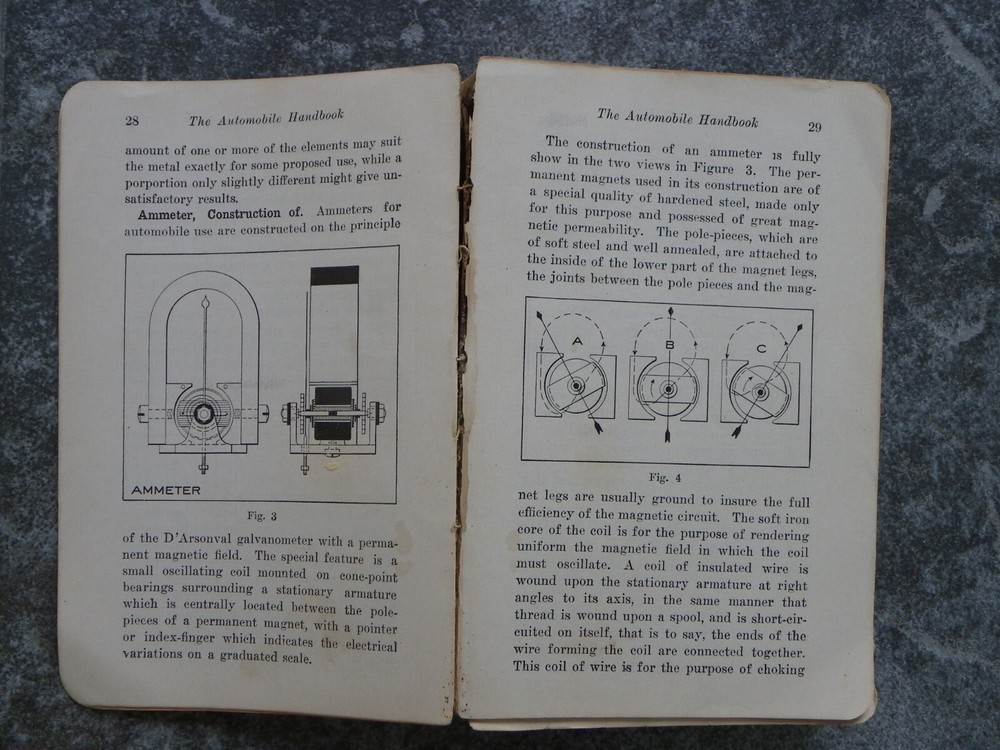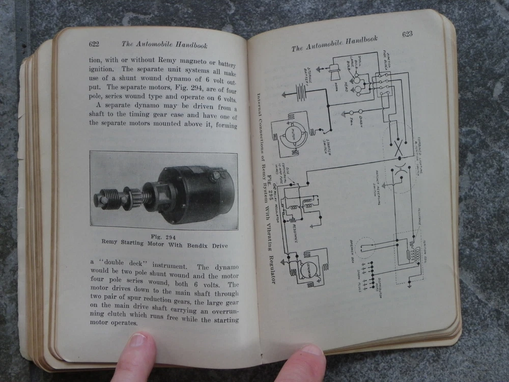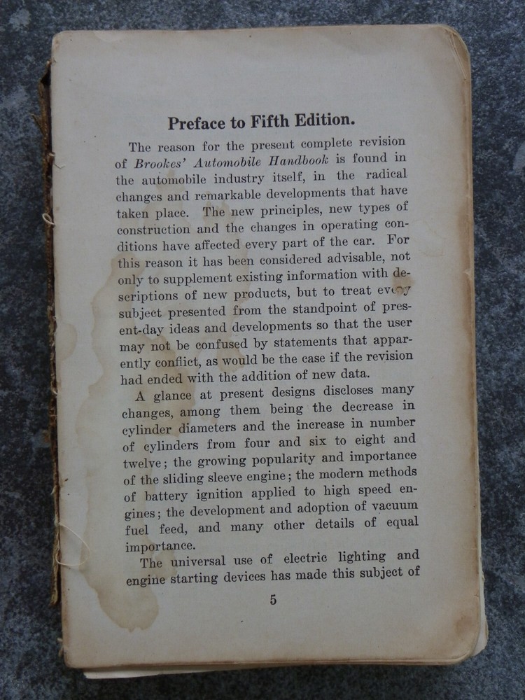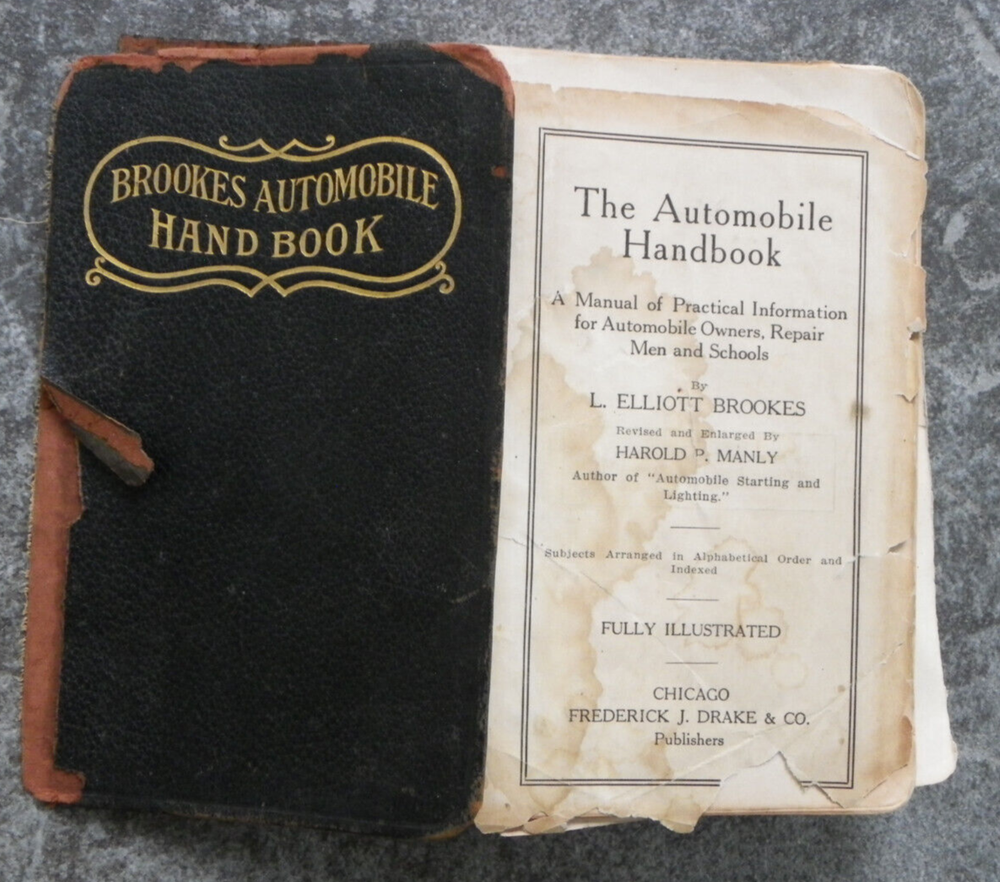 Offered is the antique leather-bound book "The Automobile Handbook", written by L. Elliott Brookes and published in Chicago by Frederick J. Drake & Co. This is the fifth edition of the "manual of practical information for automobile owners, repair men and schools", with a copyright date of 1916. There are over 300 black and white illustrations, diagrams and photos, some full page. Although there are several editions of this book for sale on eBay, at the time of original listing I could not find another 1916 copy. The book is approx. 6 3/4" x 4 1/2" and contains 713 pages, including the index, plus a few other pages in the back advertising other books. It is in poor to fair condition, with some damage. The back of the soft leather cover is missing and the front is detached, but present, with some surface bits missing on the front as well as the spine. The gold words on the front and spine are still mostly shiny. I see no missing pages but some of the first 66 pages are partially or completely loose; after page 67 they are all well-attached to the binding. The first few pages have some edge tears but afterwards are tear-free. They are mostly clean and clear, with occasional light foxing. I see no writing in the book. I have a lot of experience with vintage and antique books but am not an expert so please let me know if my description is missing information and you have additional questions. I will do my best to answer them! Please take a moment to look at some of the other items in my eBay store!