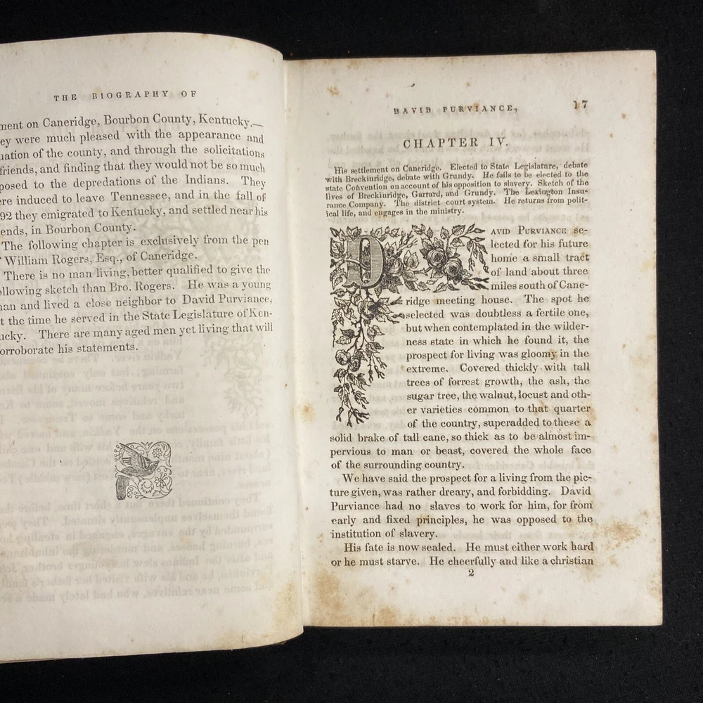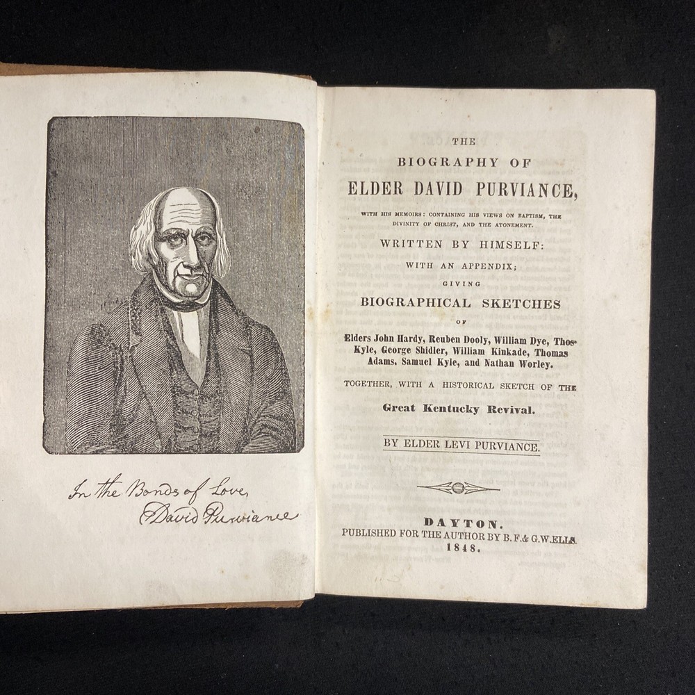Welcome to Dark Star Books, home of Spooky The Biography of Elder David Purviance with his memoirs; containing his views on baptism, the divinity of Christ, and the Atonement with an Appendix giving Biographical Sketches of Elders John Hardy, Reuben Dooly, William Dye, Thos. Kyle, George Shidler, William Kinkade, Thomas Adams, Samuel Kyle, and Nathan Worley Together, with a historical sketch of The Great Kentucky Revival by Elder Levi Purviance Dayton: By the Author 1848 304 pages Purviance (1766-1847) was a member at times of both the Ohio and Kentucky legislature, but is best remembered now as an early leader in the American Restoration Movement. Antique hardcover, 7.25 by 5 inches, bound in leather boards with black band and gilt to spine. Condition: Sold AS IS. Top spine missing, boards scuffed. A bit fragile as front board is barely holding. Text with scattered foxing throughout, stock still bright white. See photos. Shipping: We ship our orders through the US Postal Service (USPS). We are happy to combine shipping on multiple orders; If you want to buy more than one item, PLEASE put them in your cart and have us send you an invoice so we can combine the shipping. International orders. We are in the Global Shipping program but can sometimes opt out for a particular item if you contact us BEFORE BUYING the item. Global shipping is usually the least expensive option. Thank you! We welcome you to check out our eBay store as well as our lovely brick-and-mortar building in Yellow Springs, Ohio! We carry over 40,000 used books, back-issue comics, games, puzzles, and literary and geeky gifts. And no visit to Dark Star is complete without petting our store cat, Spooky! Dark Star Books & Comics 237 Xenia Ave. Yellow Springs, OH 45387 E9198 listed by Yvonne