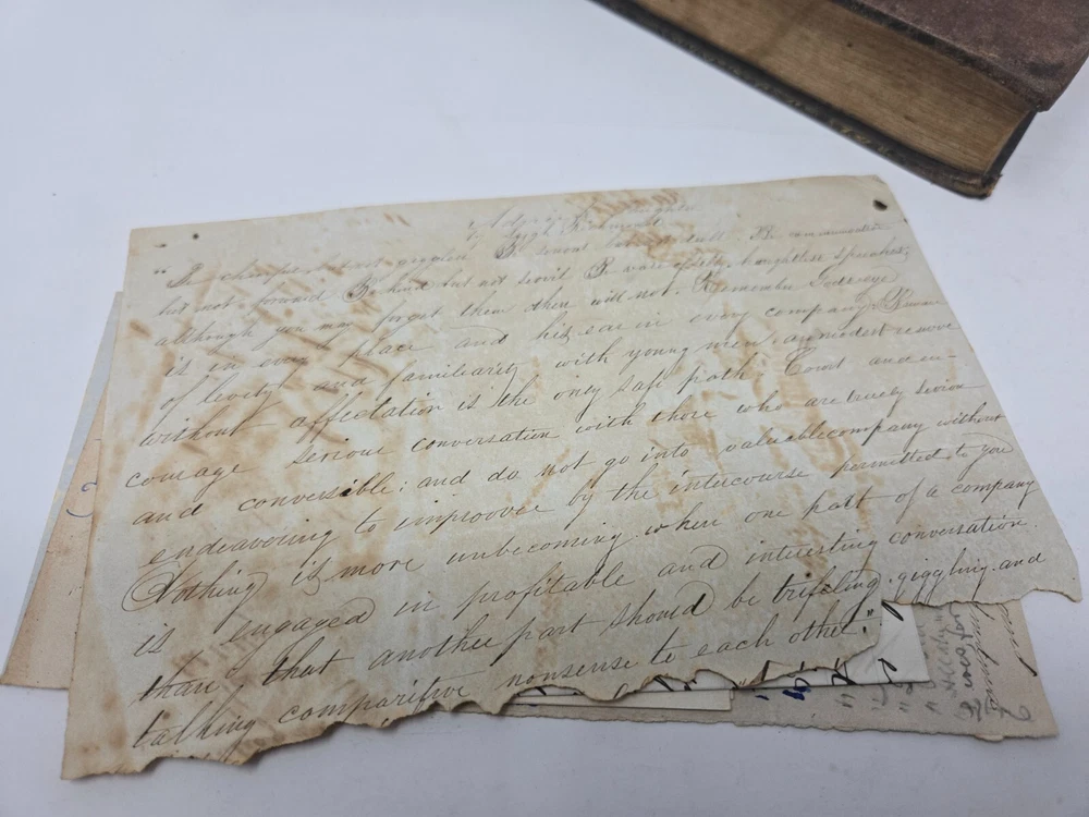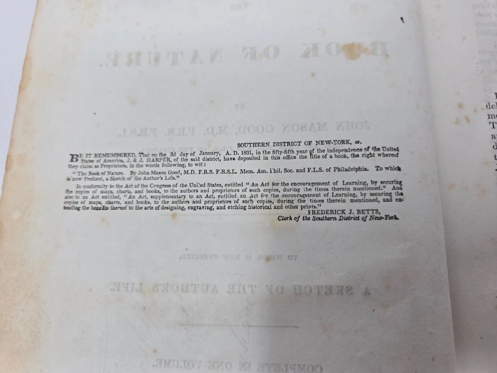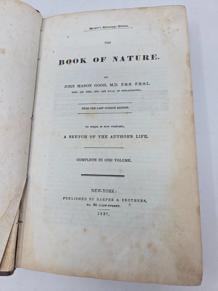 1837 edition of The Book of Nature by John Mason Good, M.D., published by Harper & Brothers. This early American printing includes a biographical sketch and represents a significant example of 19th-century scientific and philosophical writing. Bound in original full leather with raised bands and red title label to spine. Includes unique ephemera: several handwritten pages, a colorful vintage card, and calligraphy notes—adding historical and collector value. Pages show foxing typical of age, binding secure, light wear to boards. A fascinating piece of scientific and literary history with a personal archival touch. We provide FAST shipping, REASONABLE prices, and EXCEPTIONAL customer service. Our GOAL is to make your buying experience on e b a y the BEST it can be. Every item is CAREFULLY packed to ensure it arrives SAFELY at your door. Have questions? Feel free to send us a message—we’re here to help and respond quickly! Don’t forget to visit our store for more great finds like this one. Thank you for stopping by!