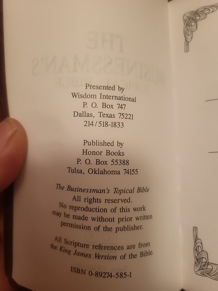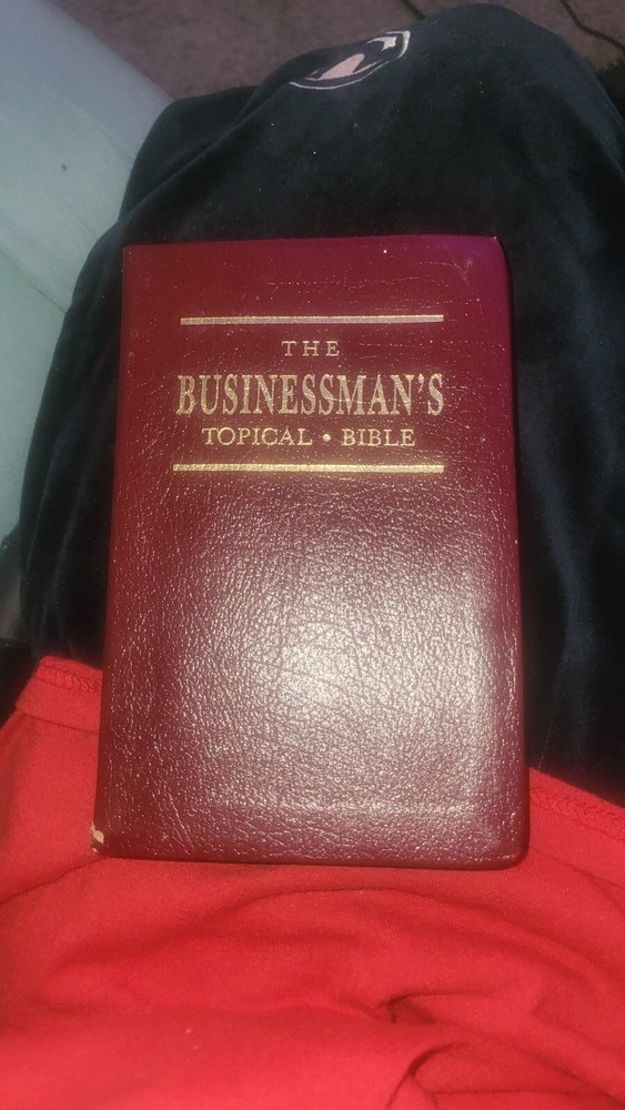 This is a leather-bound copy of "The Businessman's Topical Bible" published by Honor Books in January 1988. The book contains 320 pages and is written by Mike Murdock. The ISBN-10 is 1562920227. The book measures 7.32 inches in length, 5.13 inches in width, and 0.7 inches in height. It is written in English and is a King James Version. The book is categorized under "Books & Magazines" and "Bibles".