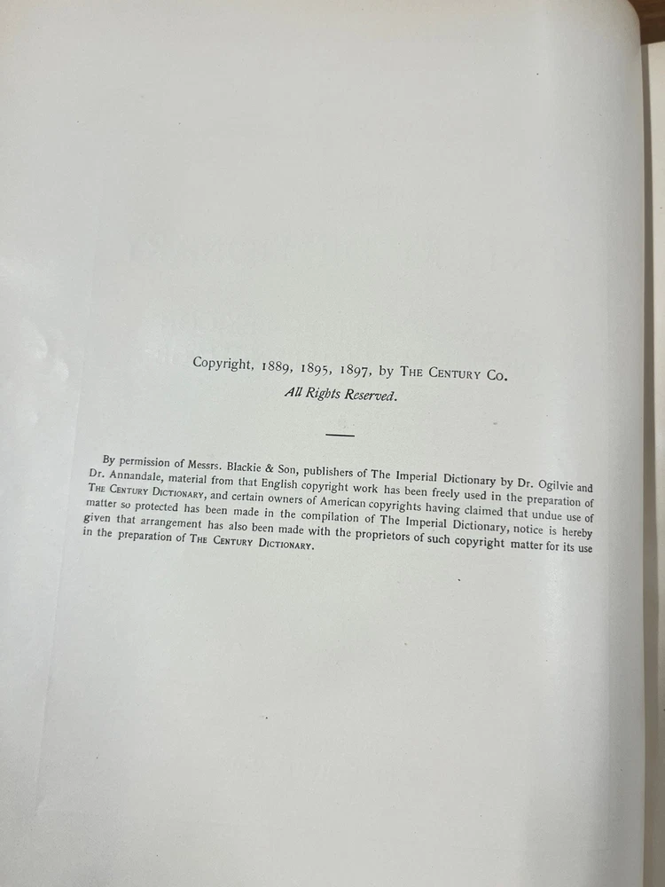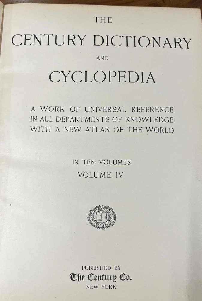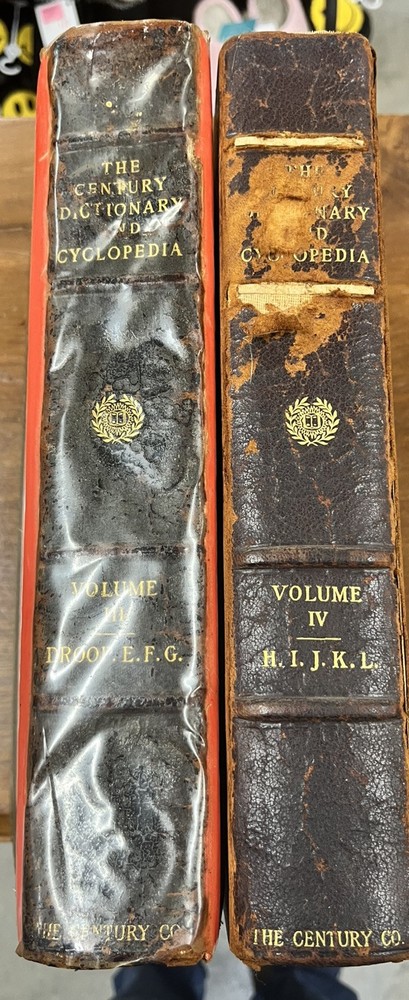 Volumes 3 & 4 of the Century Dictionary & Cyclopedia c. 1897 - The rest of the volumes are listed in separate listings so please check those out too! Vol 3 is Droop. - E.F.G. (2670 pgs.) In pretty good shape -It looks like someone repaired at one time with binding tape. Front and back covers are attached - writing on back cover as shown in pics. Pages are in great shape - few minor tears from page turning but for age in great shape. Vol. 4 is H.I.J.K.L. (3556 pgs) Great shape - doesn't look like its been looked thru very much at all - front and back cover is attached. Binding has some damage as shown in photos. Overall great shape for age of book. Both measure 12 x 9". The pair weigh almost 15 pounds together so consider that on postage. Please look at photos for condition and ask any questions.