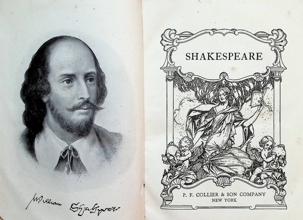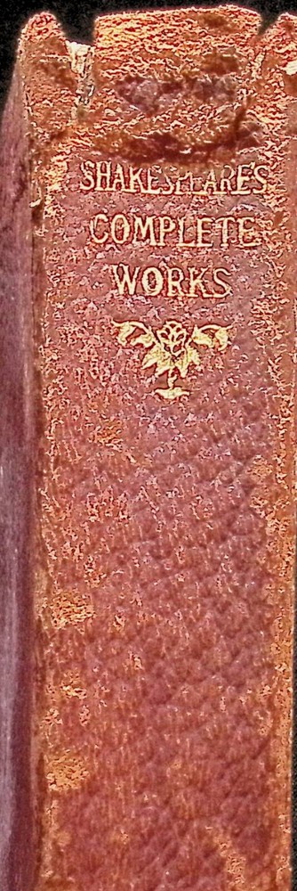 Title: The Complete Works of William Shakespeare with an Essay on Shakespeare and Bacon by Sir Henry Irving. P. F. Collier & Son Company,circa1925 (no date stated). Full-Leather. All edges gilt. Thumb- indexed. Cover has moderate shelf wear - rubbed corners, faded spine. Gilt title on spine and facsimile signature on cover remain bright. Mild foxing on endpapers, otherwise pages are clean, bright and unmarked. Printed on India Paper, a type of paper which from 1875 has been based on bleached hemp and rag fibers, and produces a very thin, tough opaque white paper. A biographical introduction, index of characters and a glossary are included in this work.
