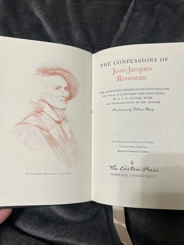 The Confessions of Jean Jacques Rouseau: The Easton Press, Leather Bound. Front cover has some discoloration; please see all pictures. Otherwise in good shape. No book plate.