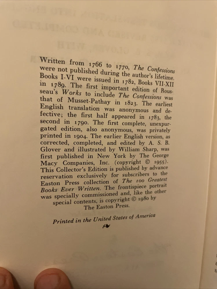 The Confessions of Jean-Jacques Rousseau Collector's Edition Easton Press See Pictures. The book is in very good condition. The cover is clean and little wear. The Gold gilding has no wear marks. The pages and binding is excellent condition.