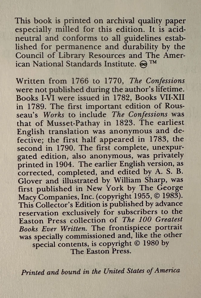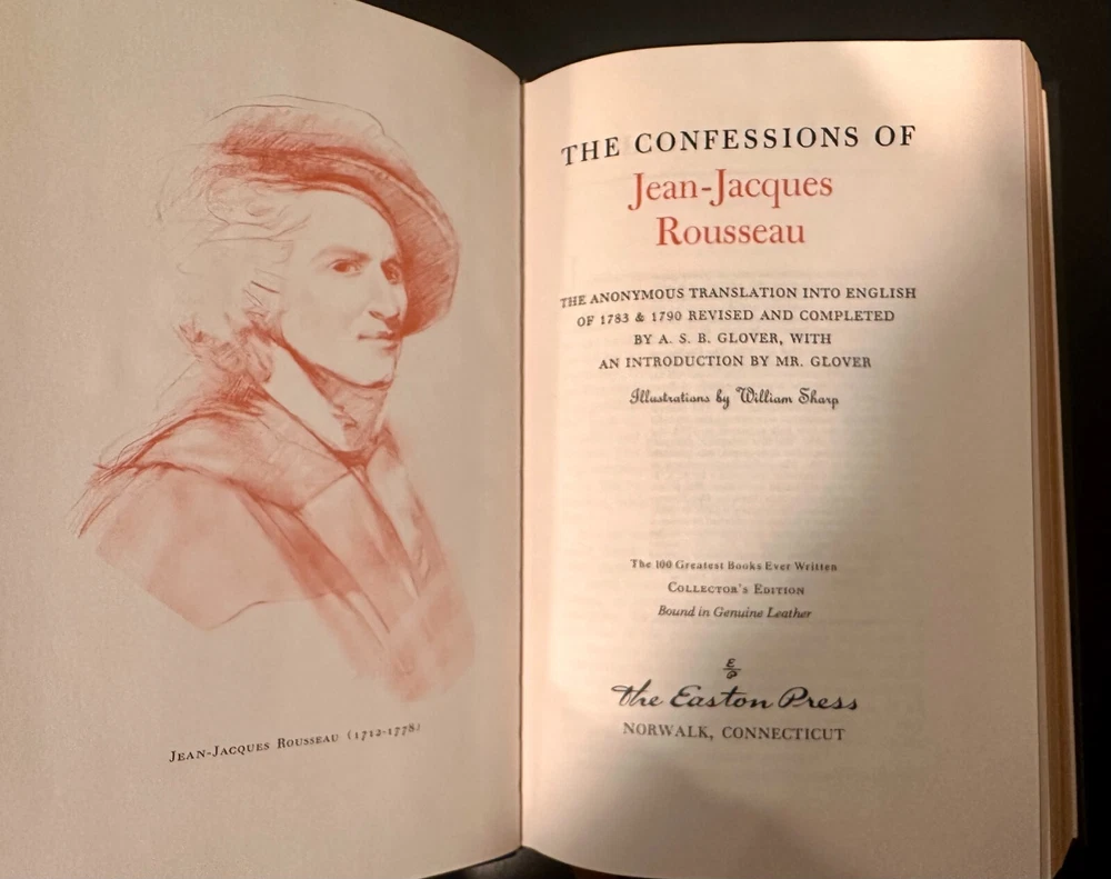 The Confessions of Jean-Jacques Rousseau - The Anonymous Translation Into English of 1783 & 1790 Revised and Completed by A. S. B. Glover, with An Introduction by Mr. Glover (The 100 Best Books Ever Written, Collector's Edition, Bound in Genuine Leather, Easton Press). Ships free via USPS Media Mail.