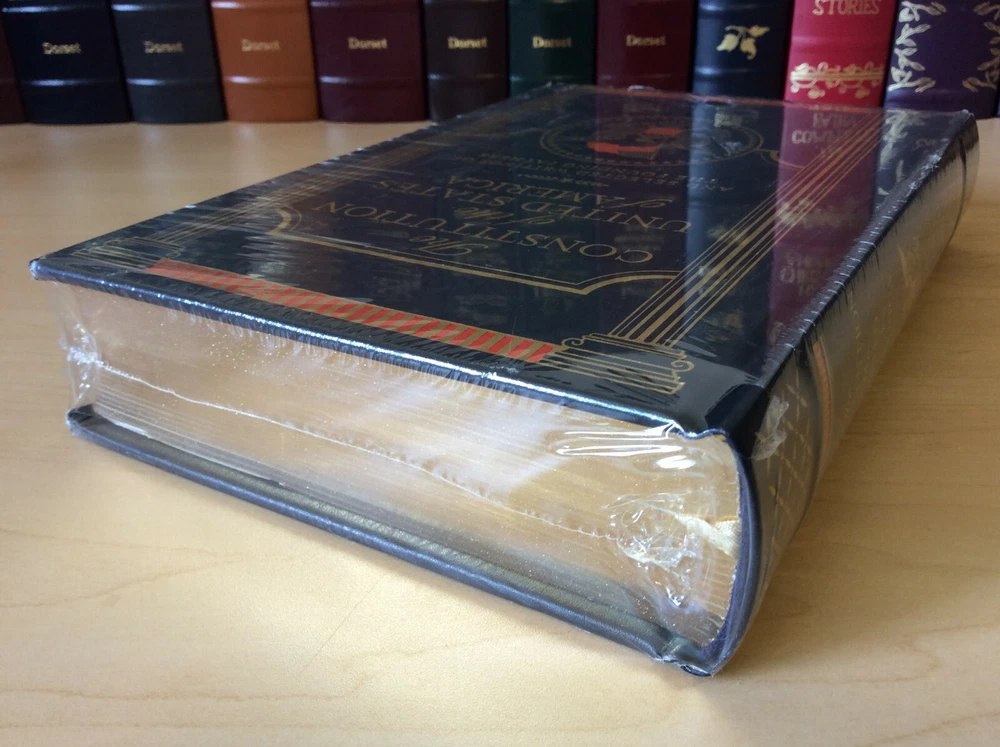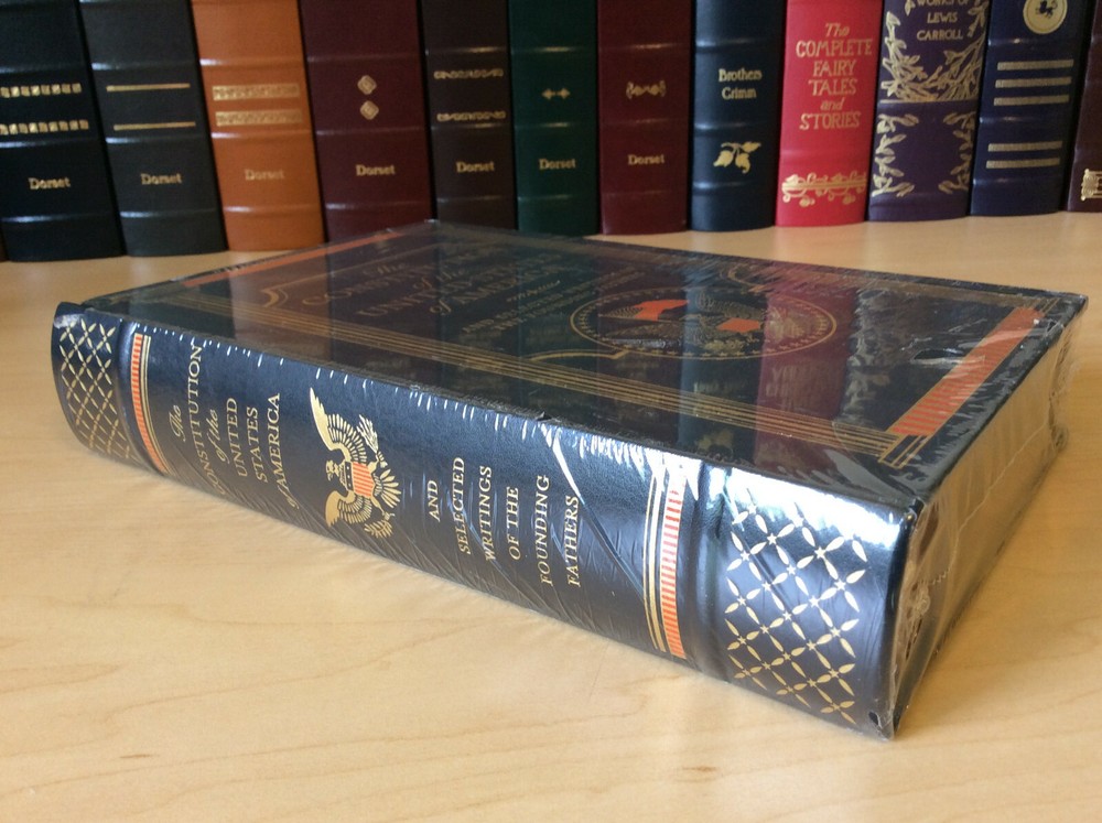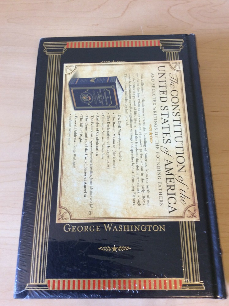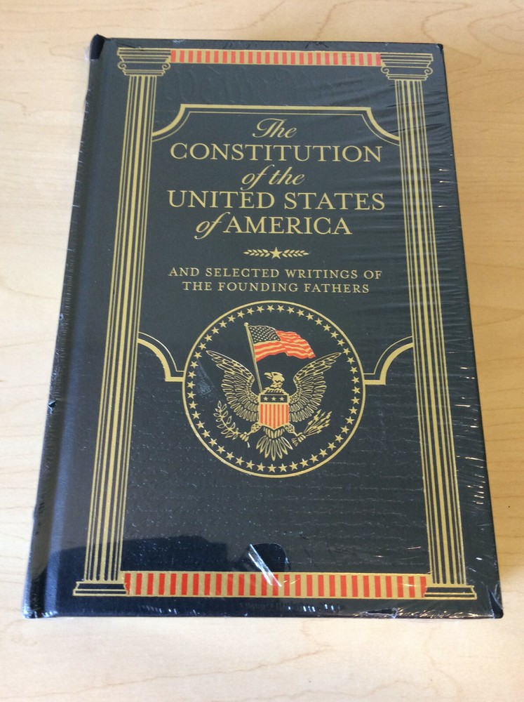 The Constitution of the United States and Selected Writings of The Founding Fathers bound in leather, with gilt edged pages and a ribbon marker Item Condition: This leather-bound hardcover is New, sealed. The seal is opening in places and there are flaws in the gilt edging. Dimensions are approx: 9.25" x 6.25" x 1.75" This book will ship in a box with bubble wrap. Photos 1-6 are of the actual book that will be shipped, the rest are examples of the book from an open copy.