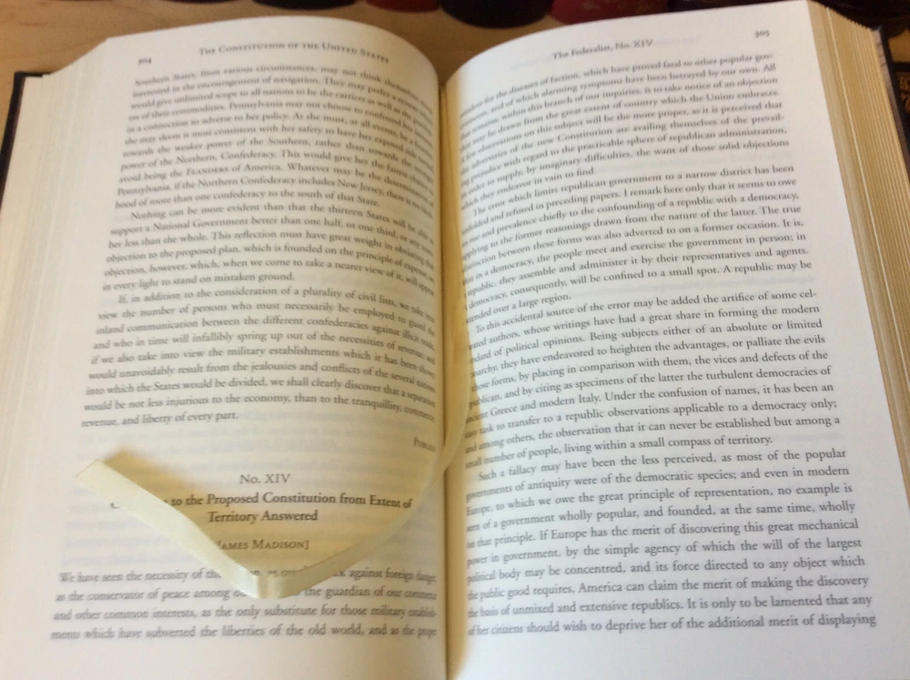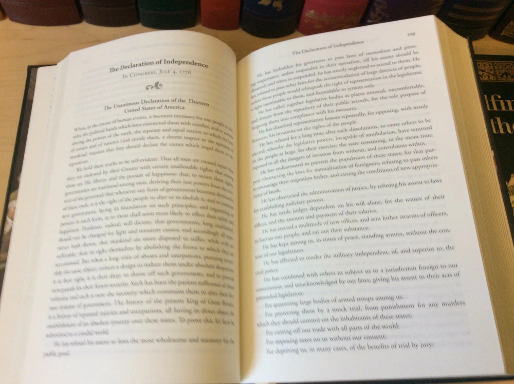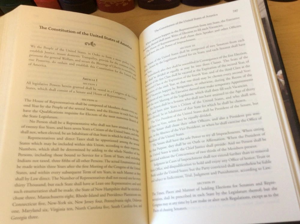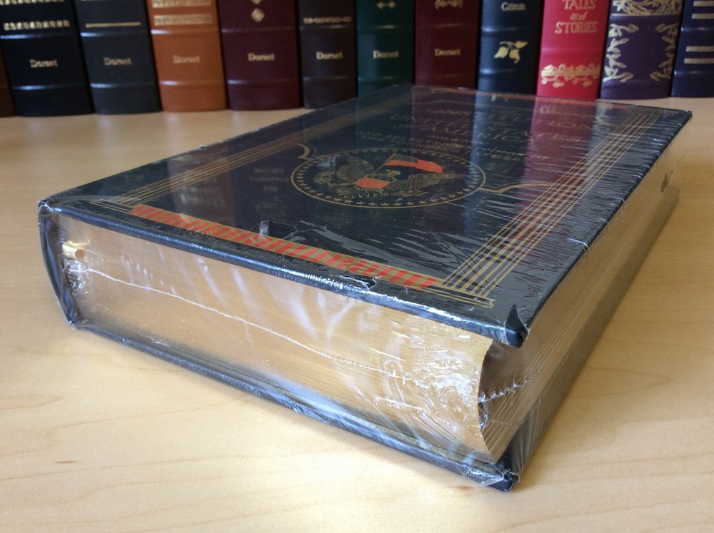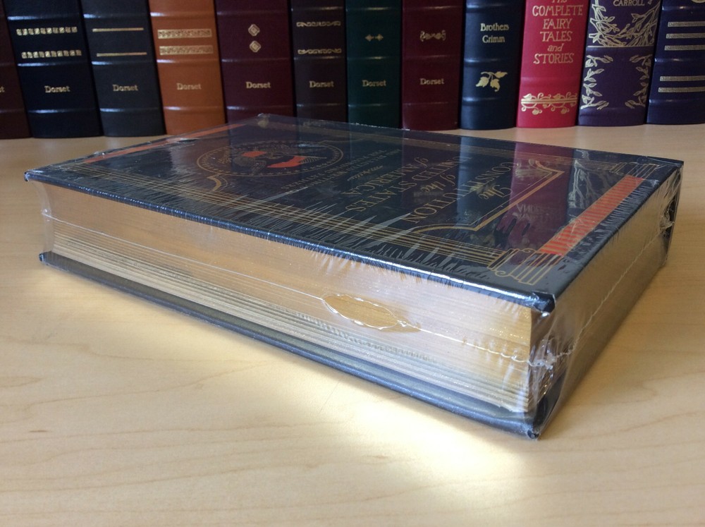 The Constitution of the United States and Selected Writings of The Founding Fathers bound in leather, with gilt edged pages and a ribbon marker Item Condition: This leather-bound hardcover is New, sealed. The seal is opening in places and there are flaws in the gilt edging. Dimensions are approx: 9.25" x 6.25" x 1.75" This book will ship in a box with bubble wrap. Photos 1-6 are of the actual book that will be shipped, the rest are examples of the book from an open copy.