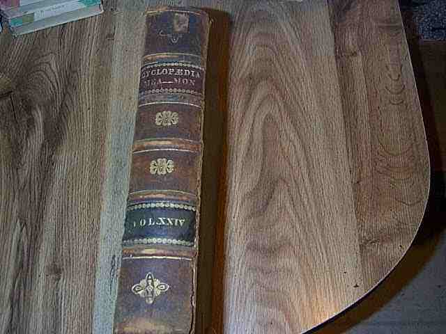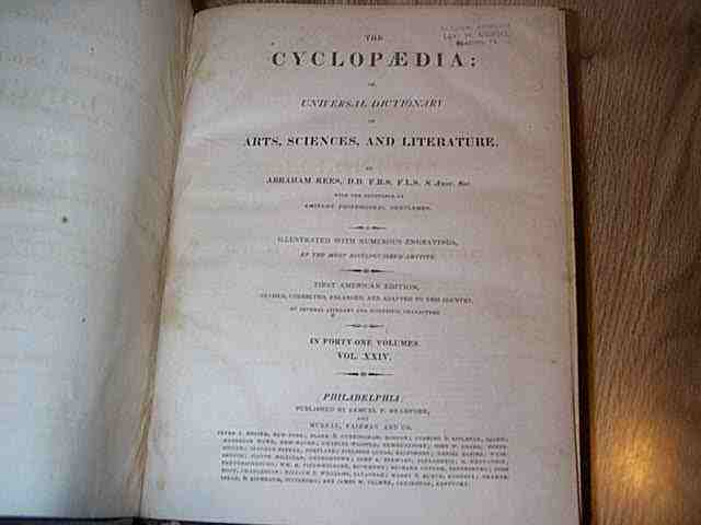 The Cyclopaedia; or, Universal Dictionary Of Arts, Sciences, And Literature by Abraham Rees, D.D, F.R.S., F.L.S., S. Amer. Soc. With The Assistance Of Eminent Professional Gentlemen. Illustrated With Numerous Engravings By The Most Distinguished Artists. First American Edition, Revised, Corrected, Enlarged, And Adapted To His Country, By Several Literary And Scientific Characters. In Forty-One Volumes. VOL. XXIV. (ONLY Volume 24 is being sold). Published by Samuel F. Bradford and Murray, Fairman & Co., Philadelphia. There is no stated publishing date----circa 1810 ????????????. The book has full leather cover. The cover is in average condition because of moderate wear and light soiling. The front cover hinge is broken. The back cover hinge is broken. The spine cover is tight and binding is good. The pages are good but have yellowed slightly and have a little foxing. There are several ownership stamps. There is an ownership plate on the front inside cover. There is a library plate on the front inside cover. There are several pages that have dogearing to the upper right corner. There is ONLY 1 illustration---see pic. The endpapers are marbled. ******Checkout my other listings for The Cyclopaedia Vol 26 and The Cyclopaedia Vol 27 Book is approx. 9 x 11 inches. Buyer to pay for media shipping, UNLESS INTERNATIONAL. Will ship immediately with pay pal payment. Payment is expected within 3 days after notification. Checkout my other book auctions and save $$$$$$ on shipping. For to me, to live is Christ, and to die is gain.---Philippians 1:21