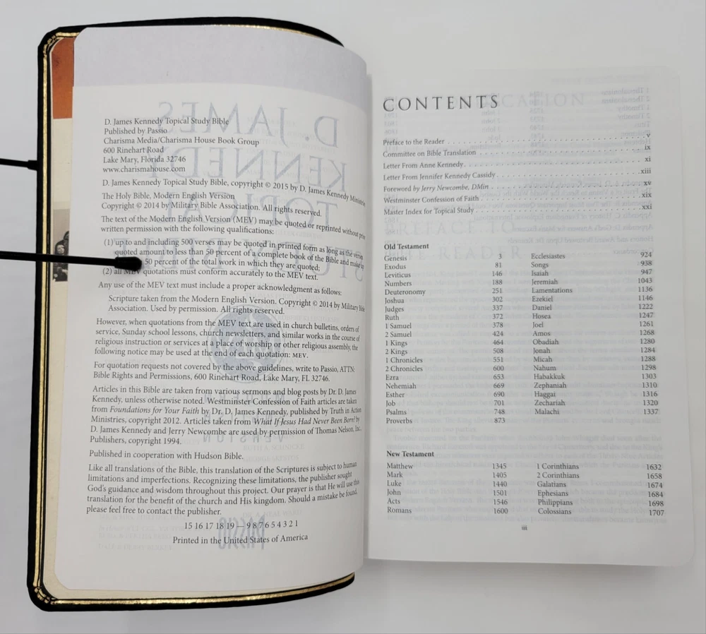 Like New copy. Comes with original box. Clean & unmarked. The only flaw is light fingerprints on the cover. Please see the photos for the actual condition of the Bible you will receive. Ships in a box. Experience a deeper understanding of the Bible with the D. James Kennedy Topical Study Holy Bible in Modern English Version. This study bible, authored by D. James Kennedy is designed to enhance your reading and studying experience with its features, including color maps, leather cover, 2 ribbon page markers, and gilt page edges. The book is published by Passio in 2015 and is intended for young adults and adults who want to explore the Bible in a more meaningful way. The book belongs to the Study Bible book series and is written in English, the original language. This nonfiction book is perfect for those who seek spiritual enlightenment and religious wisdom.