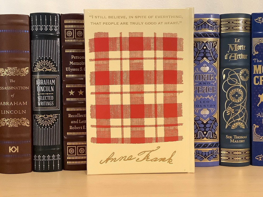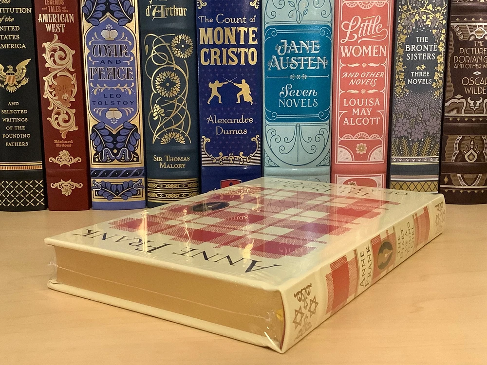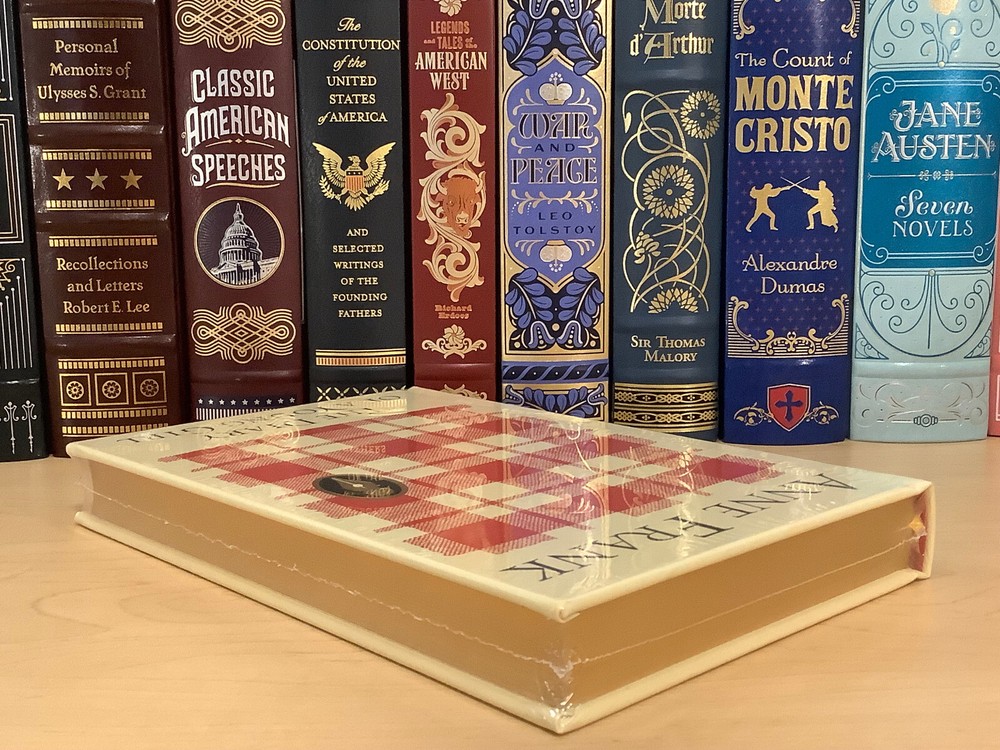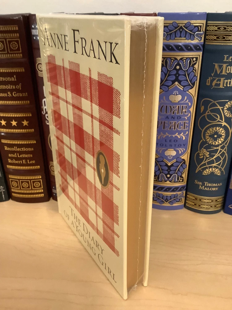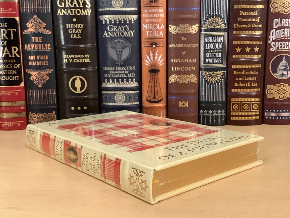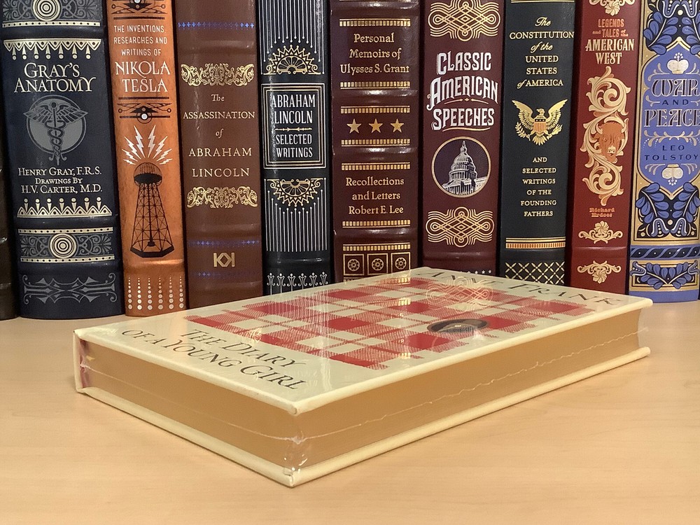 The Diary of A Young Girl by Anne Frank bound in leather, with gilt edged pages and a ribbon marker Item Condition: This is a new, sealed leatherbound hardcover. There is a ding on the hardcover at the bottom front corner (see photo #4), and a mark to the leather on the back cover (see photo #2). Dimensions are approx: 9.25" x 6.25" x 1" This book will ship in a box with bubble wrap. Photos 1-8 are of the actual book that will be shipped, the rest are examples of the book from an open copy.