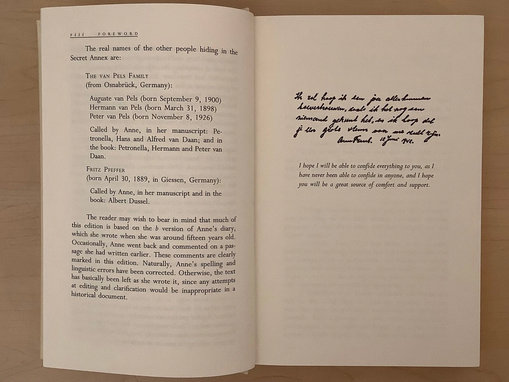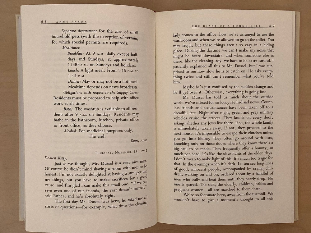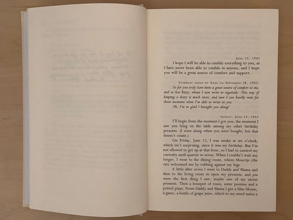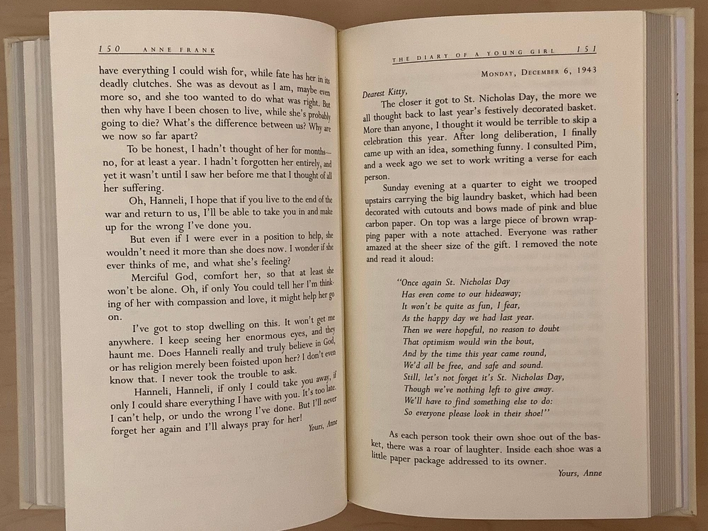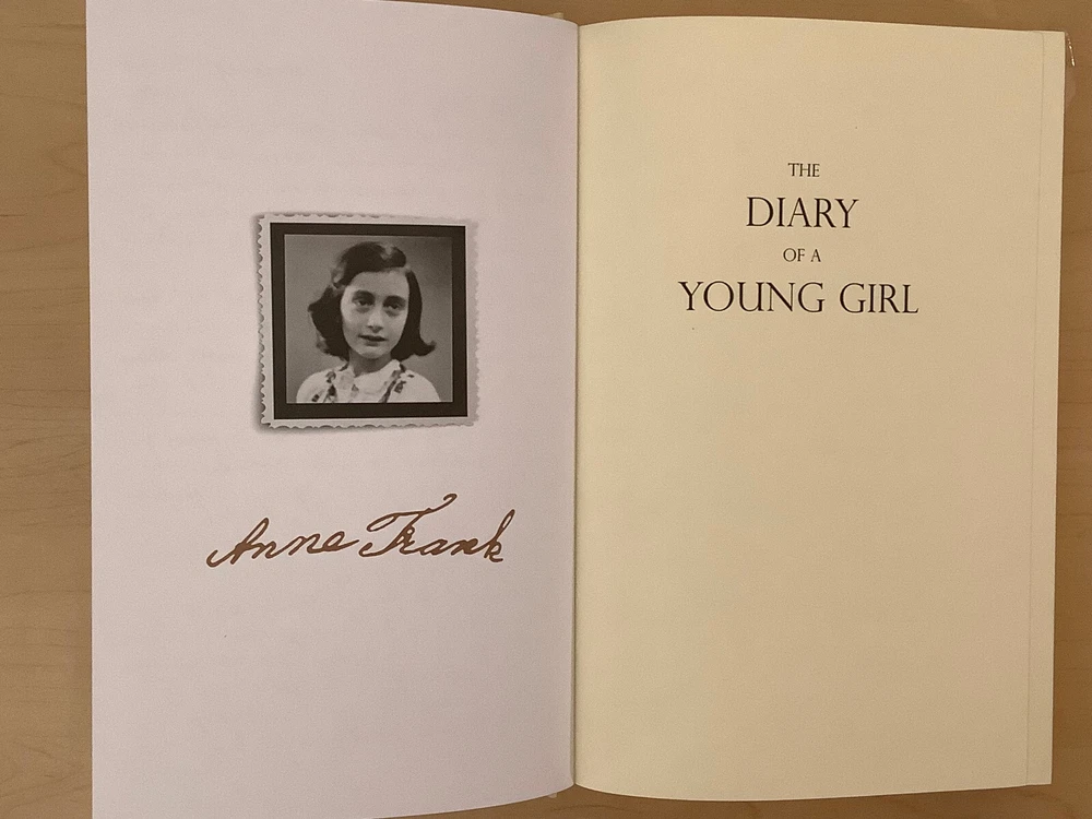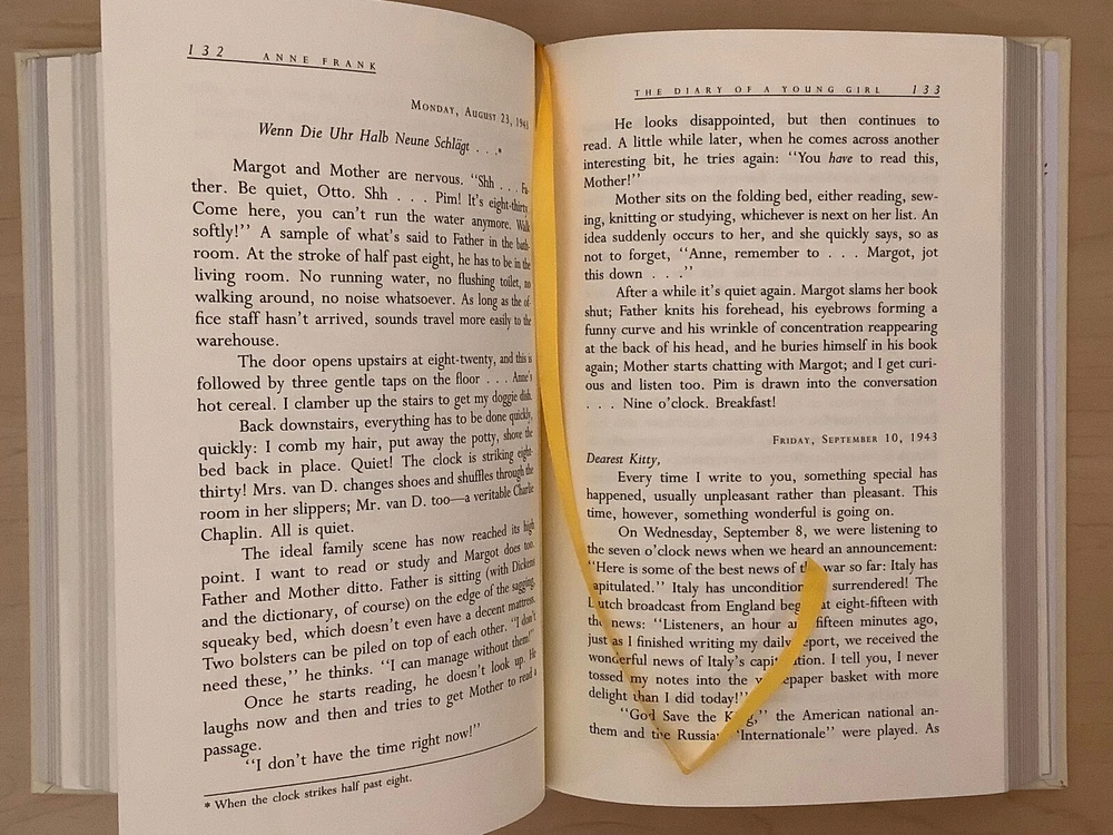 The Diary of A Young Girl by Anne Frank bound in leather, with gilt edged pages and a ribbon marker Item Condition: This is a new, sealed leatherbound hardcover. There is a ding on the hardcover at the bottom front corner (see photo #4), and a mark to the leather on the back cover (see photo #2). Dimensions are approx: 9.25" x 6.25" x 1" This book will ship in a box with bubble wrap. Photos 1-8 are of the actual book that will be shipped, the rest are examples of the book from an open copy.
