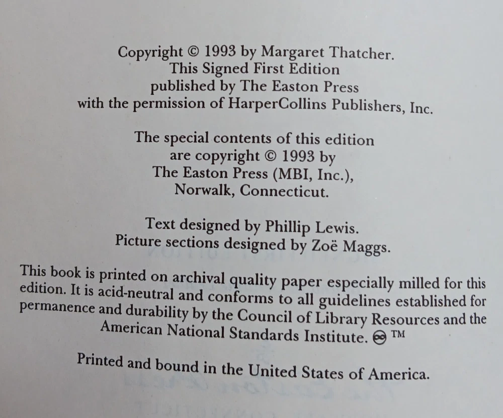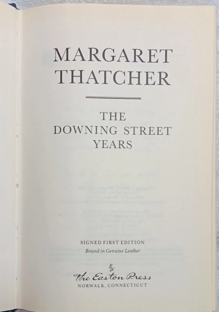 The Downing Street Years by Margaret Thatcher First Edition - 1993 Easton Press -Very good condition -Signed & Numbered 1073 of 2000 -Spine and cover boards are straight with a few minor blemishes. -Binding is like new. -Contents are unmarked. Please view all photos closely. Photos are part of the description. All photos are of actual book you will receive and NOT a stock photo. Reasonable offers accepted via Make An Offer or messages. Don't be afraid to ask!! If you are too low, I'll let you know. I'll never block you because you made any offer I didn't agree with, like many other sellers will do here. If you are located outside the U.S.A., please contact me if you feel shipping charges are too high. I will see if I can work out a better rate for you. If you have any other questions or would like me to take additional photos just drop me a note and I'll work that out ASAP. Thank you for taking the time to read and view this listing.