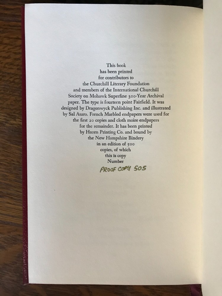 The hardcover Deluxe Limited Edition of a short story first published in 1966, and in book form by the International Churchill Society in 1987. As pictured, this is Proof Copy 505 of the edition limited to 500 copies, bound in red leather with moire endpapers. 48 pages. A really delightful little thing and a great bargain as a Proof Copy with all the characteristics of the underlying edition.