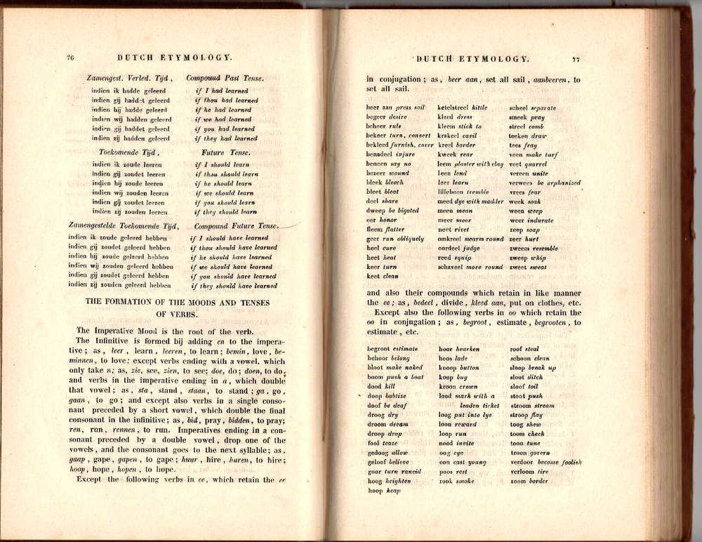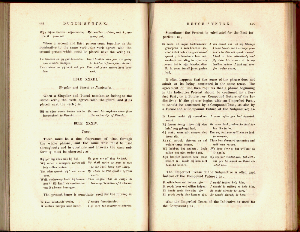 The Dutch Grammar, Preceded by an Historical Sketch of the Origin and Progress of the Language of The Netherlands..., by T. Marshall, Printed for the Author by Mensing & Van Westreenen, Rotterdam, The Netherlands, January 1842, First Edition — pages i-xlvii, followed by 213 pages [260 total pages] — measures: 5 9/16" x 8 9/16" Contents: Preface, dated January 1842 Introduction Dutch Grammar Dutch Orthography and Pronunciation Dutch Etymology Dutch Syntax Rules I - LII Prosody Appendixes: I. Dutch Titles of Royalty, Nobility, Civil and Military Rank, with their Abbreviations as used in Correspondence, and News-Papers II. On the Pronunciation of some Foreign Words III. Rules of Punctuation IV. On the Use of Capitals