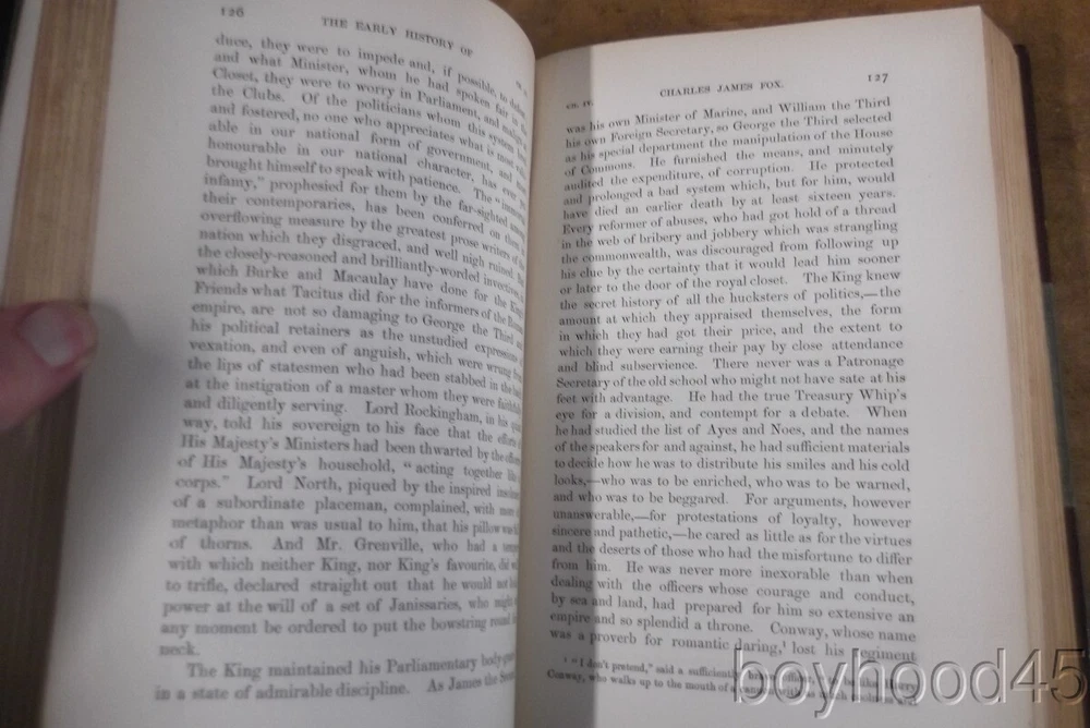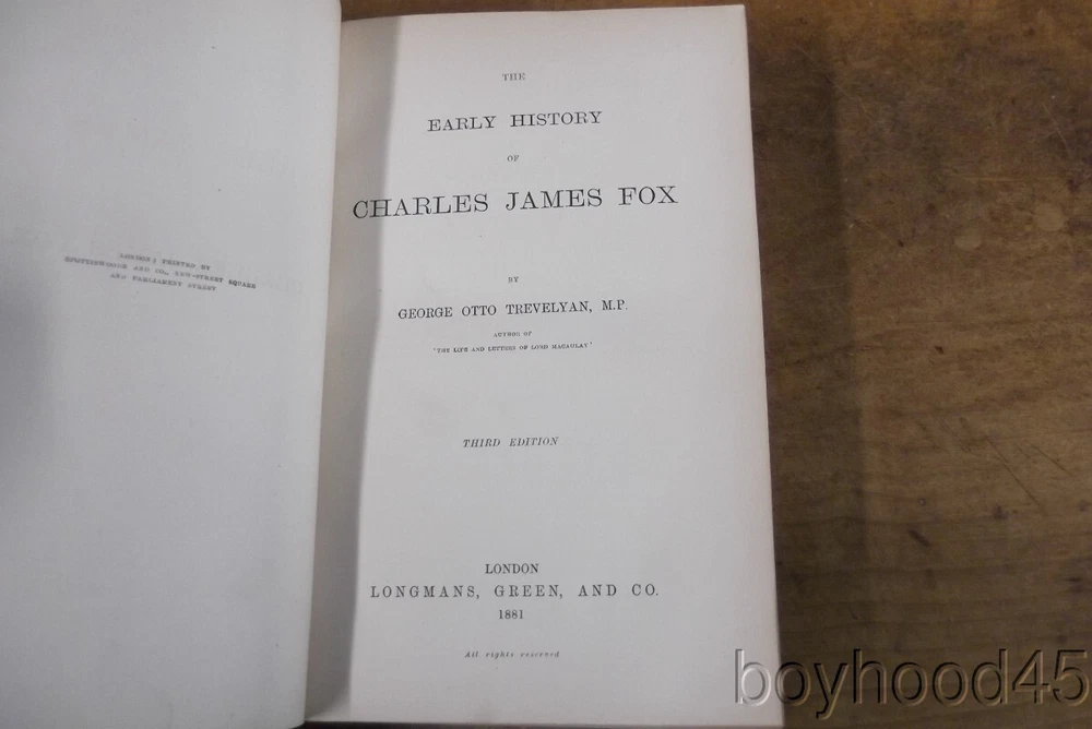 The Early History of Charles James Fox by George Otto Trevelyan-1881-Leather The Early History of Charles James Fox by George Otto Trevelyan-1881-Leather Click images to enlarge Description The Early History of Charles James Fox by George Otto Trevelyan-1881-Leather This is "The Early History of Charles James Fox" by George Otto Trevelyan. Published by Longmans, Green and Co., London, 1881. Third Edition. Bound in half leather. Biography of a notable British statesman that shows some sun fading to leather spine. There is wear/leather loss to head of spine. Internally clean, tight and very sound. Nameplate of former owner appears. I will call the book Good to Very Good. Measures 6 X 9, 545 pages. A SCARCE FEW copies of this book can be found on Amazon and other internet booksites for $82 to upwards of $177!!! Contemporary reprints are available for upwards of $77!! I will offer this leatherbound copy for only $60.00 plus $5.00 S&H in the US. Canadian shipping costs will be considerably less than general international rates quoted. Thanks for shopping mellowpagesrarebooks.com Payment I accept the following forms of payment: PayPal Shipping & Handling I will ship Priority for an additional fee upon request. PLEASE NOTE: SHIPPING COSTS FOR MULTI-VOLUME SETS OR OVERSIZED BOOKS WILL EXCEED THE STANDARD "US SHIPPING" ECONOMY RATE OF $5.00. COST OF SHIPPING OVERSIZED BOOKS OR MULTI-VOLUME SETS ARE SPECIFIED WITHIN THE TEXT OF THE LISTING. Canadian buyers are not subject to stated international shipping costs and will pay less than the amount stated. US Shipping $5.00 USPS Media Mail® International Shipping $55.00 USPS Priority Mail International FREE scheduling, supersized images and templates. Get Vendio Sales Manager. FREE scheduling, supersized images and templates. Get Vendio Sales Manager. Condition Notes: Light general wear, very clean. There is wear/tear to leather at head of spine. Payment Paypal Shipping Domestic shipping: Fixed Shipping Charges. International shipping: Fixed Shipping Charges. Shipping Carrier Domestic International Shipping Locations Usps Book Rate $5.00 - - Usps Priority Intl - $55.00 Worldwide I will ship to: United States, Worldwide Vendio Images: More than just a pretty image. 250+ Mobile Responsive & Active Content Free Listing Templates with Vendio Sales Manager. Vendio provides powerful selling automation for sellers of all sizes. Get business information that counts! - Vendio Counters are active content free.