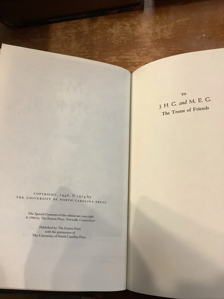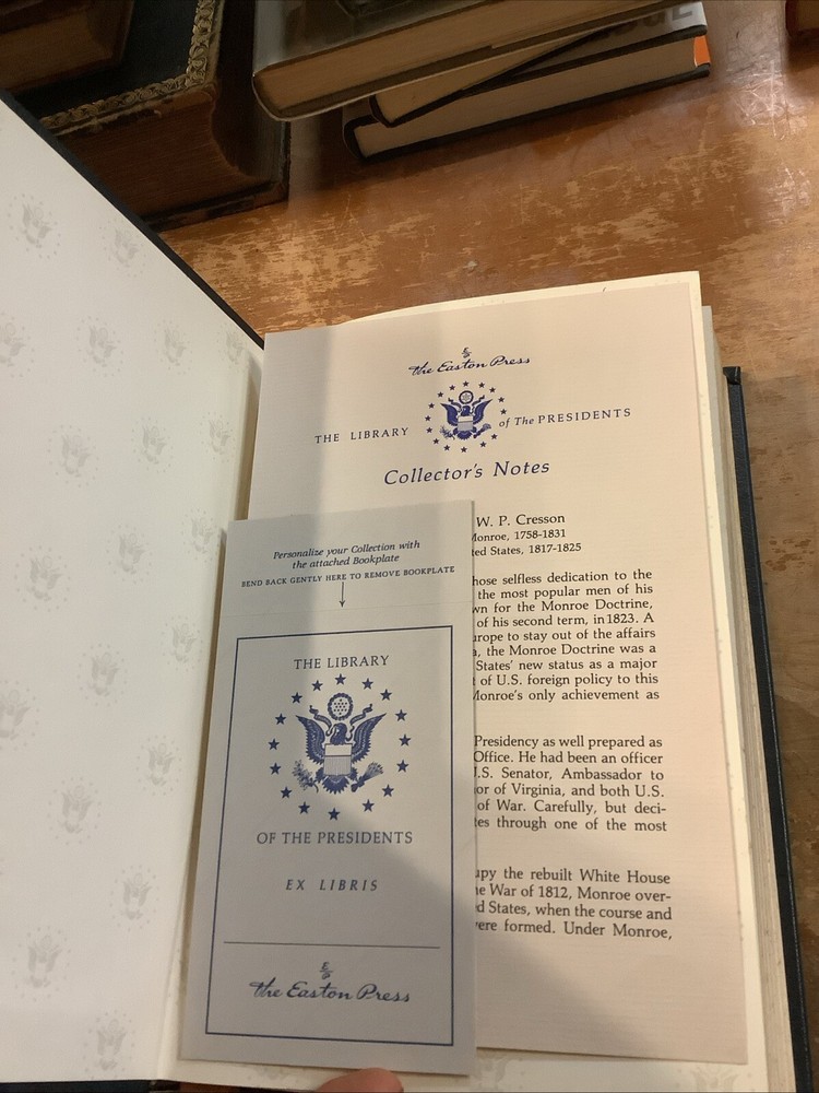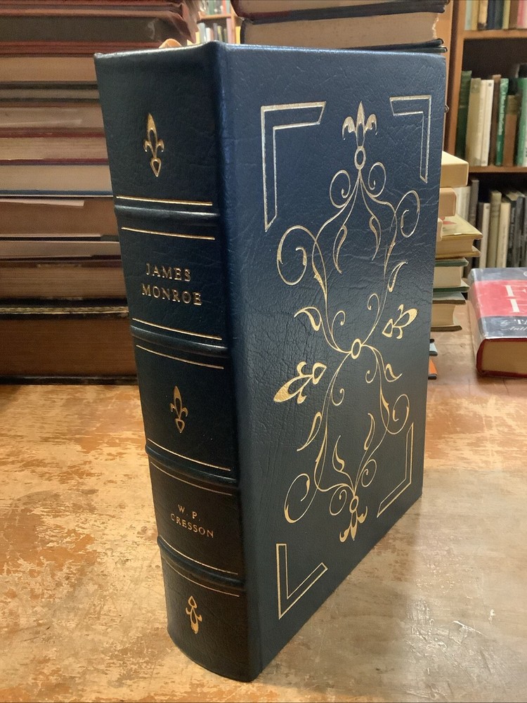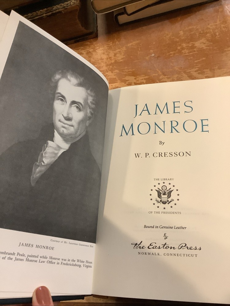 James Monroe by W. P. Cresson. Published by The Easton Press, 1986. No markings. Sheet of Collectors Notes laid in, along with blank Easton Press bookplate. Hardcover leather bound collector's edition with gilt page edges and ribbon bookmark.
