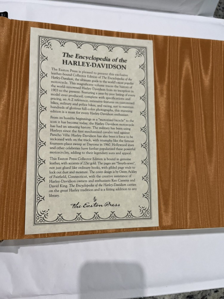 The Encyclopedia of the Harley-Davidson By Henshaw Kerr- Gilded 22 kt accents & genuine leather Beautiful exclusive genuine leather bound book in great condition with gilded 22kt edges and accents. The book features a year by year listing of every model ever produced. Perfect gift for the Harley enthusiast!
