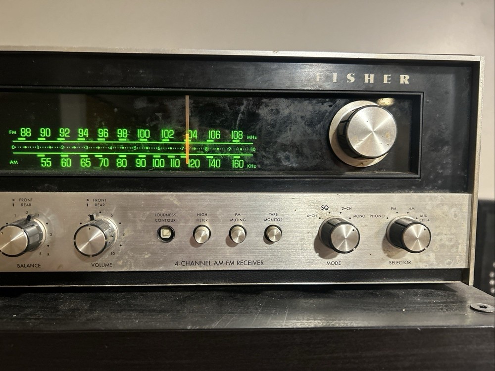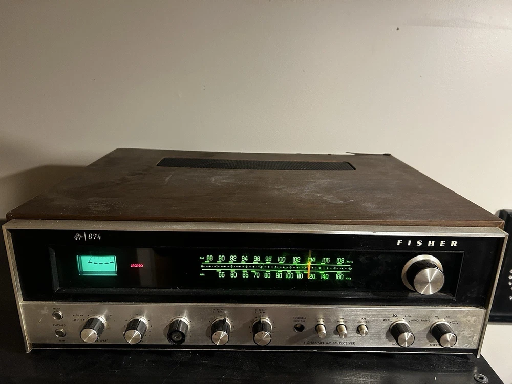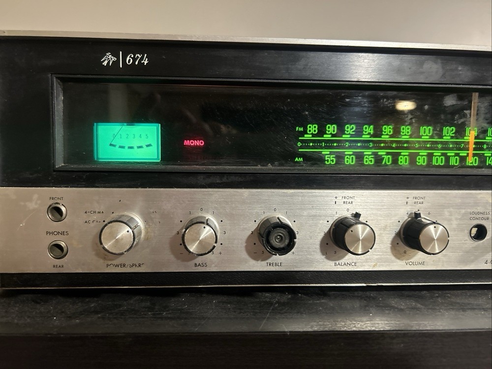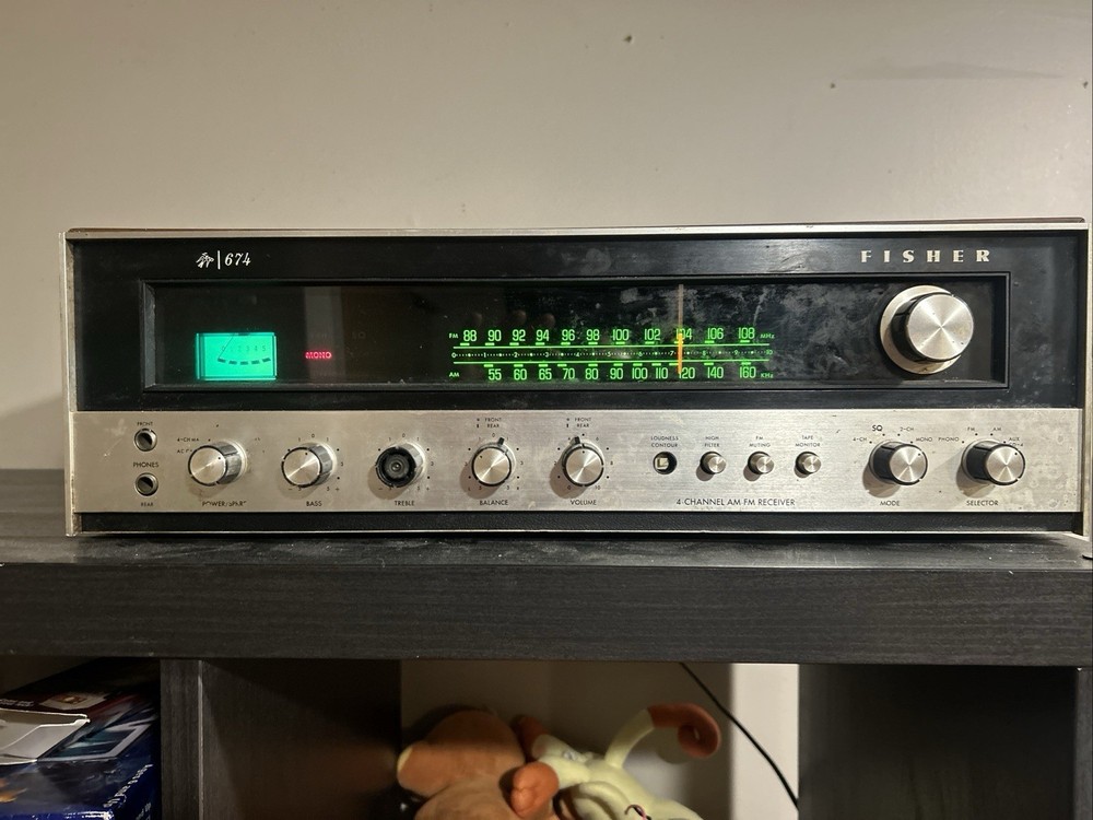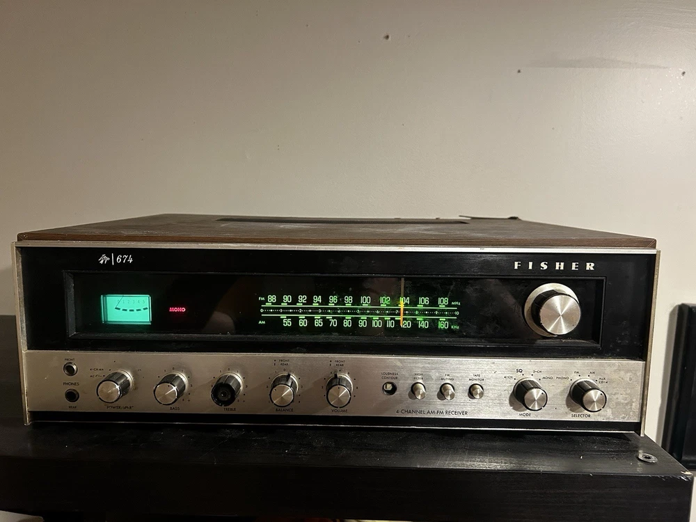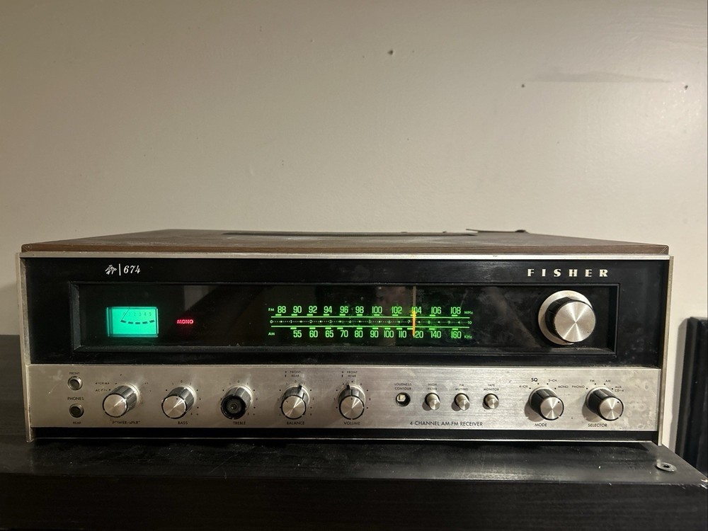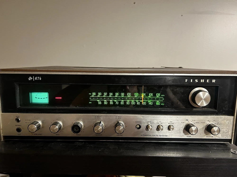 The Fisher 674 4-Ch AM FM Receiver is a vintage stereo receiver manufactured in Japan by Fisher. This model is known for its quality sound reproduction and durability, making it a sought-after piece for collectors and audio enthusiasts. With its classic design and functionality, this receiver is a great addition to any vintage audio setup, offering a glimpse into the past of consumer electronics.