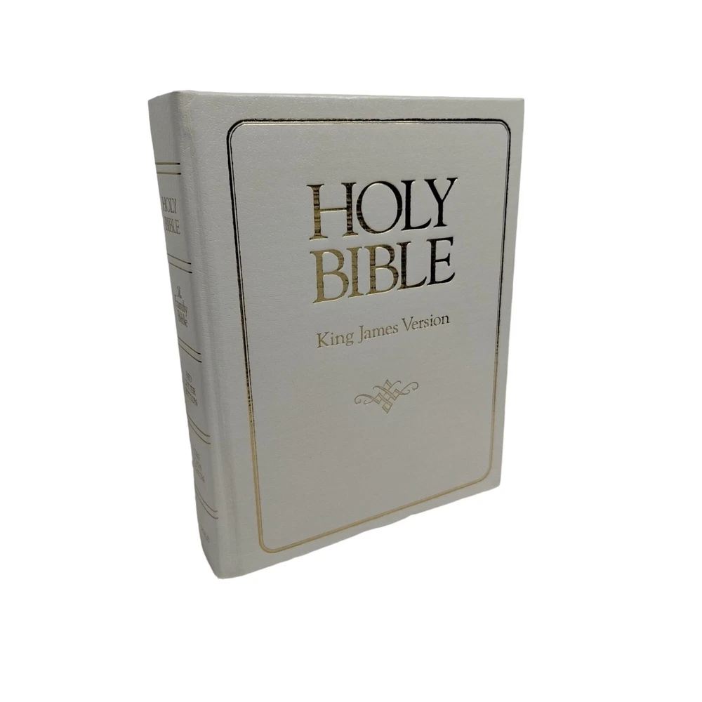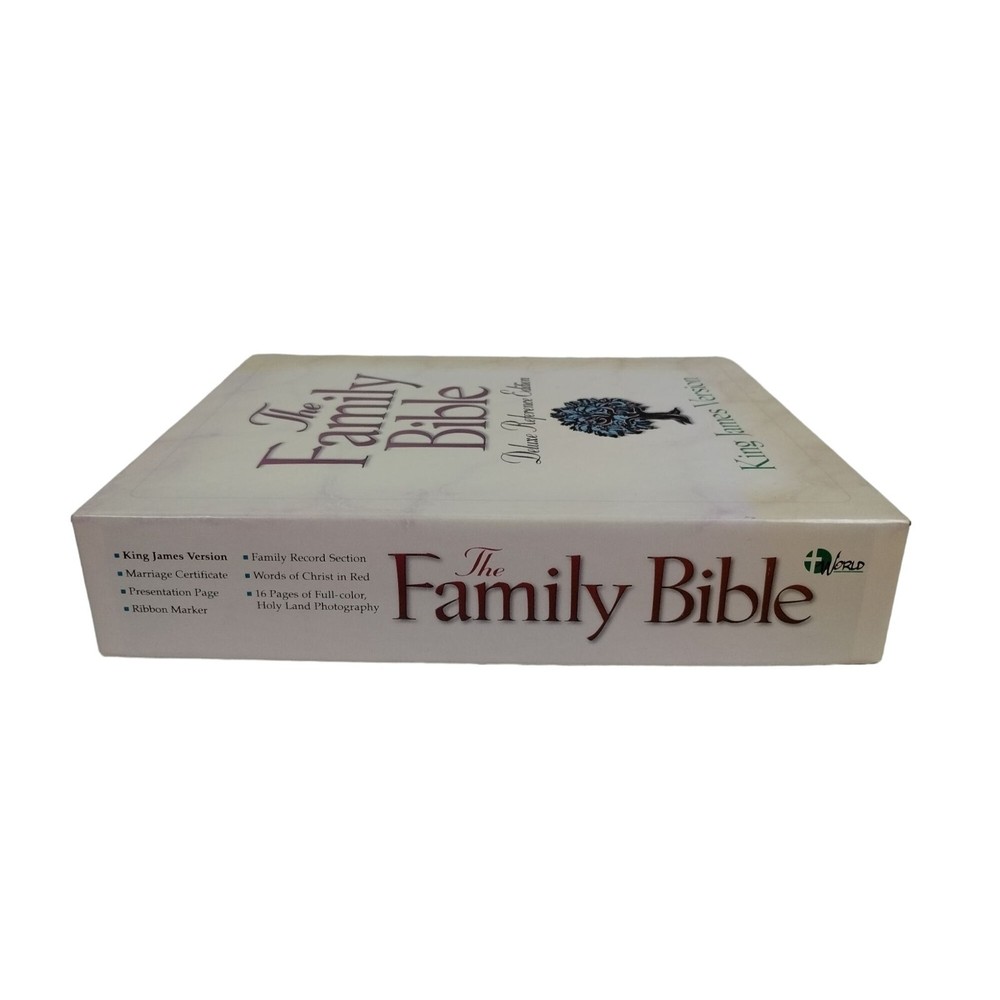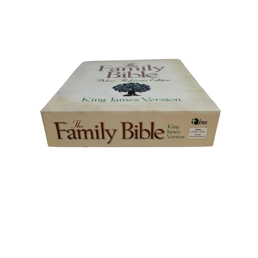 This deluxe family Bible in the King James Version features red lettering and is bound in white faux leather. It's a perfect centerpiece for religious study and family gatherings. • Deluxe family Bible • King James Version • Features red lettering • Bound in white faux leather • Ideal for religious study and family gatherings Features: • King James Version • Marriage Certificate • Presentation Page • Ribbon Marker • Family Record Section • King James Version Red Lettering • Words of Christ in Red • 16 Pages of Full Color Holy Land Photography Size: Family Bible Condition: New With Box