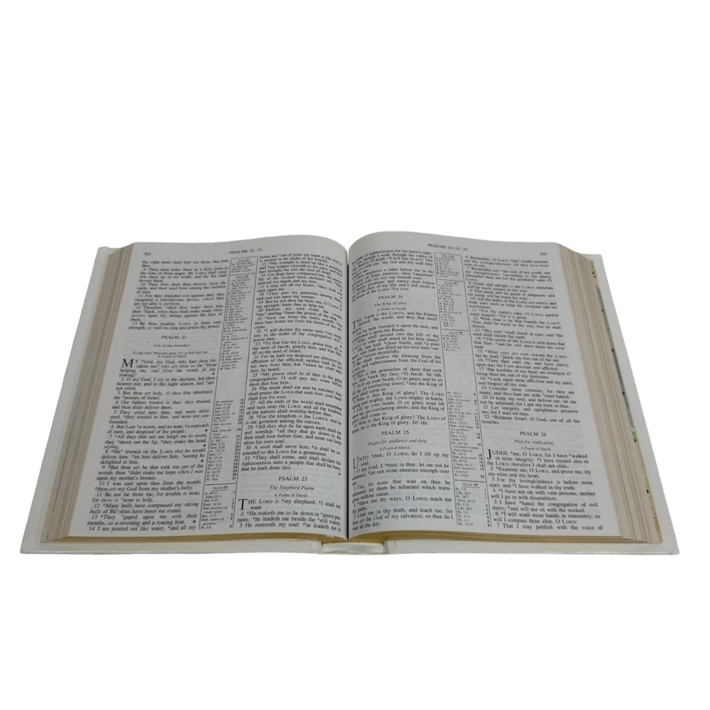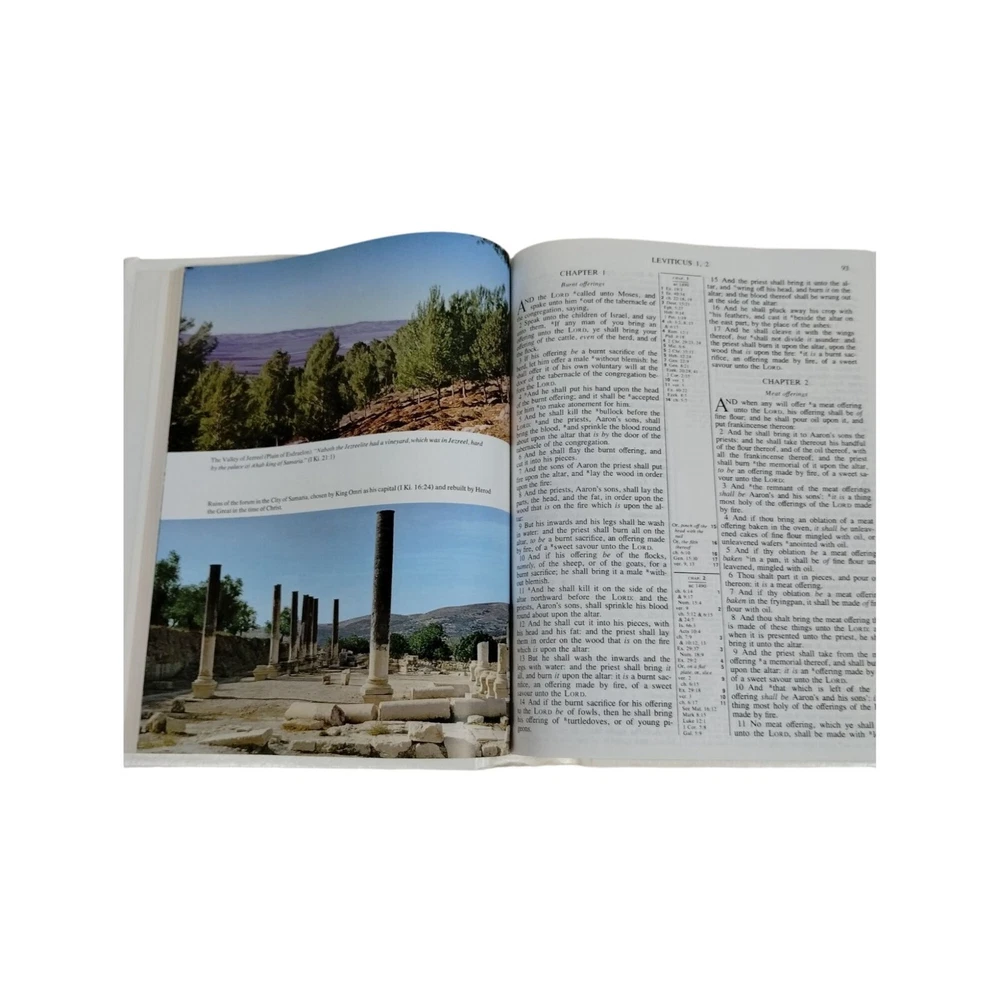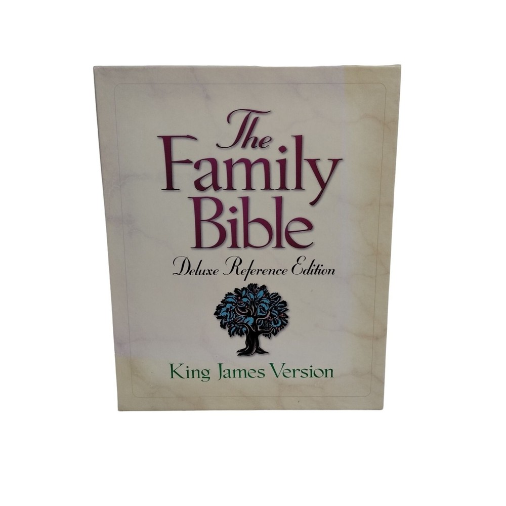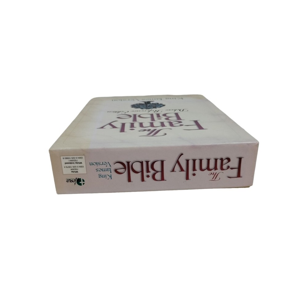 This deluxe family Bible in the King James Version features red lettering and is bound in white faux leather. It's a perfect centerpiece for religious study and family gatherings. • Deluxe family Bible • King James Version • Features red lettering • Bound in white faux leather • Ideal for religious study and family gatherings Features: • King James Version • Marriage Certificate • Presentation Page • Ribbon Marker • Family Record Section • King James Version Red Lettering • Words of Christ in Red • 16 Pages of Full Color Holy Land Photography Size: Family Bible Condition: New With Box
