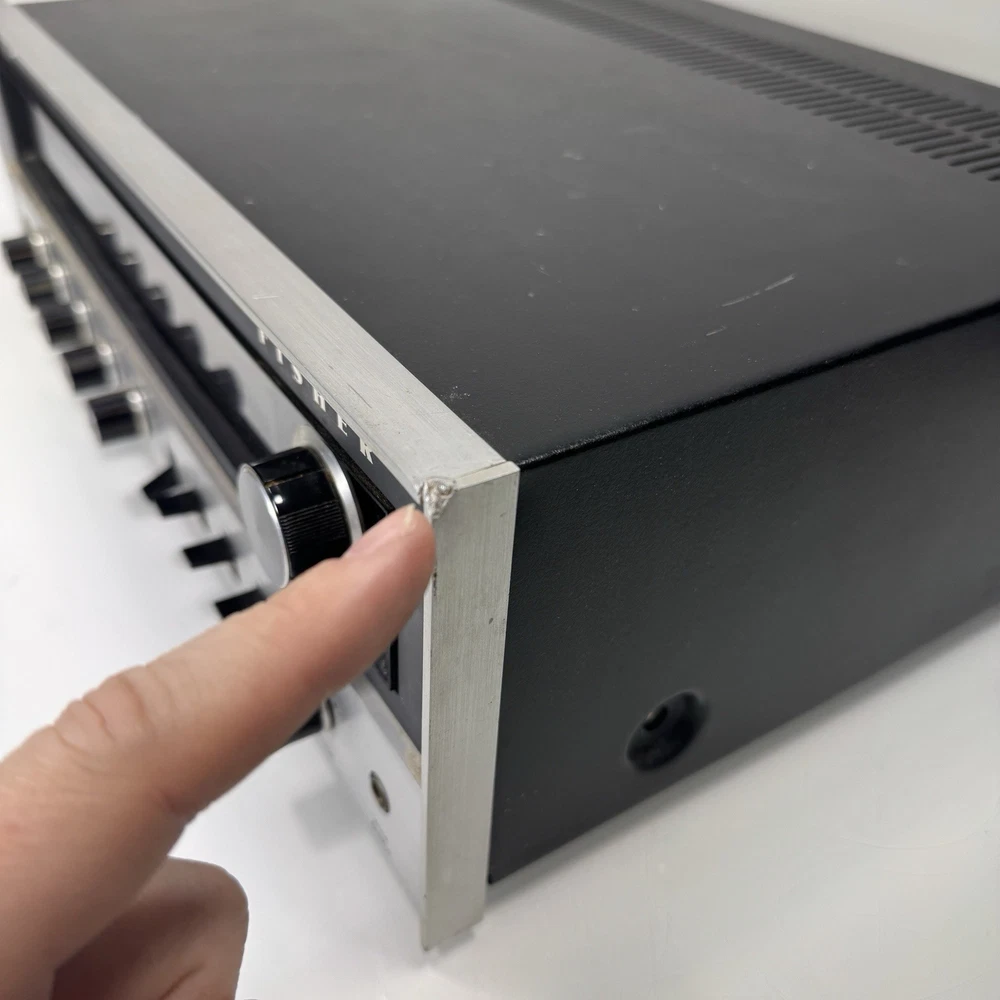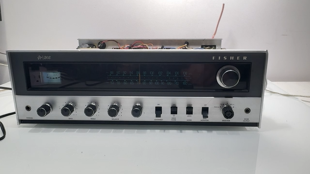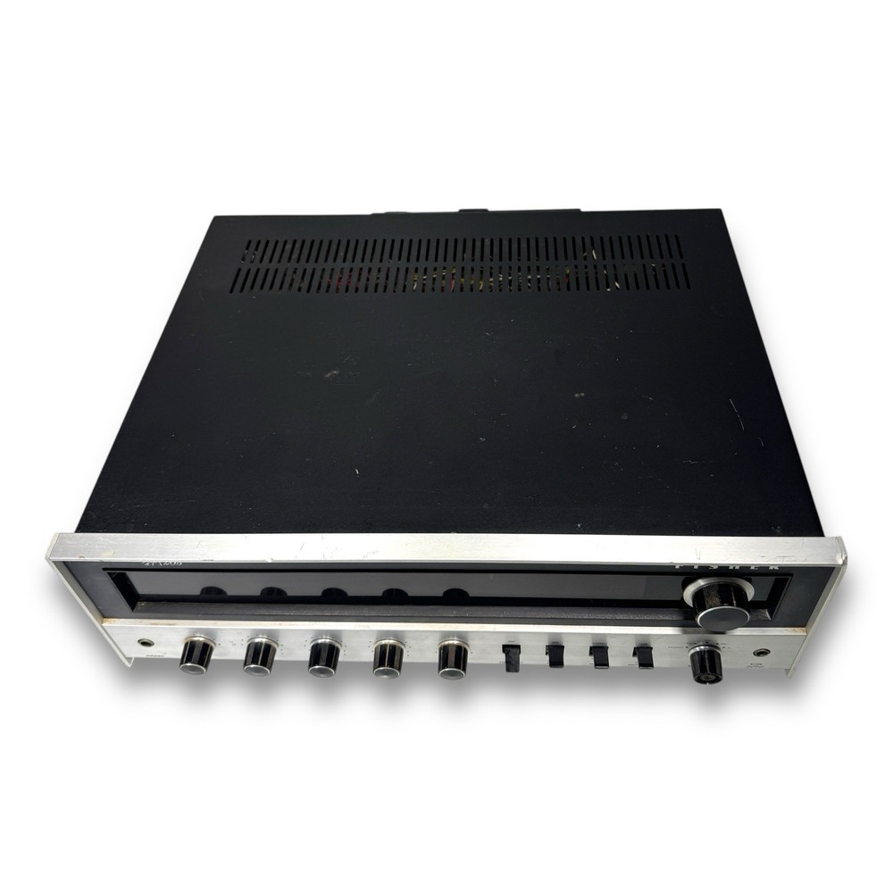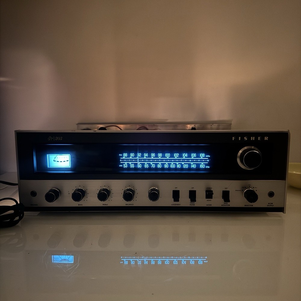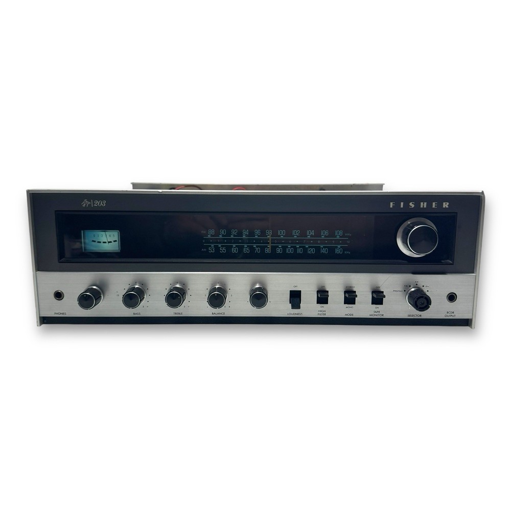 The Fisher 203 Stereo Receiver 30 WPC Turntable Ready Cleaned and Serviced Good overall condition - we have opened this unit up, Checked all the boards, banished the dust, cleaned the Pots, the Knobs, and shined up the Metal Face. No Electrical issues, we replaced a few of the lights, 1 on the signal meter, 5 along the Radio Dial, There is a set of lights for the tuning needle and the for the source selector. We did not replace those lights - they require a bit more surgery. Also the power/speaker selector is missing the writing around it, as well as the volume knob, and the source selector is starting to fade - see photos. ****updated 3/28/25***** Signal Lights replaced