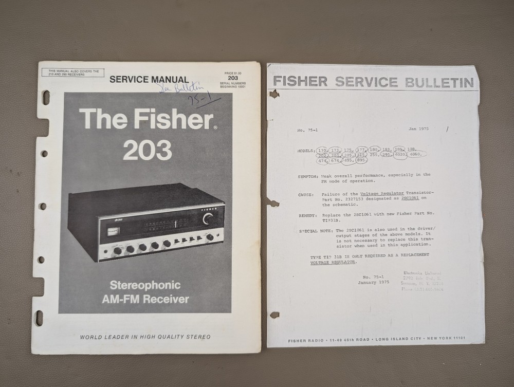 The Fisher 203 Stereophonic AM-FM Receiver Service Manual This manual/schematic is gently used and may have slight yellowing/patina. Corners and edges may have light wear, light bends. Professionally packaged between 2 cardboard stock sheets and placed inside of a plastic sleeve inside of mailer for effective protection in shipping. No P.O. boxes please!