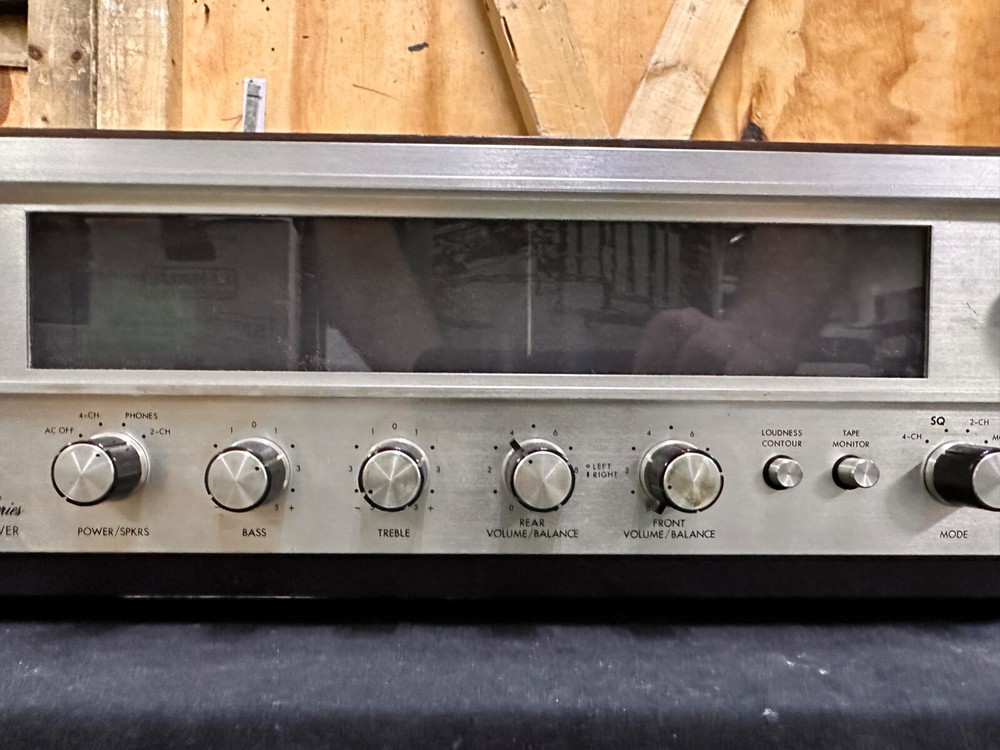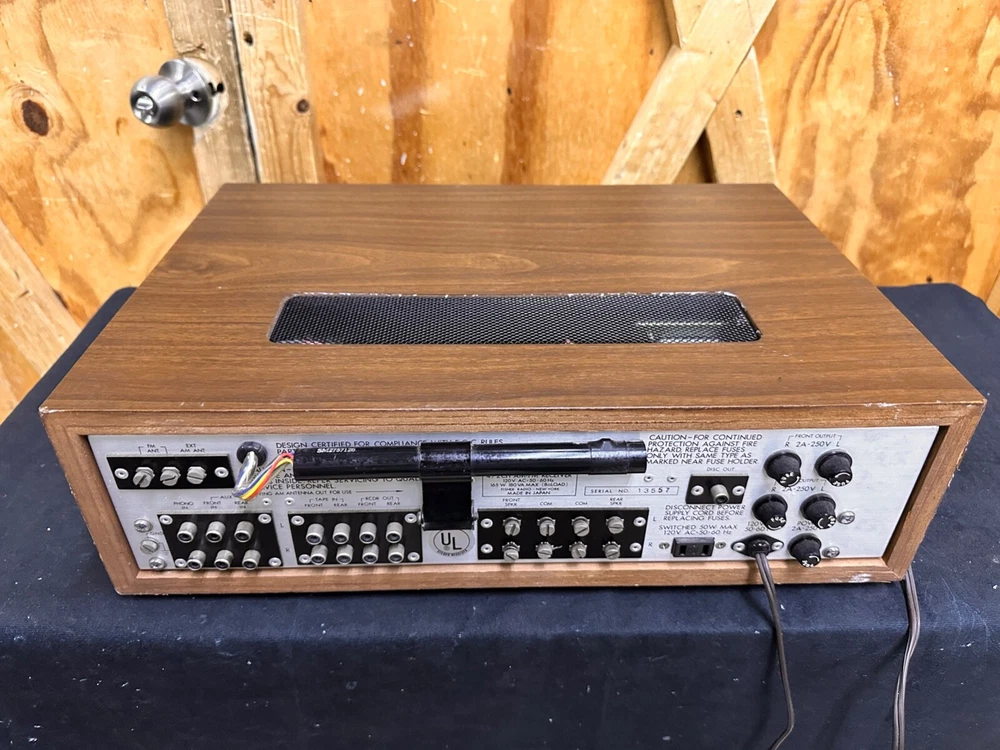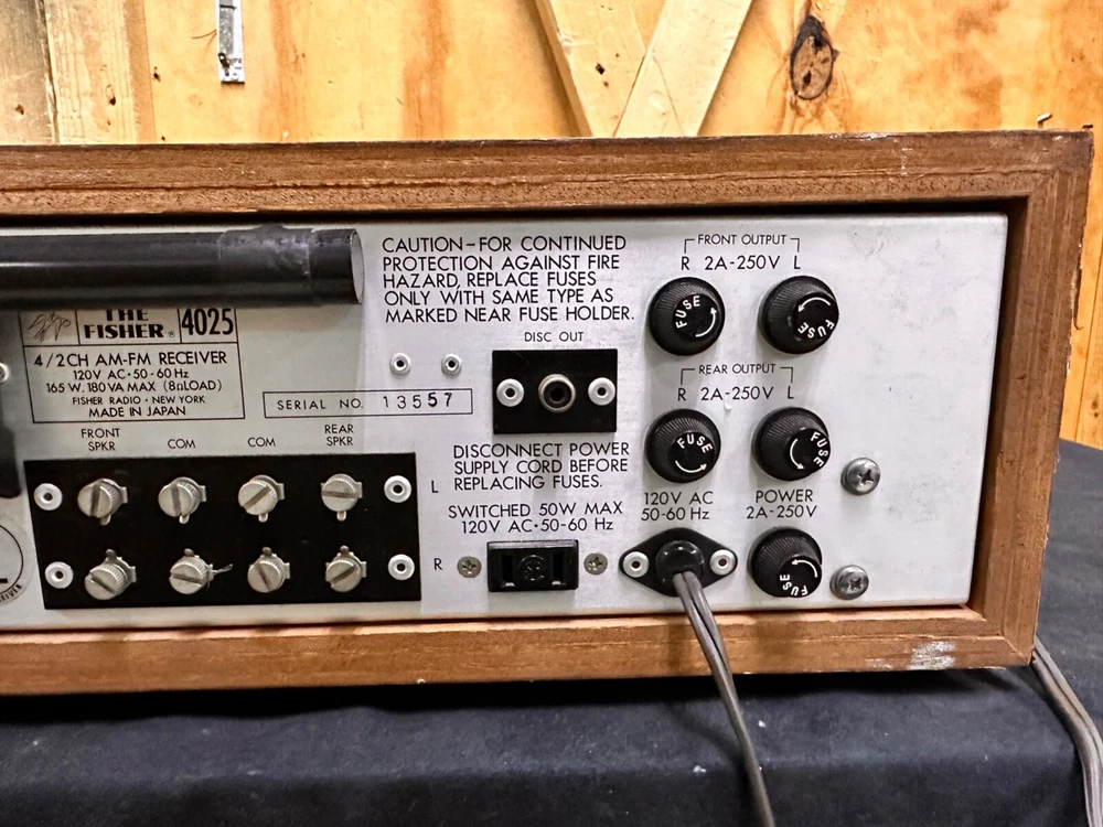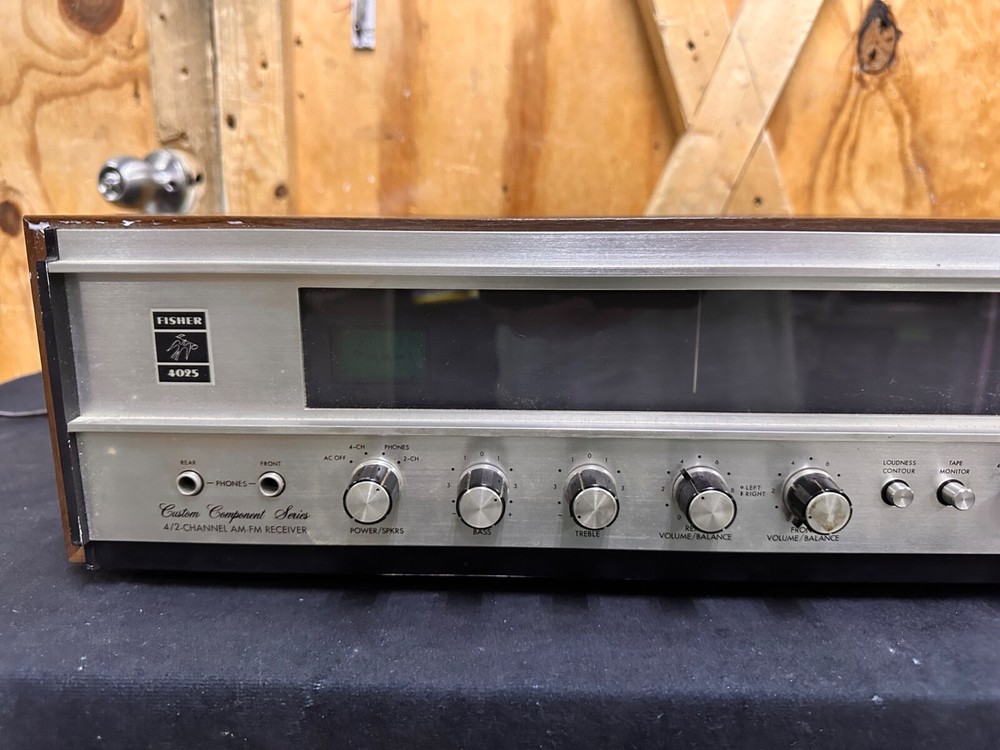 The Fisher 4025 4 / 2 Channel AM/FM Stereo Receiver - AS IS, Read Estate sale find. Unit powers on but all bulbs appear to be burnt out. Rear output right side 2A fuse is blown. Front speaker outputs are working, right side sounds great, left side seems a little distorted. Good project piece, needs a little TLC. Selling AS IS, as described. For parts / repair only. No returns. Listing is for The Fisher 4025 4 / 2 Channel AM/FM Stereo Receiver as pictured only. No other accessories included. GRAB IT WHILE YOU CAN! At New York Music Mall LLC, we strive to make sure our customers are totally satisfied with their buying experience. If for any reason you have any issue with your purchase, please contact us and we will get right back to you and work with you to resolve any problems. Please do not open any cases or claims without contacting us first. We will be able to resolve any problems directly and make sure that any issues are taken care of immediately. Our perfect feedback speaks for itself. THANK YOU FOR YOUR BUSINESS. WE APPRECIATE IT! Specifications Tuning range: FM, MW Frequency response: 20Hz to 20kHz Total harmonic distortion: 1% Input sensitivity: 2.5mV (MM), 200mV (line) Output: 200mV (line) Year: 1974 Track Page Views With Auctiva's Counter
