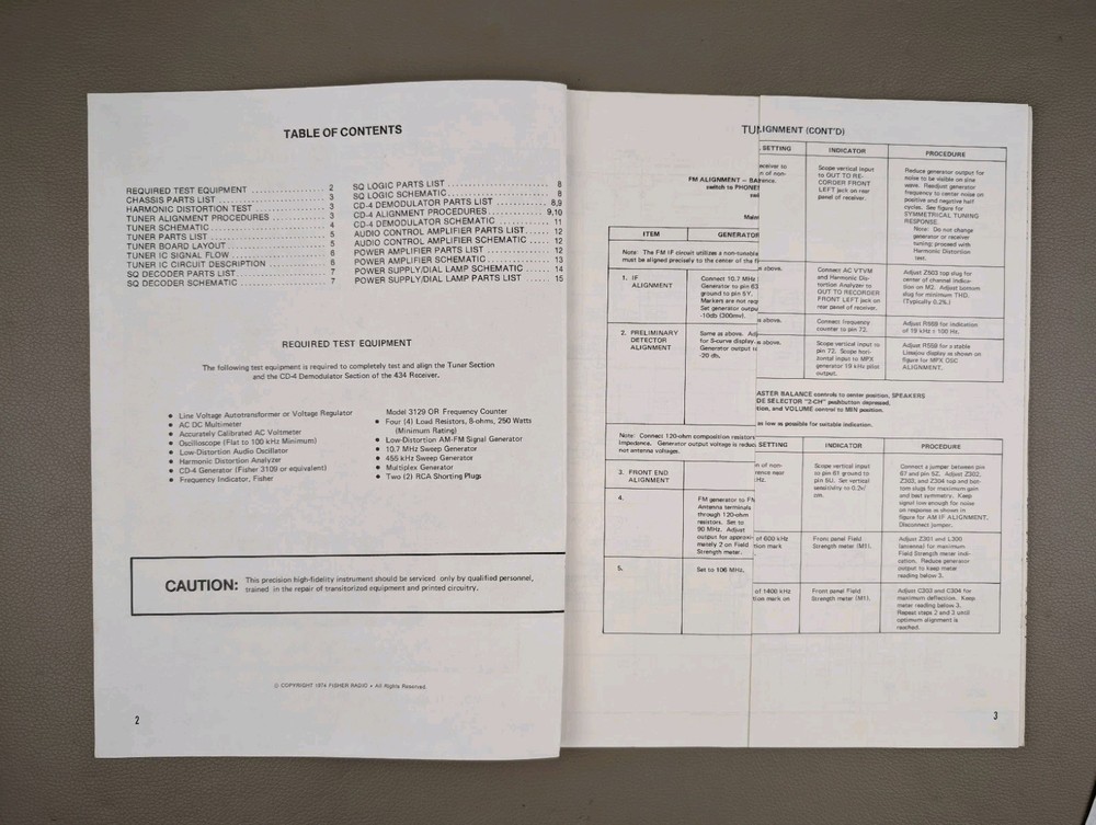 The Fisher 434 4/2-channel Stereo Receiver Service Manual This manual/schematic is gently used and may have slight yellowing/patina. Corners and edges may have light wear, light bends. Professionally packaged between 2 cardboard stock sheets and placed inside of a plastic sleeve inside of mailer for effective protection in shipping. No P.O. boxes please!