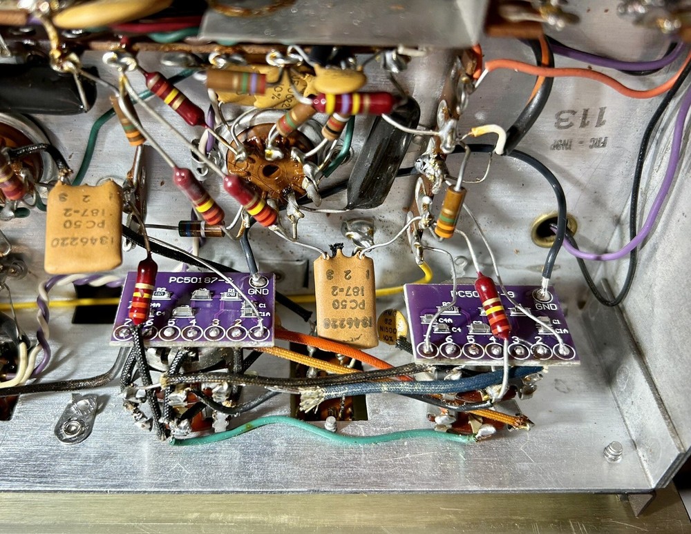 An instant upgrade or replacement for the printed electronic circuit used for tone control compensation in your Fisher tube gear. This listing is for 2 boards, there are two per stereo receiver, preamp or integrated amplifier. You will receive two with one purchase . This model PEC is specifically used in lots of Fisher gear, including the 500C, 500B, 800C, 800B, 400 receiver, X100-B, X101-C, X101-D, X202-C, Custom Electra IV Console, Philharmonic V Console and perhaps many other Fisher integrated amplifiers and consoles. The sound improvement is immediately noticeable. You will have enhanced clarity and openness. The components on this board are the same values and arrangement as appearing on the schematic, so no modifications to the original sound. Where the improvement happens is that these new components are miniature 2% tight tolerance film capacitors and 1% tight tolerance resistors. The original units used ceramic capacitor construction and resistor tolerances were much looser than 1%. Installation is easy, just snip the leads from the original part, insert the leads into the numbered holes and solder. There is also a ground plane built into the new part for additional shielding. A ground wire to the chassis ground shall be soldered into this hole I am showing in pictures, these boards installed in my 500B receiver. They are shown alongside the PEC’s they replace, as well as the receiver before the replacement. I thought the receiver sounded great previously, but installing these had woke this receiver up, every aspect that I thought sounded good in this receiver just immediately sounded better when these were installed.