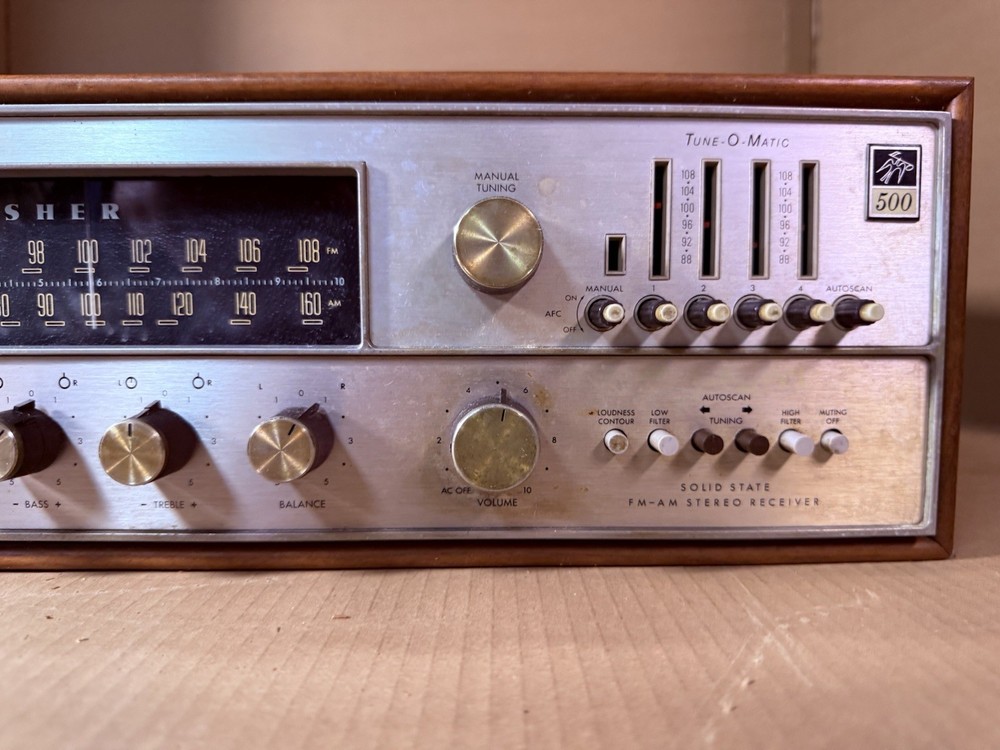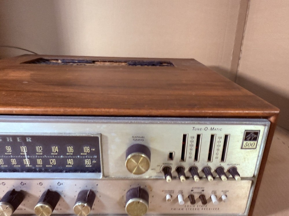 The Fisher 500-TX Stereo Receiver Auto Tune-O-Matic Solid State Selling As is, no returns . Tested, powers up (pls see pic 1 + 2). I tested connecting speakers and using the tuner and getting sound , which I have a video of, (I tried including it in the post but cannot, pls msg me if you’d like me to send the video). Please see all pictures for condition. Normal wear given its age. Outer cabinet has areas where it is peeling and may need some easy handling (pls see pics 7, 8, 9). All dials seem to move fine but given its age it will need some tuning up. Item will be shipped USPS Ground Advantage which only comes with $100 insurance. The shipping charge covers the extra insurance for the buy it now price ($579) and additional charge for the required signature on delivery. Insurance does not cover the shipping charge. I will only ship insured and with a signature required. I only ship within the U.S,, I do not ship to P.O. Boxes. I do not ship to HAWAII , ALASKA , PUERTO RICO , VIRGIN ISLAND , PO BOX OR APO ADDRESS. Please feel free to message me with any questions or for more pictures. Thanks.