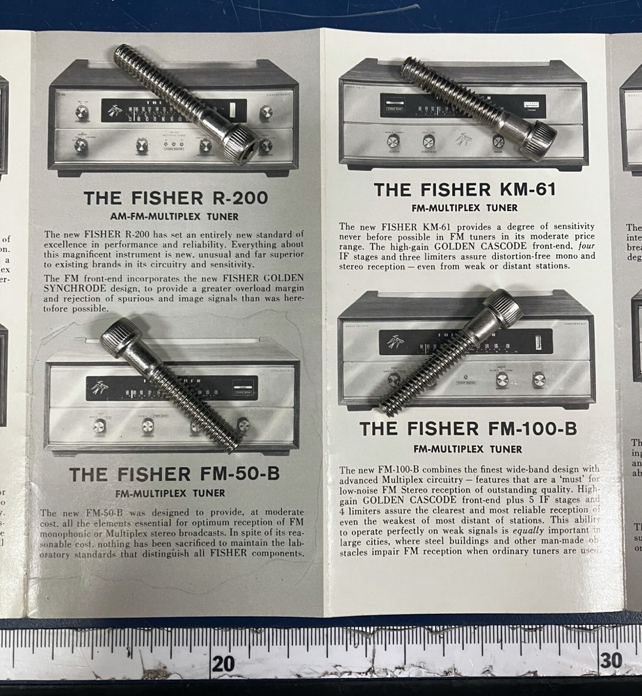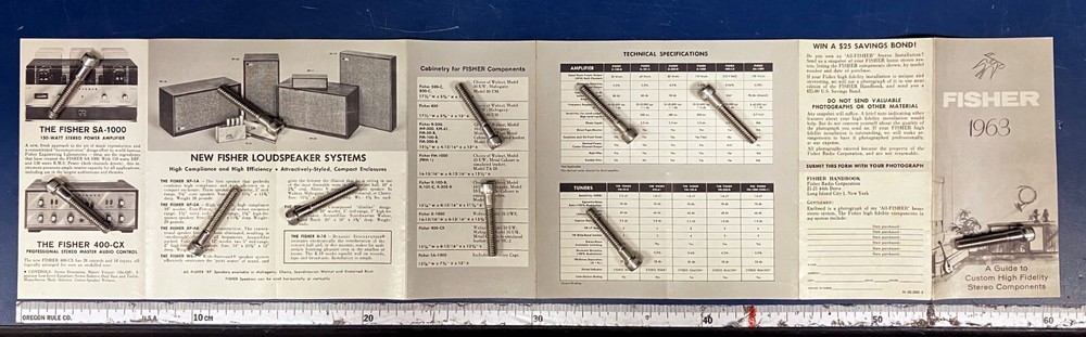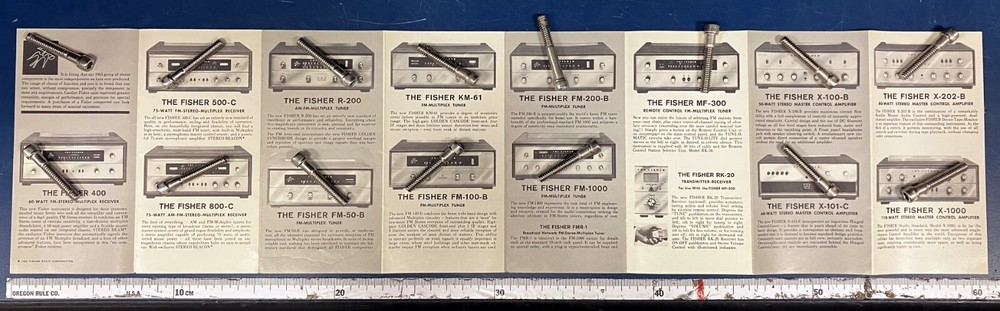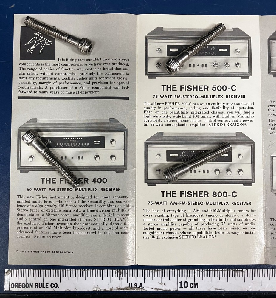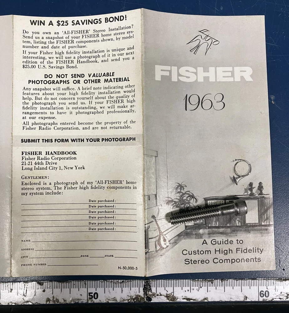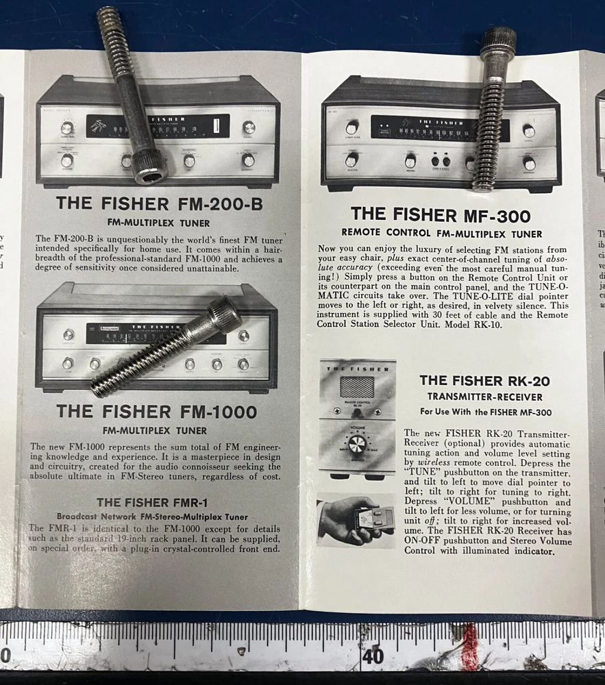 The Fisher 1963 Catalog "A Guide to Custom High Fidelity Stereo Components" is a vintage brochure that provides detailed information on custom high fidelity stereo components from the Fisher brand. This guide is a valuable resource for vintage audio enthusiasts looking to enhance their stereo systems with high-quality, unique components. With a focus on consumer electronics, this catalog ad offers a glimpse into the world of vintage audio technology and provides insights on how to create a customized and immersive listening experience. This item is in good condition. The ruler in the photos is in metric units and please note that the folded brochure is 'pocket sized'. The screws in the photos are not included. The item will be shipped in a small box to prevent any damage.