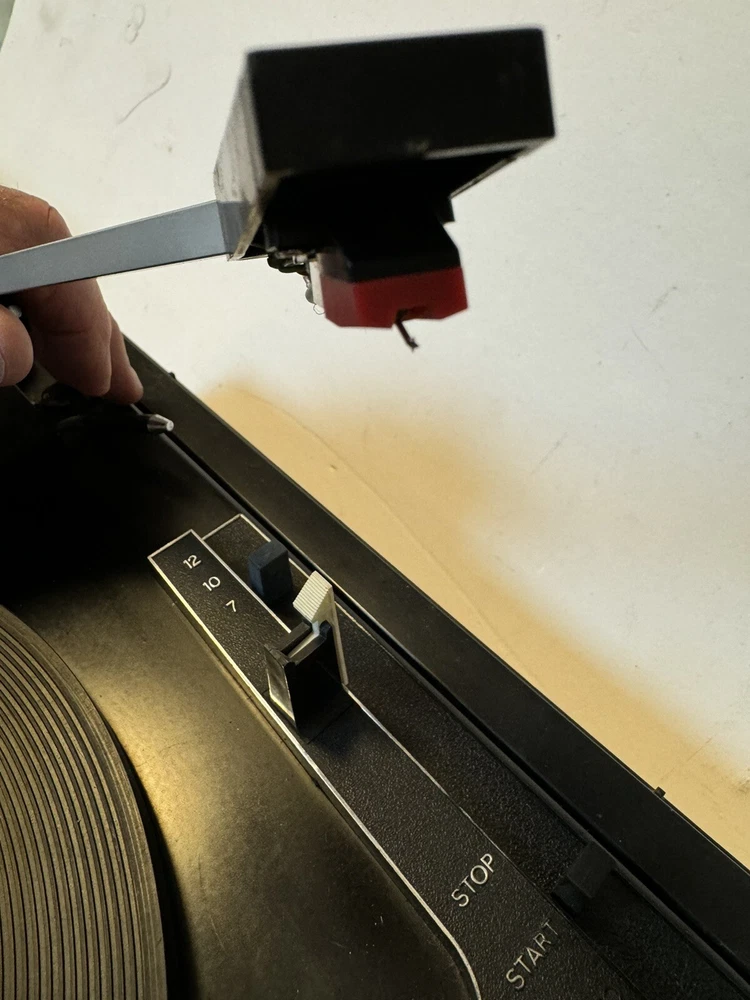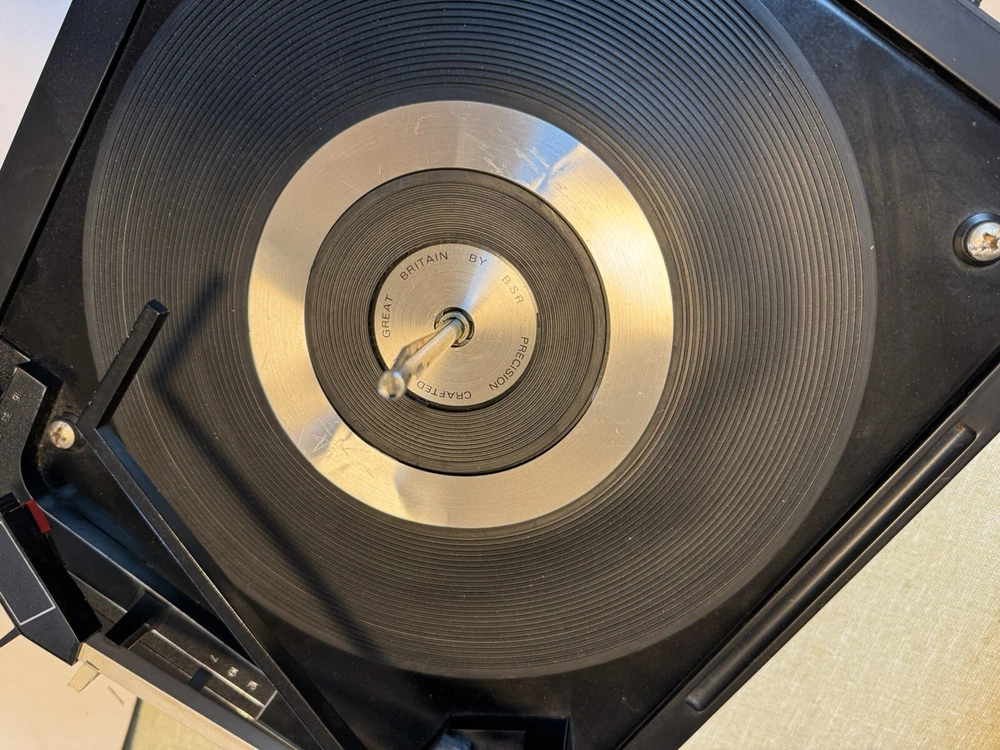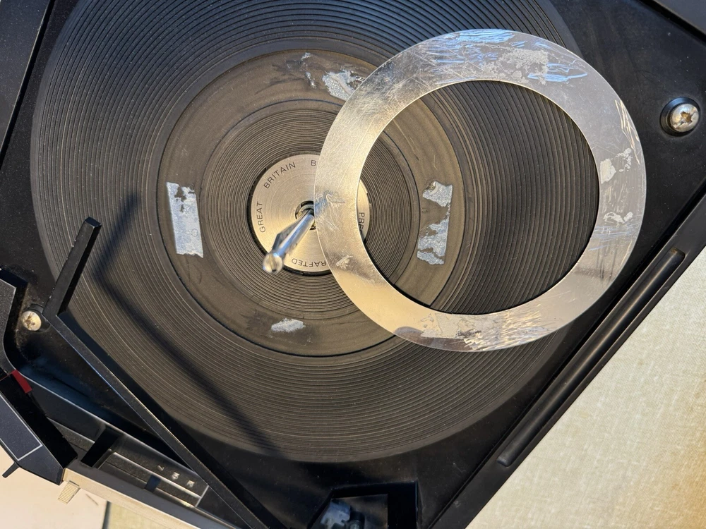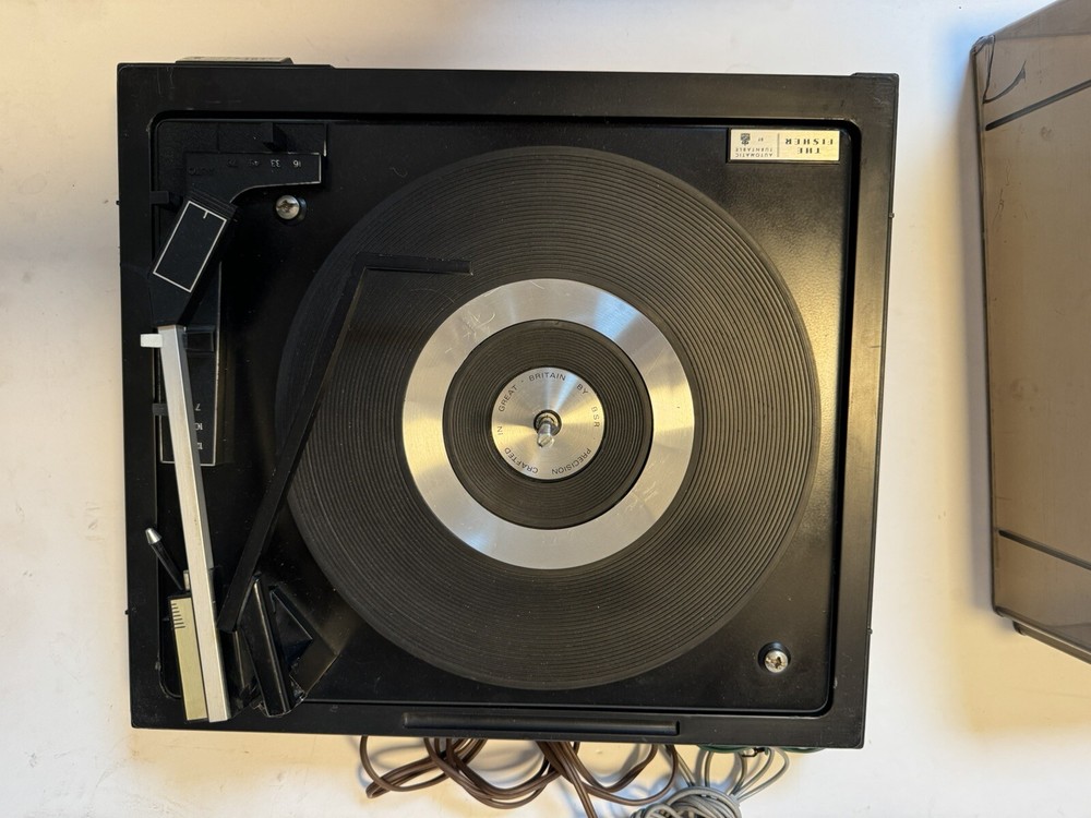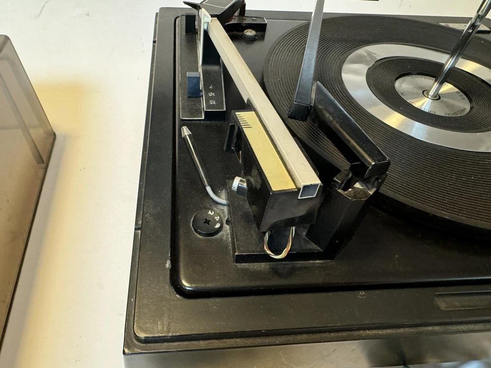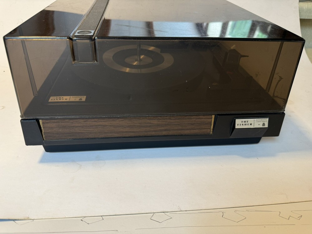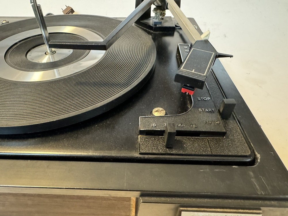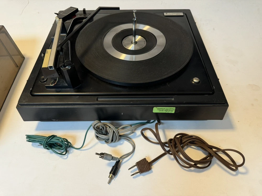 Powers on. Automatic and all speeds work. Probably needs to be re greased. Sold as is. Please note photos of cover and two damaged cracks. Note: chrome ring in center of turntable needs double stick tape to reapply. Priced to sell. No returns.