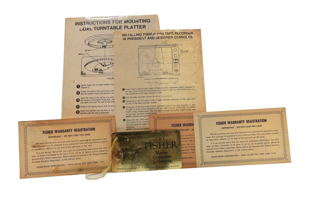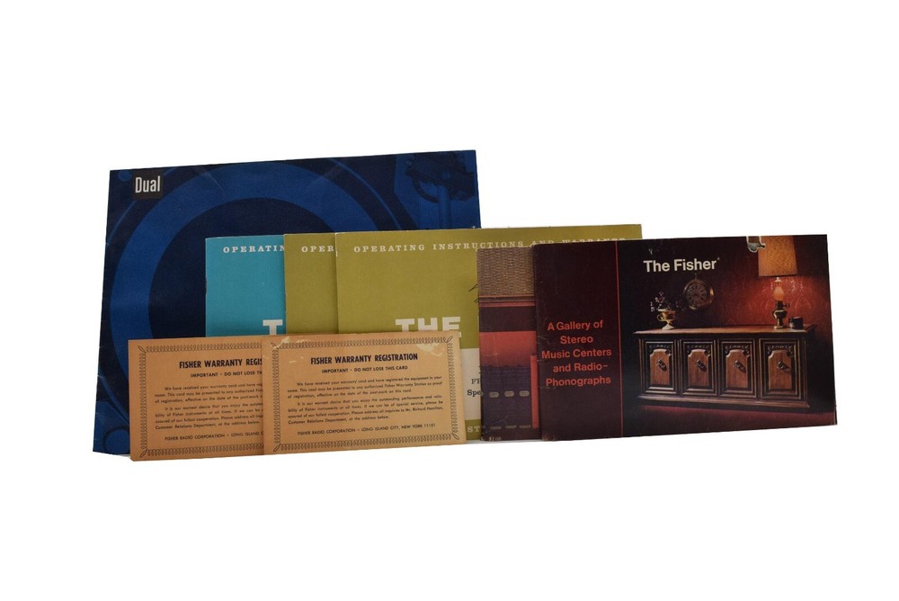 The Fisher Executive Owners Operator Manuals Stereo Phonograph Warranty Cards. All the manuals look to be in very good condition. I only see one of them (973 Manual) has some damaged edges. Looks like there are the original manuals, Warranty Cars and more, please see images.