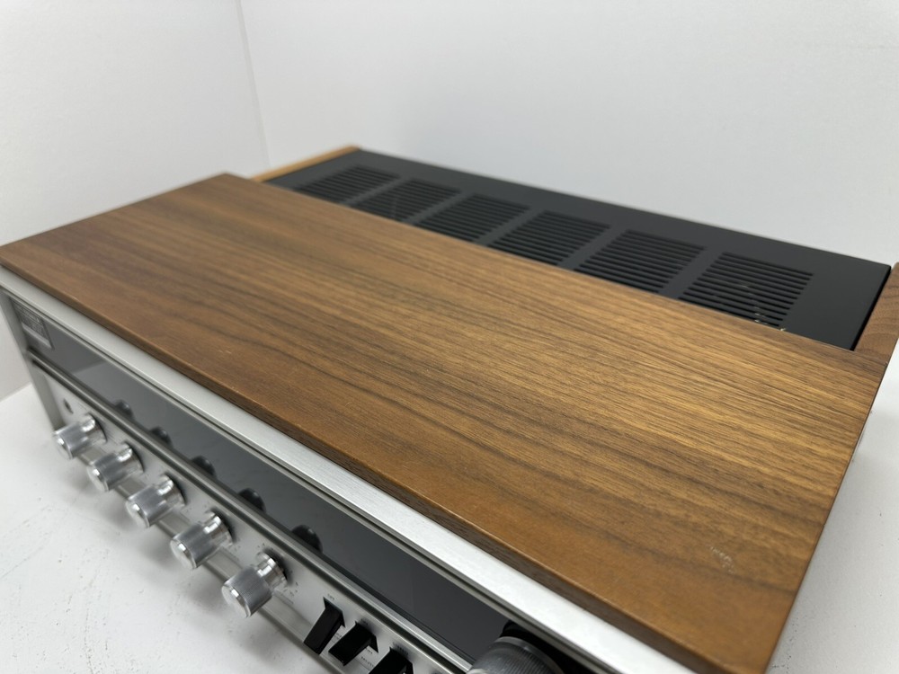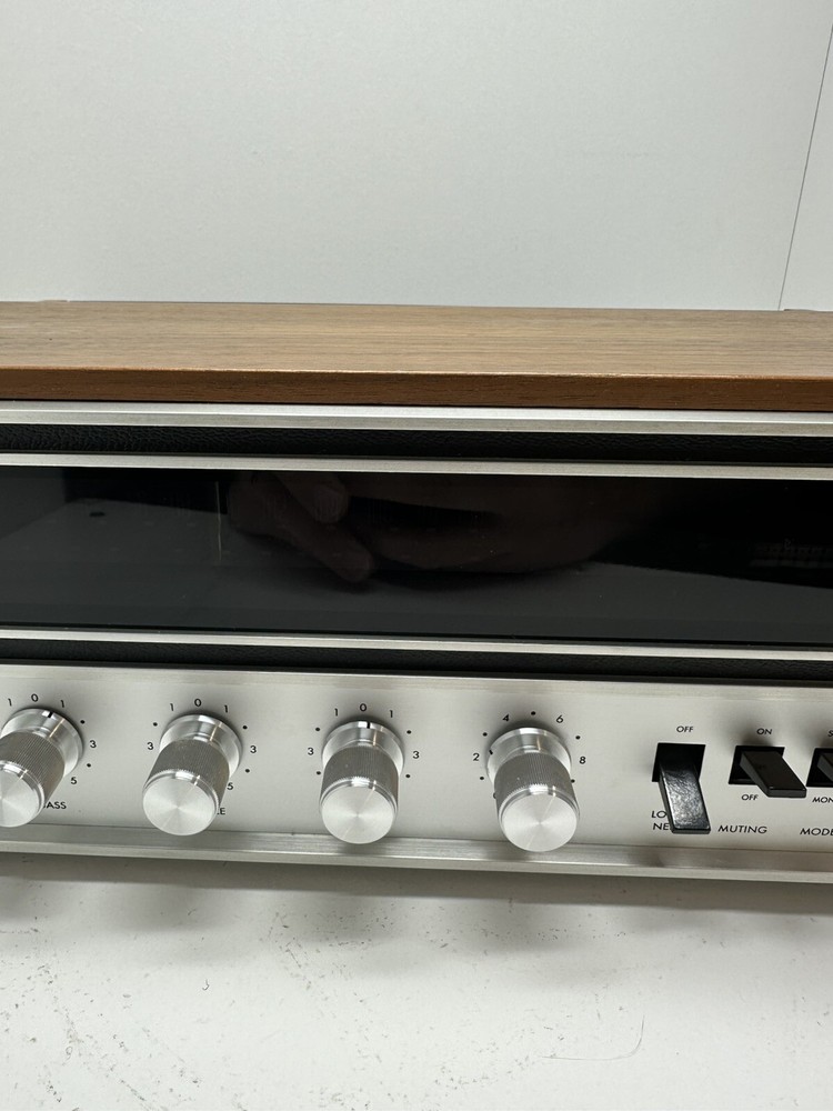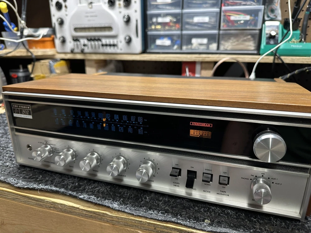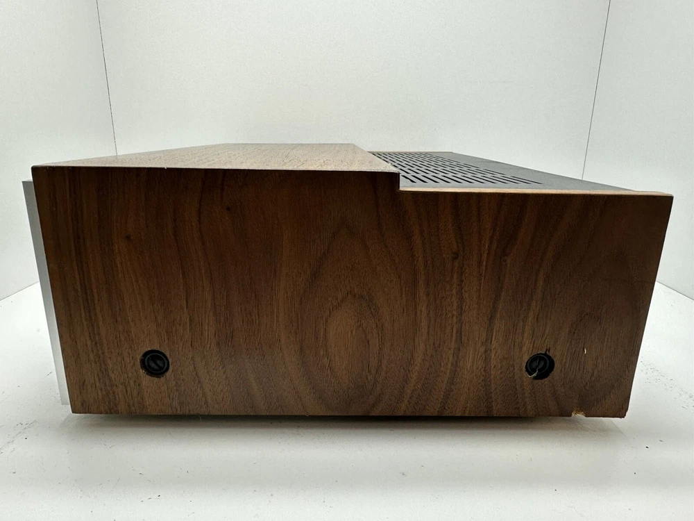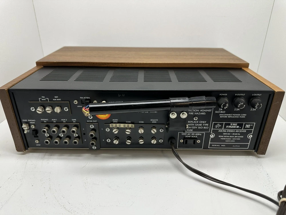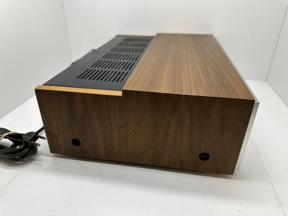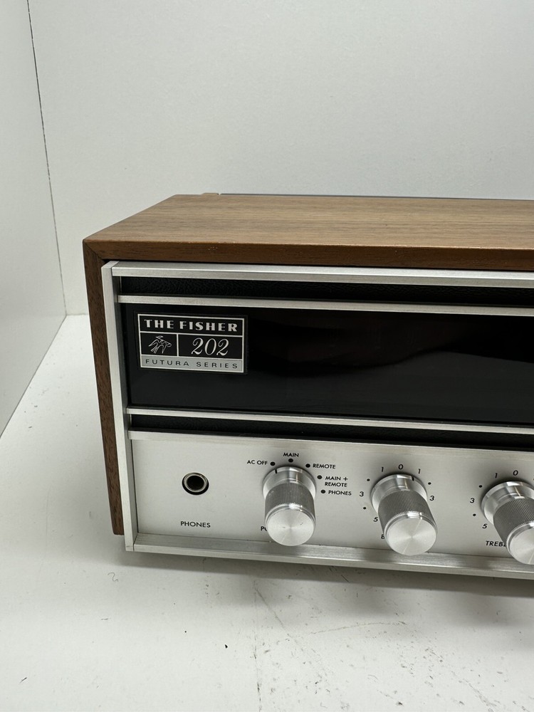 This thing has got no business sounding this good!! The Fisher 202 Futura was the last great Fisher, produced by Hitachi in Japan under close oversight by Avery Fisher. This stunning example is very very clean and wearing its original, optional and rare wood cabinet. All controls cleaned and lubricated Bias and DC offset adjusted Replace lamps with new Incandescent lamps Works and sounds fantastic Will be packaged properly for shipping.