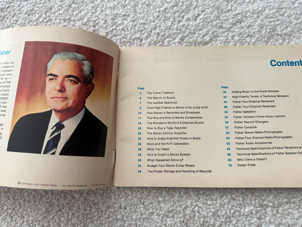 73 Page full product guide from Fisher for 1971. Excellent information about both general high fidelity systems, as well as the offerings from Fisher for that year. Avery Fisher and the Fisher company advanced the collective knowledge among consumers about high fidelity while advancing their own technology to meet the increasing demands for better music generating audio systems in the 60's and 70's. This catalog and glossary of terms is an great example of that contribution. Great coffee table exhibit and reading for the Fisher and Audio Collector to have. The pictures are part of the description. Be aware vintage print materials, paper and ink may have odor. SHIPPING: I typically ship same or next day. Packing and shipping is expensive, and I am not Amazon Prime, so shipping is not free. BEFORE YOU BUY, READ CAREFULLY: Selling AS IS. No Warranty is expressed or implied. NO Returns or refunds for any reason. No after-sale support is implied or offered.