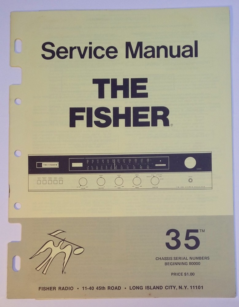 Vintage Electronic Catalogs The Fisher Model 35 Service Manual, AM/FM Stereo Receiver Chassis Serial #s Beginning 80000 Issued in 1970 by Fisher Radio Corporation, ~16 pp, 5 pull-outs Original Publication Not a Reprint or electronic copy! Manual Measures: 11 by 8.5 inches. Total weight with safe packing is 8 Ounces Condition: Very Good Minus - Clean flat and complete with light pile dirt to back cover - content bright and clean no marks, rips, tears, or writing. Staples partially discolored We will be listing a large number of Vintage Electronics Catalogs and publications that come from a lifetime collection. The previous owner was an Electronics Technican from age 15 to 81.. 66 astounding active years in the field! Factory trained by an Astounding 62 total Companies! He worked for numerous companies as well as for himself and repaired anything and everything you can imagine, from TVs and Radios to business computers and Government speciality electronics. His collection dated from Pre-World War Two items to the early 2000s, A vast accumulation of Knowledge! Default shipping in USA is First Class, International will First Class International Watch for many more Pro and Vintage Audio auctions in the very near future! We accept paypal only.