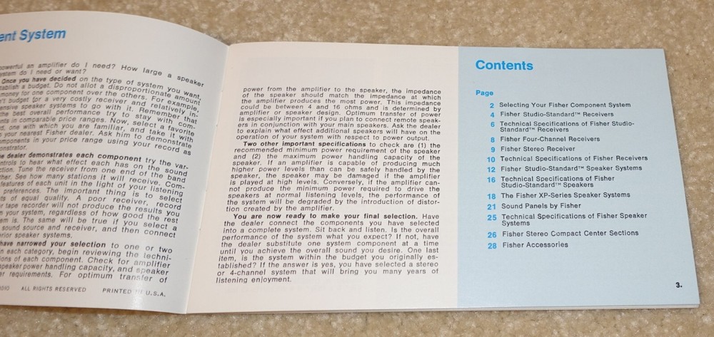 This listing is for 1 Vintage FISHER 31 Page Booklet from 1973 in very nice condition. Covers 4 channel and 2 channel stereophonic receivers, Specifications, speakers, sound panels, technical specs, compact center sections, and Fisher accessories. Confirmed Delivery Ground Advantage US Mail Shipping is FREE for this listing. I will make sure it is protected for shipping.